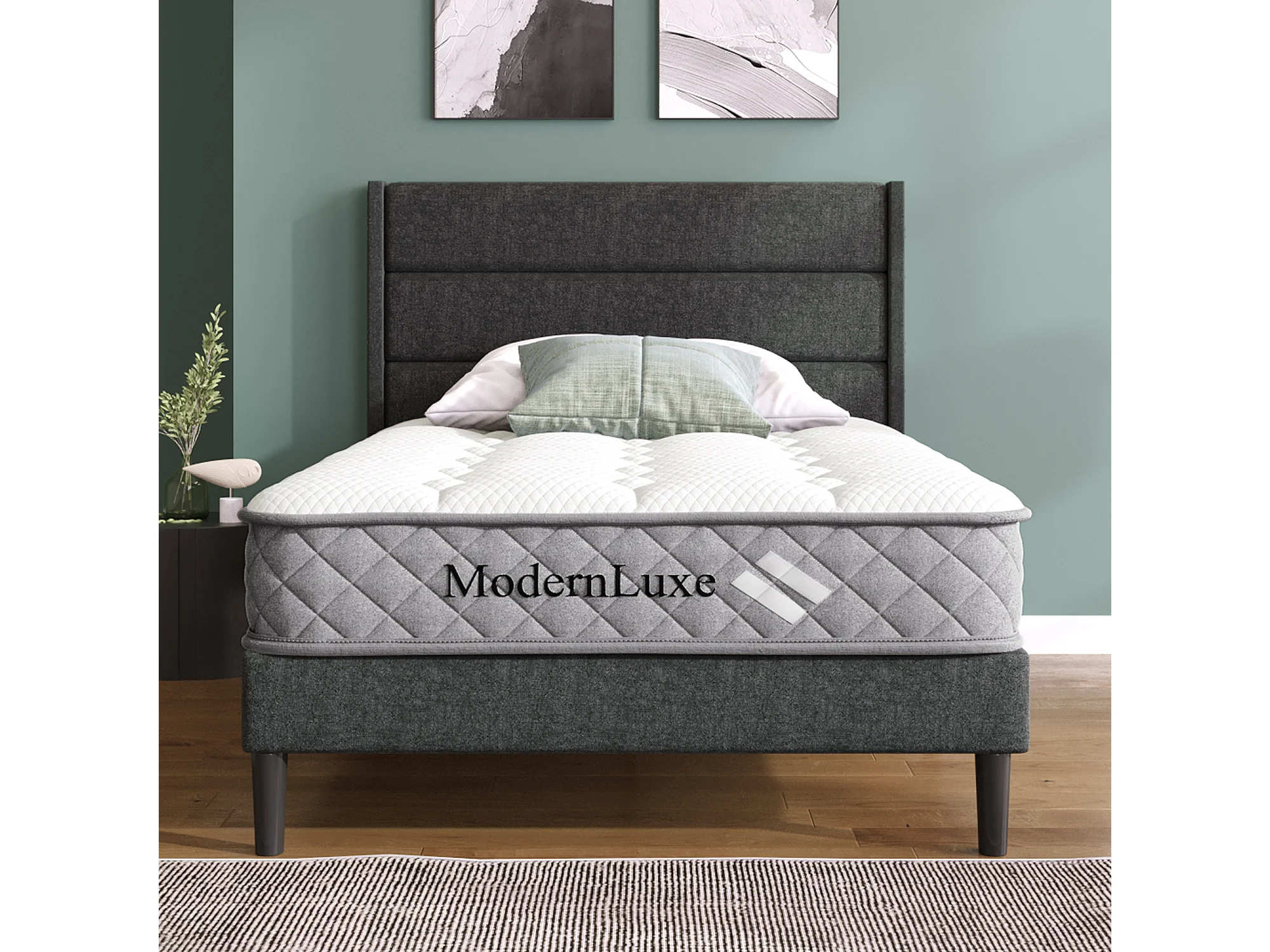 Lit rembourré simple 90x200 cm, tête et sommier inclus, cadre lin gris, design moderne, jeunesse, avec matelas