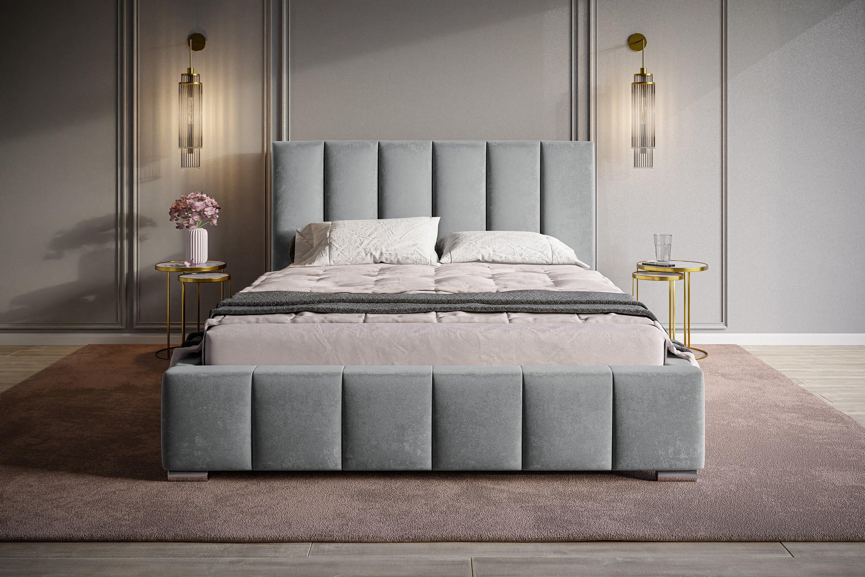 Lit rembourré Tokio avec tête de lit, 120x200 cm, lit double avec coffre de rangement et sommier à lattes en bois, tissu velours, couleur : gris