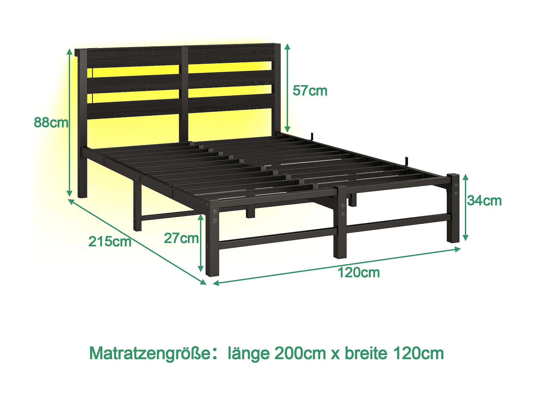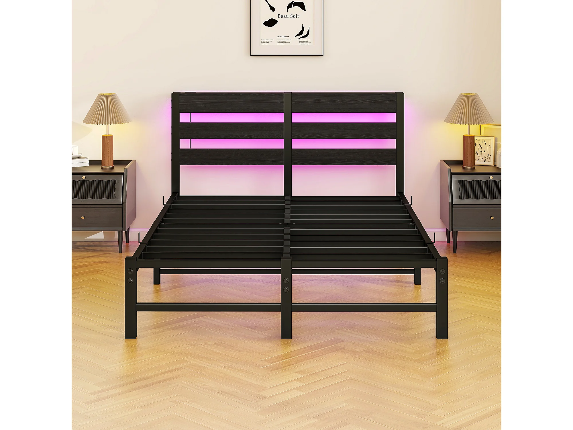 Lit simple 120x200cm avec LED et USB - Lit adulte en métal noir et bois (sans matelas)