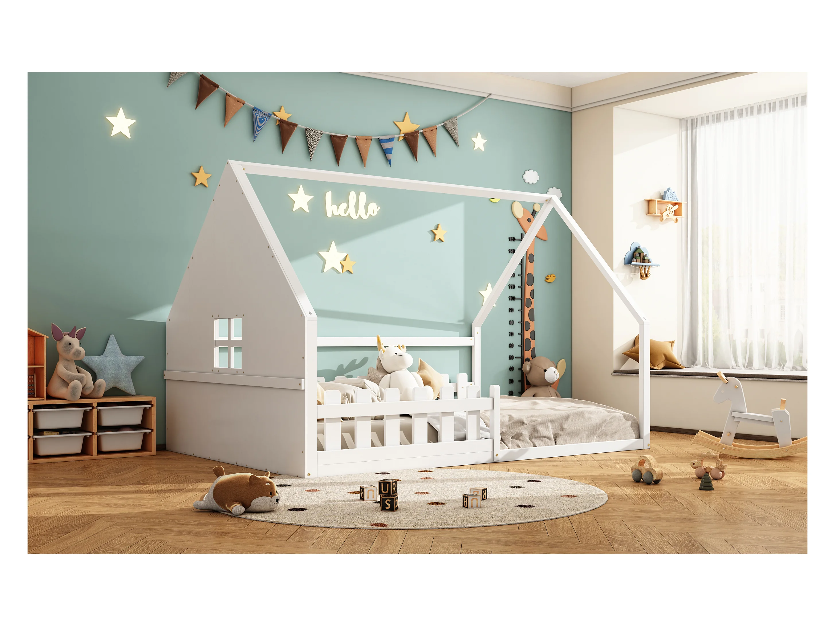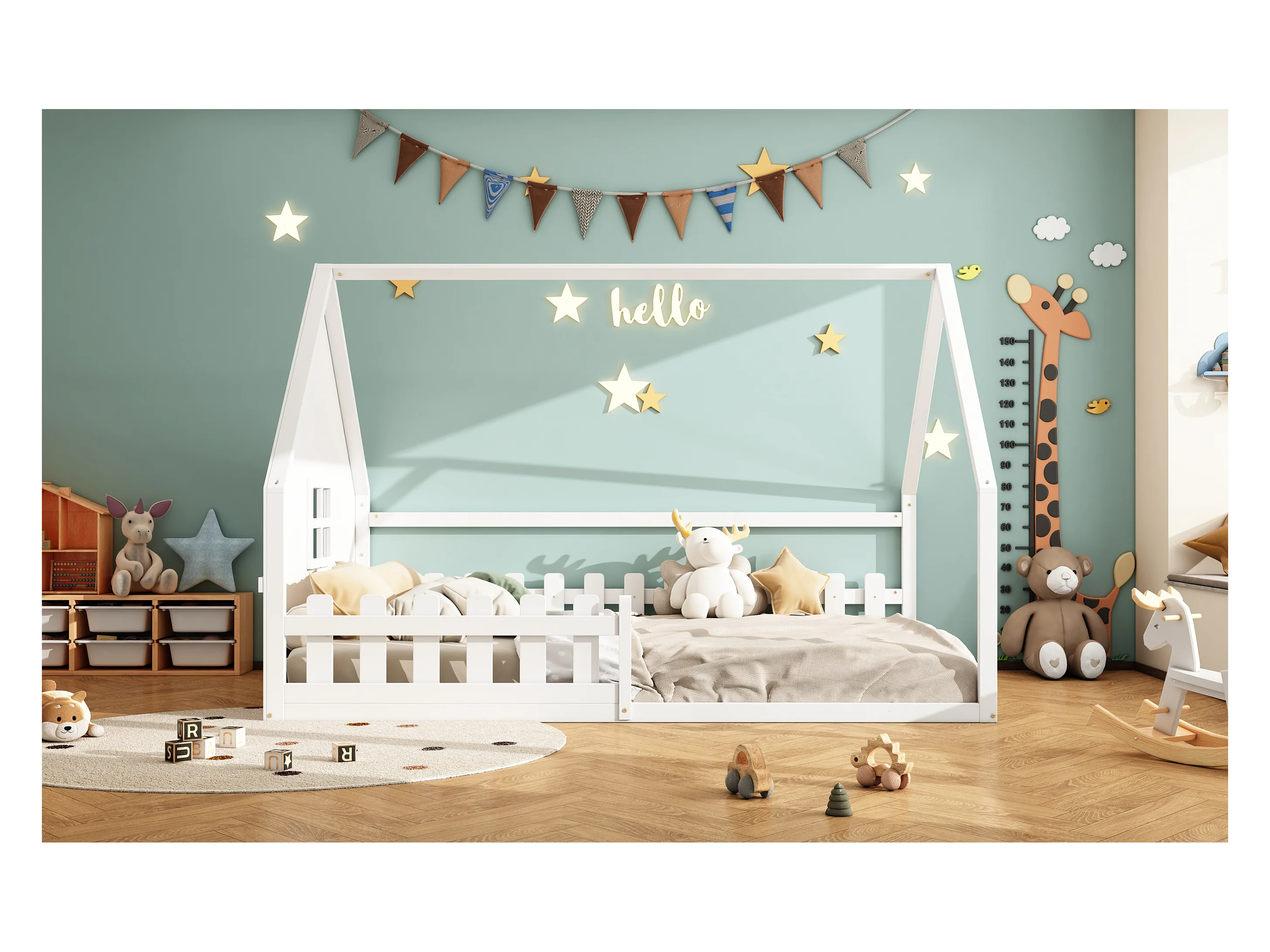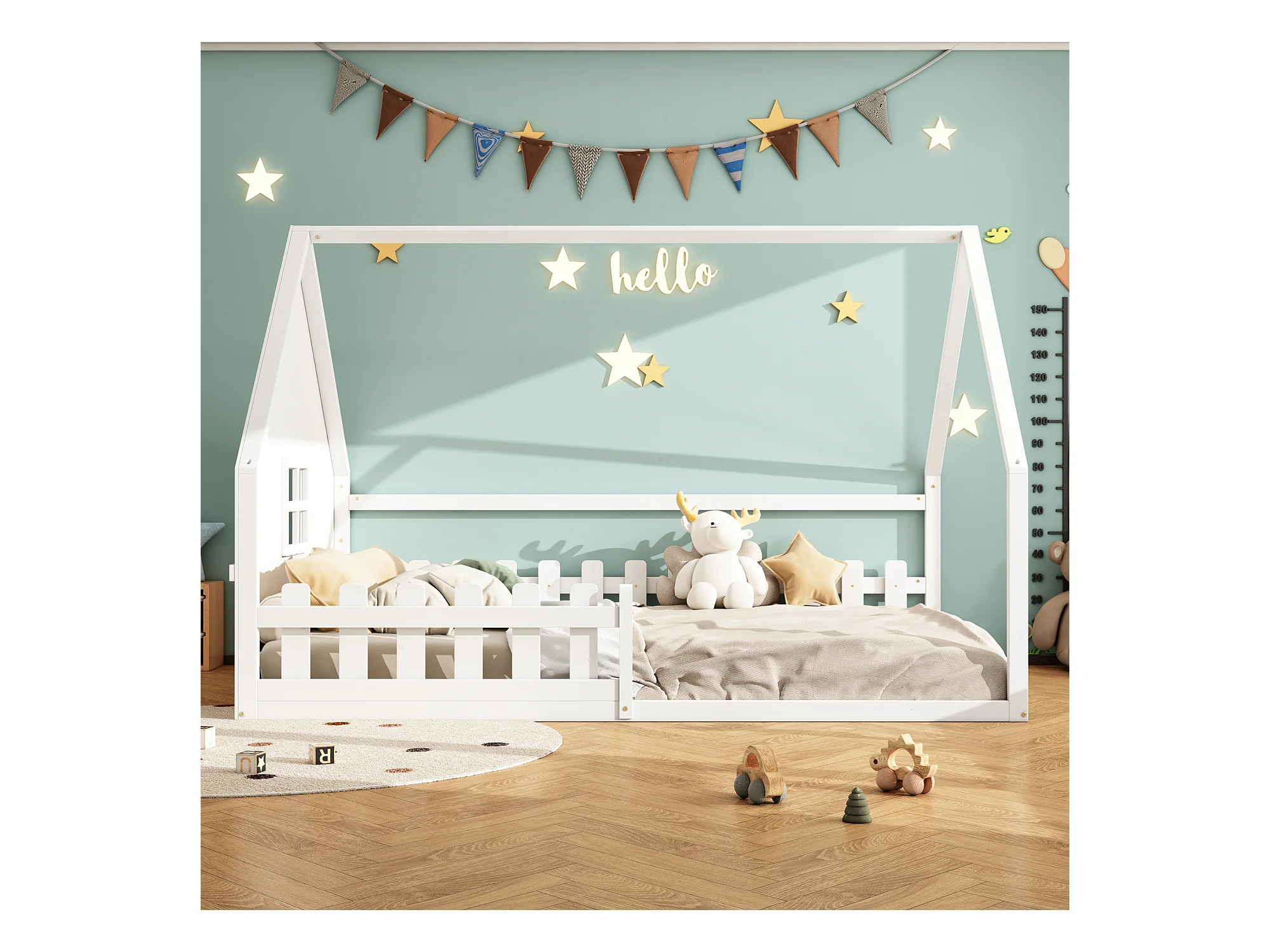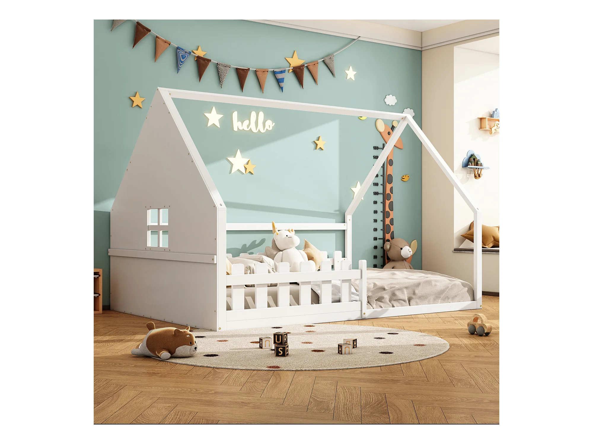 Lit simple 140x200 cm pour enfant, lit en forme de maison avec barrières, bois de pin, Blanc