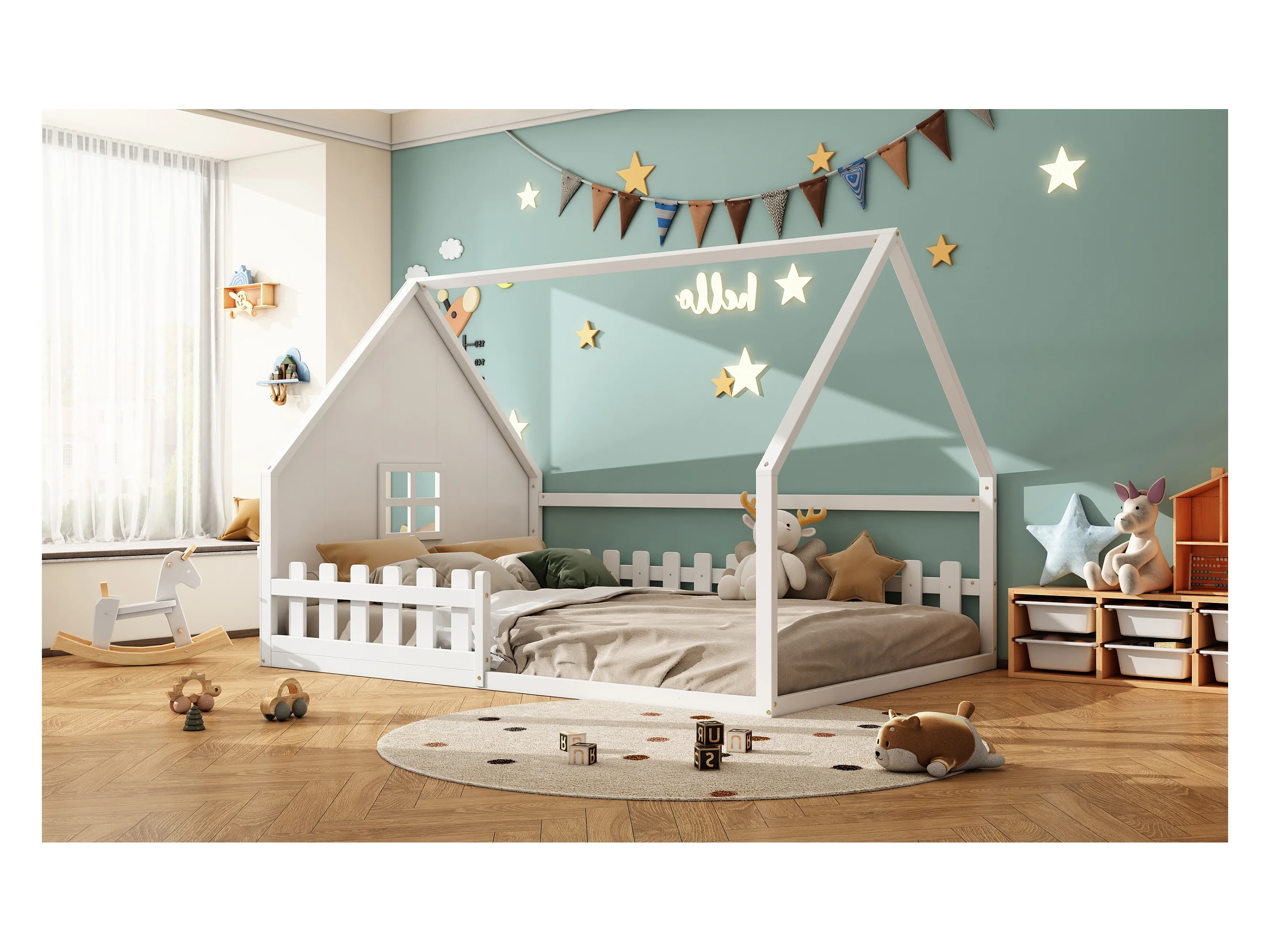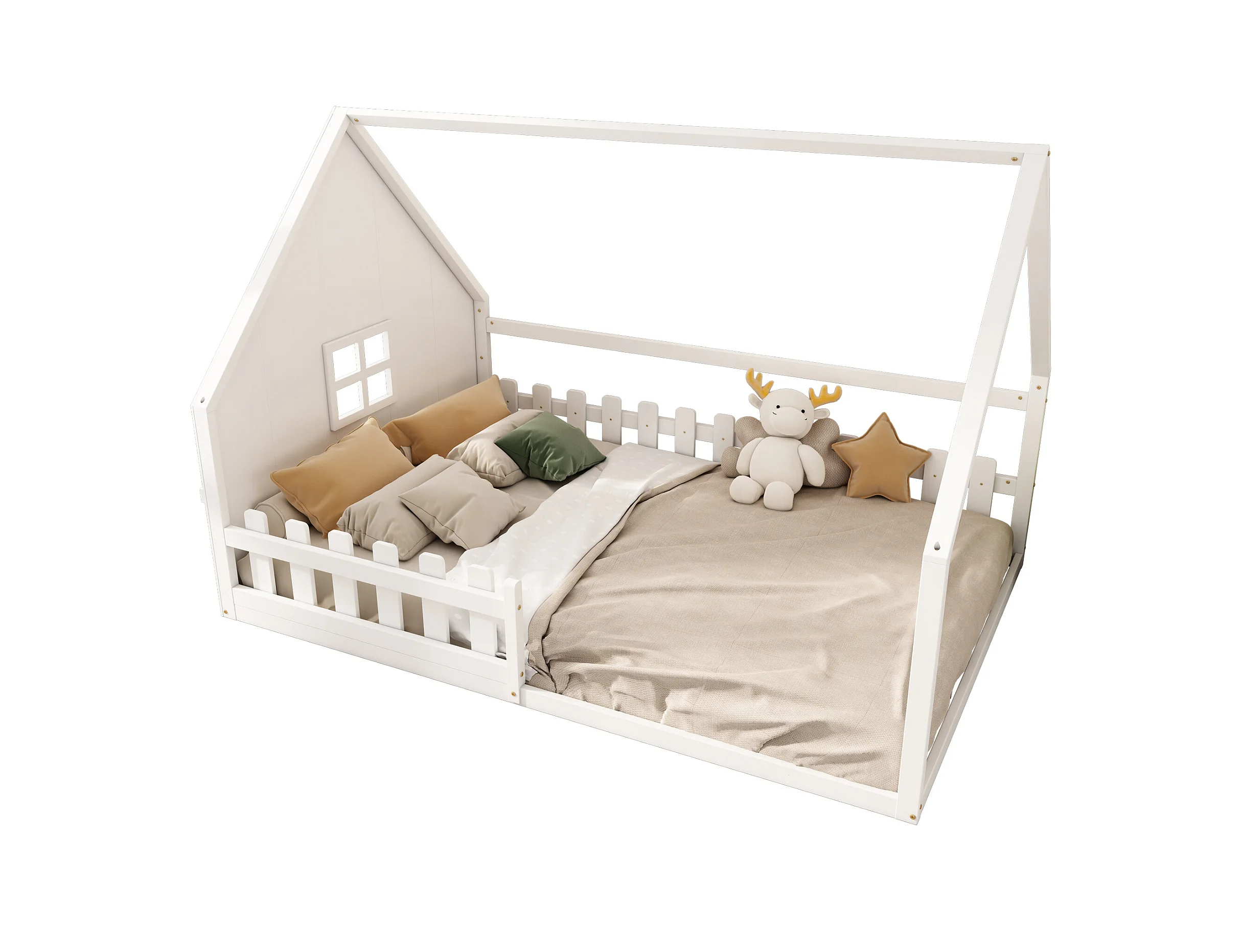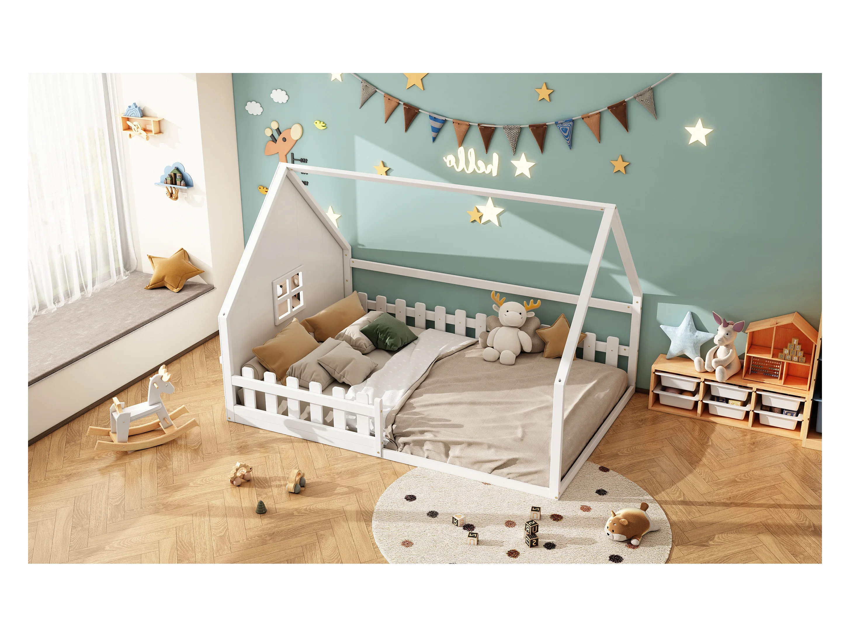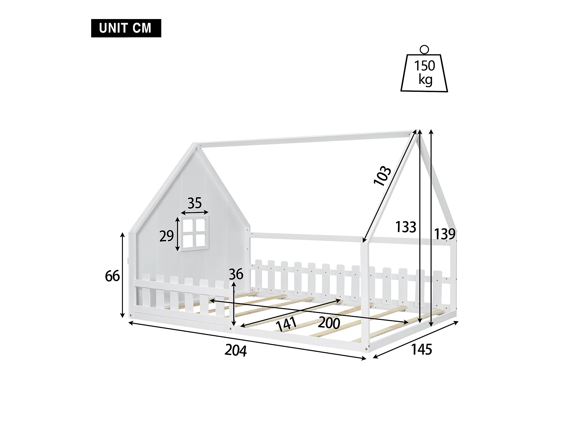 Lit simple 140x200 cm pour enfant, lit en forme de maison avec barrières, bois de pin, Blanc
