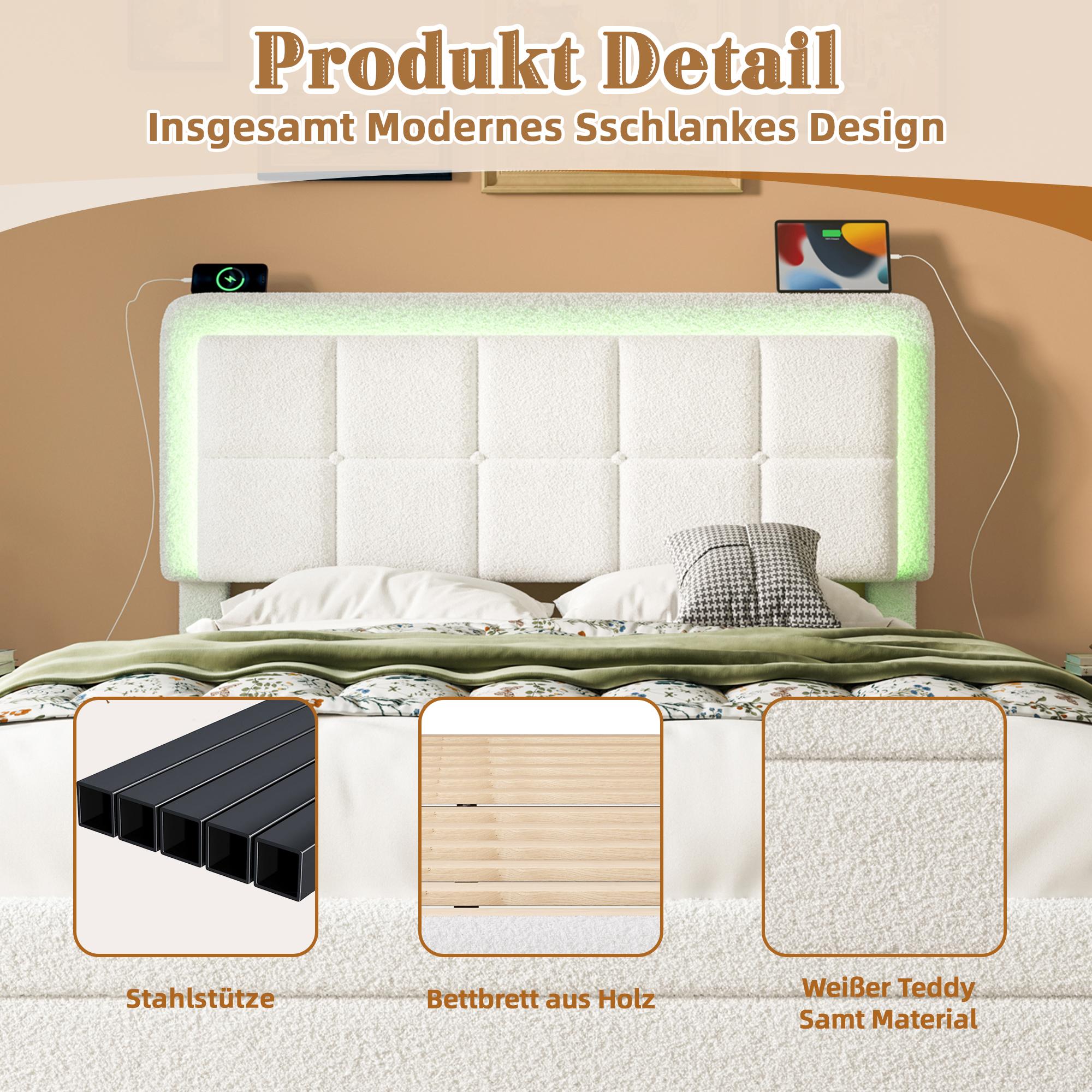 Lit coffre rembourré 140×200 cm en velours teddy blanc - avec tête de lit haute capitonnée - LED intégrées et un tiroir de rangement