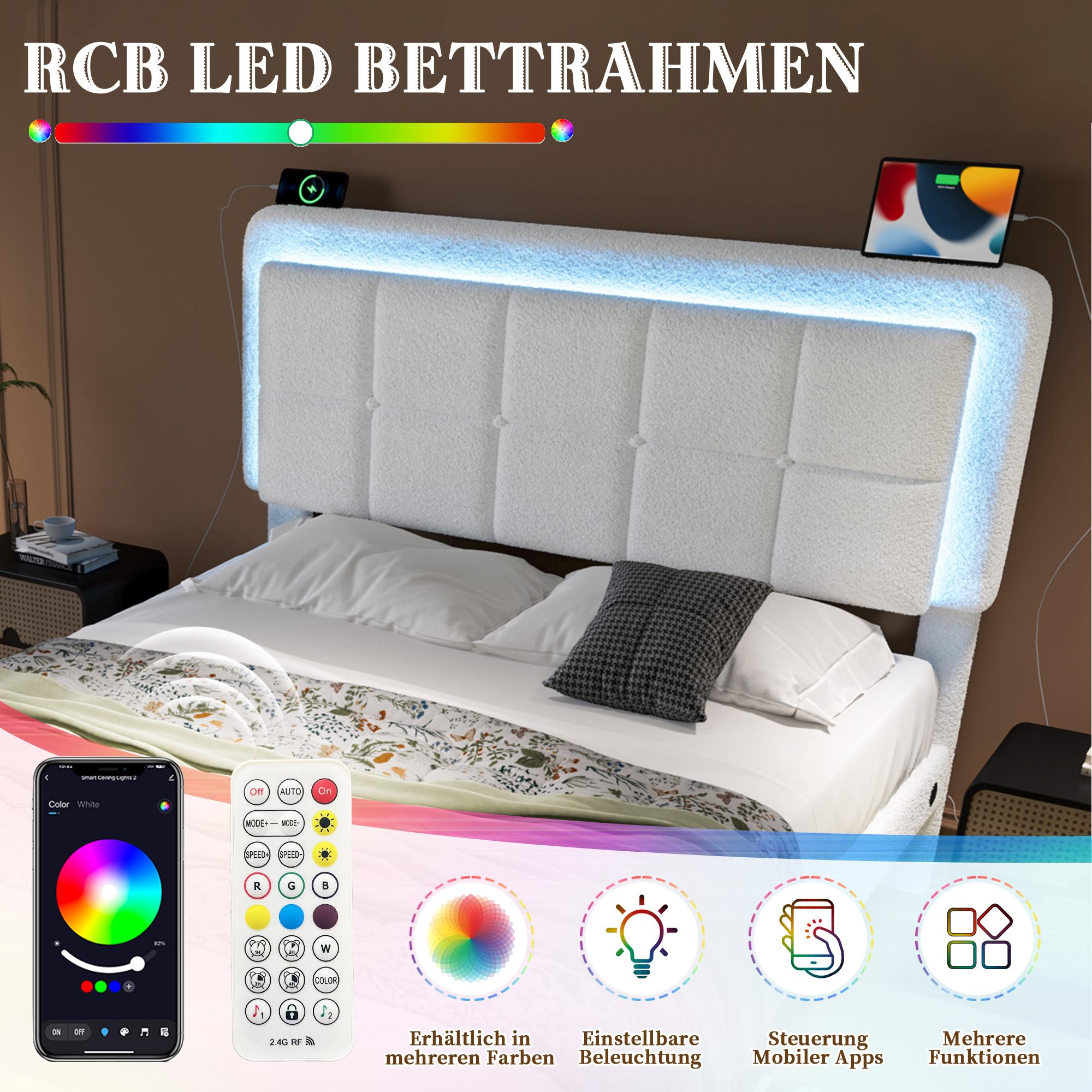 Lit coffre rembourré 160×200 cm en velours teddy blanc - avec tête de lit haute capitonnée - LED intégrées et un tiroir de rangement