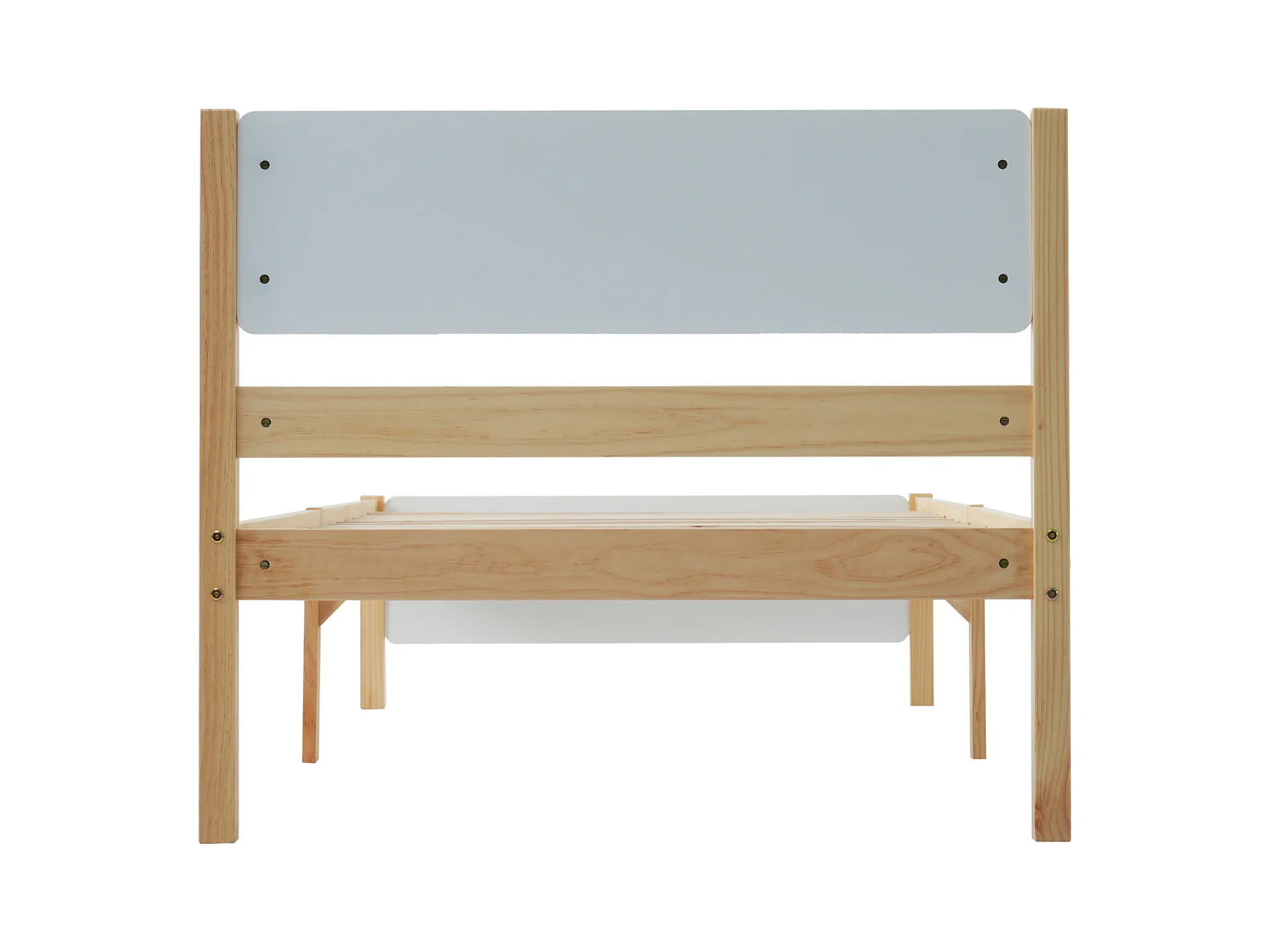 Lit simple 90 x 200 cm, avec Pied Central, tête et Pied de lit en MDF, Blanc + Naturel