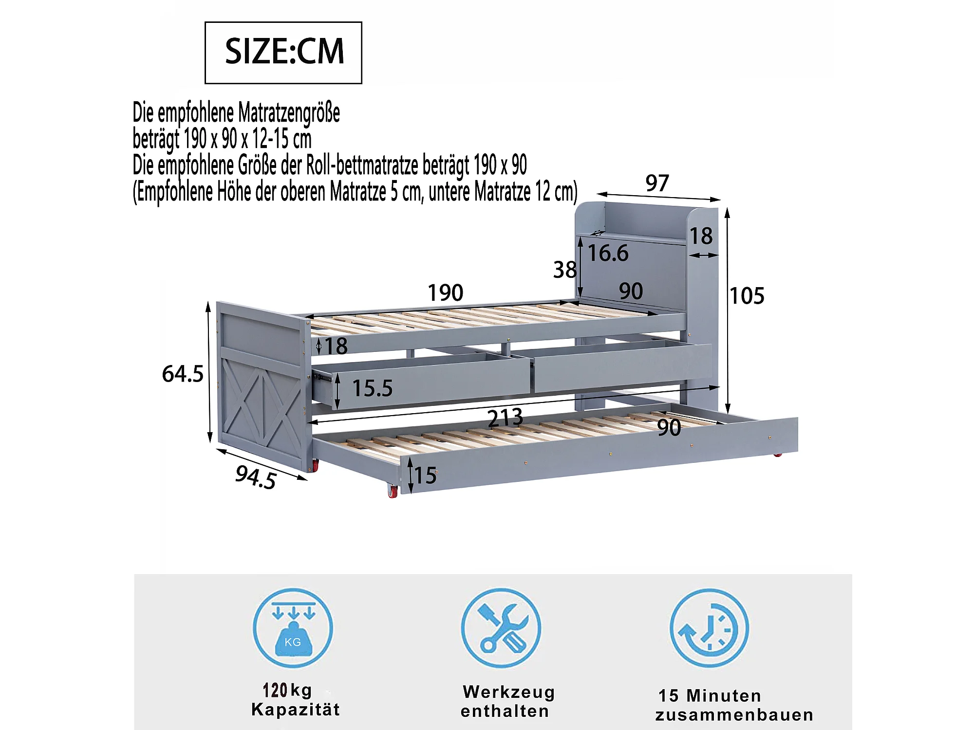 Lit simple 90x190cm, avec tiroir,sommier à lattes, table de chevet avec étagères et port USB, lit enfant, pin, gris, sans matelas