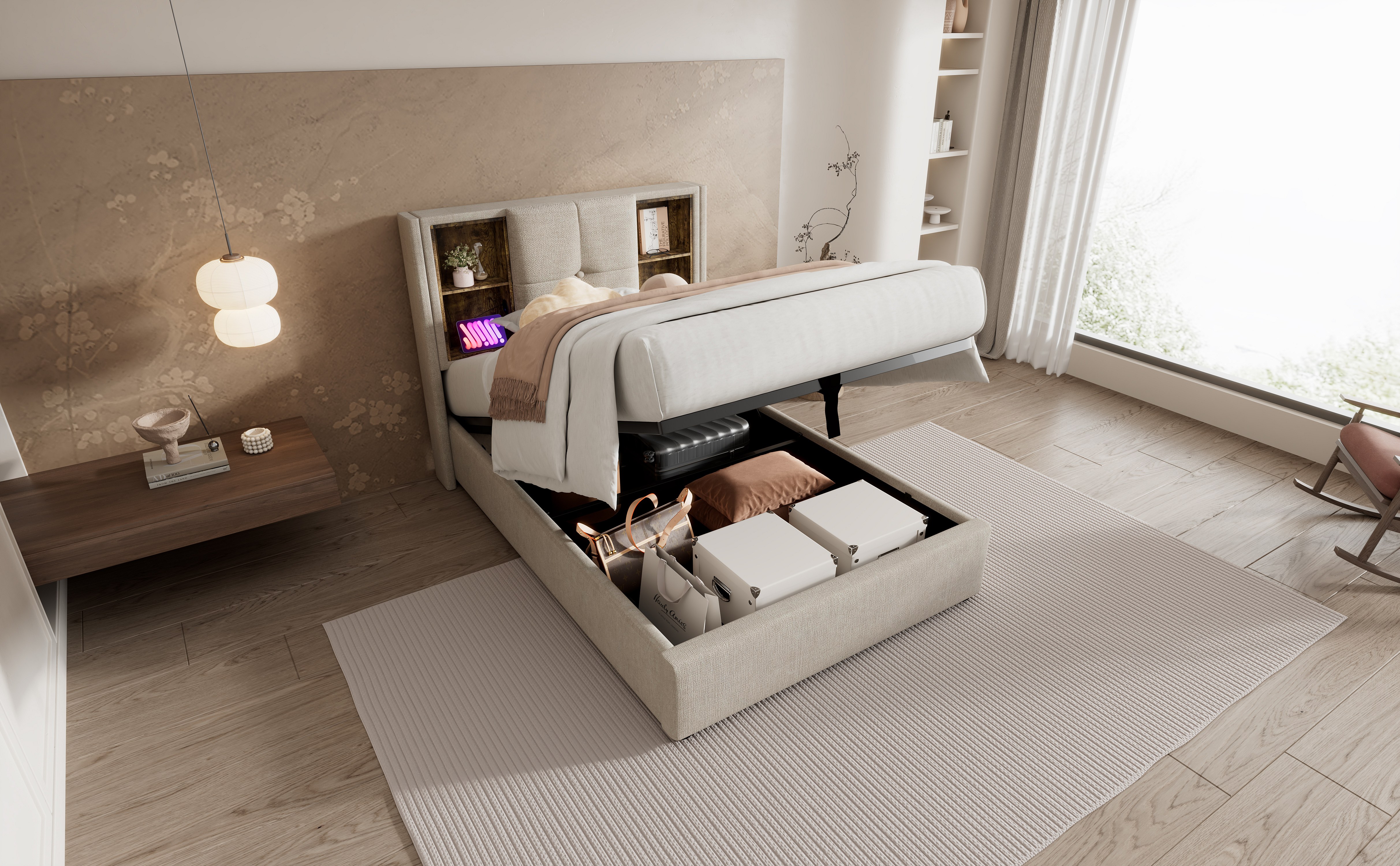 Lit simple 90×200 cm avec chargement sans fil, tête de lit en lin naturel et rangement intégré