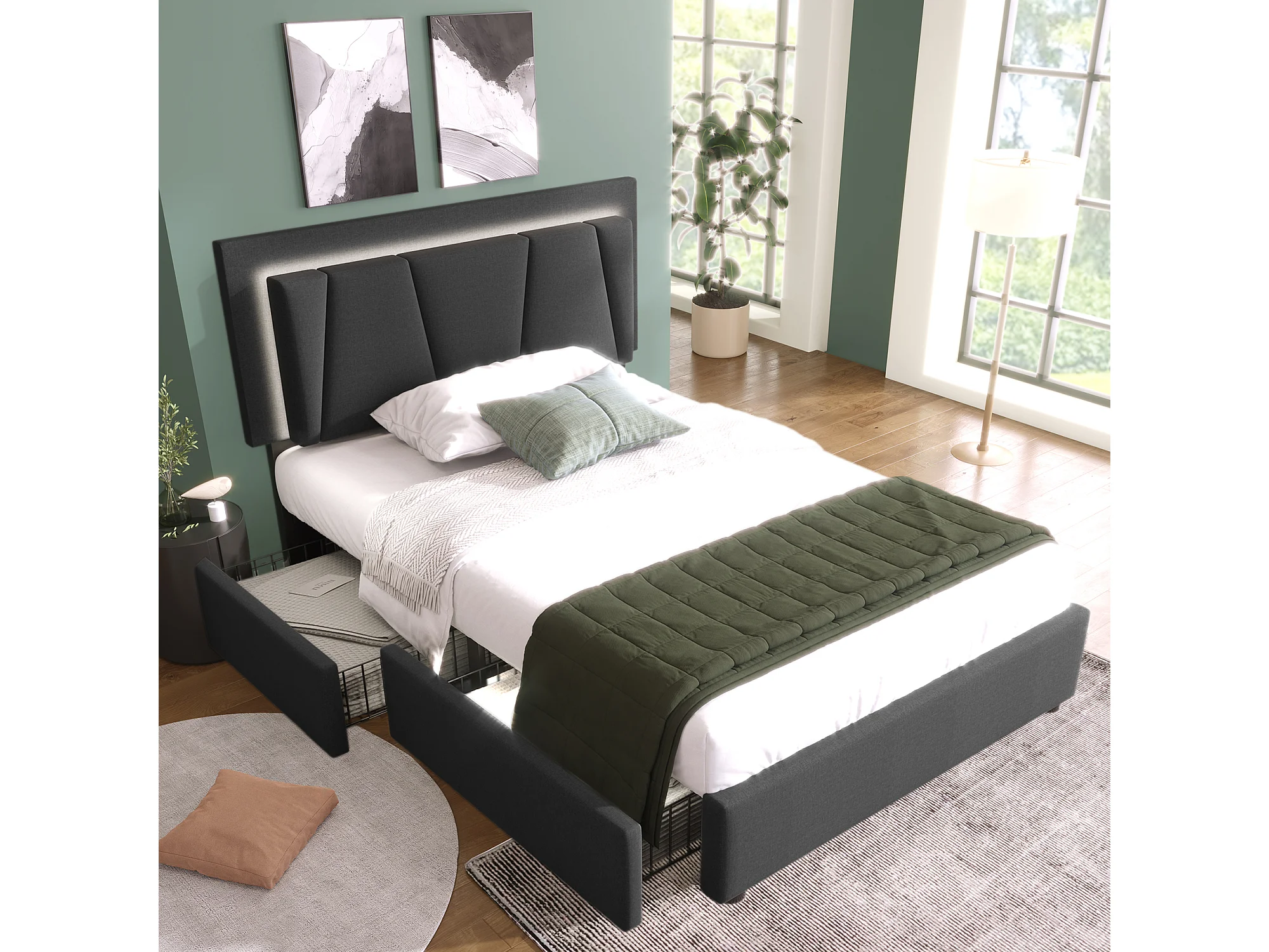 Lit simple 90x200 cm avec éclairage LED et 2 tiroirs, tête de lit réglable en hauteur, gris