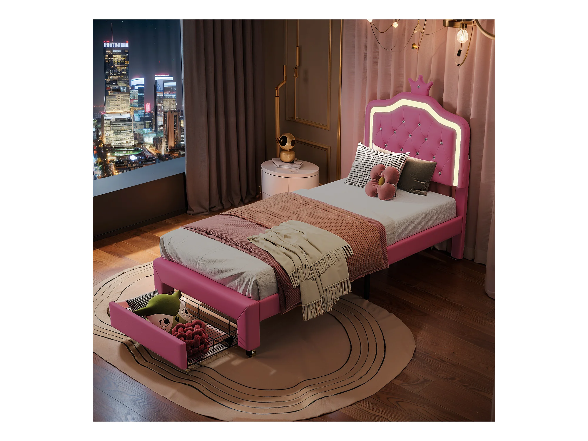 Lit Simple 90x200 cm avec Sommier et tête de lit réglable, Lit Enfant avec Tiroir et Tête de lit Couronne avec LED