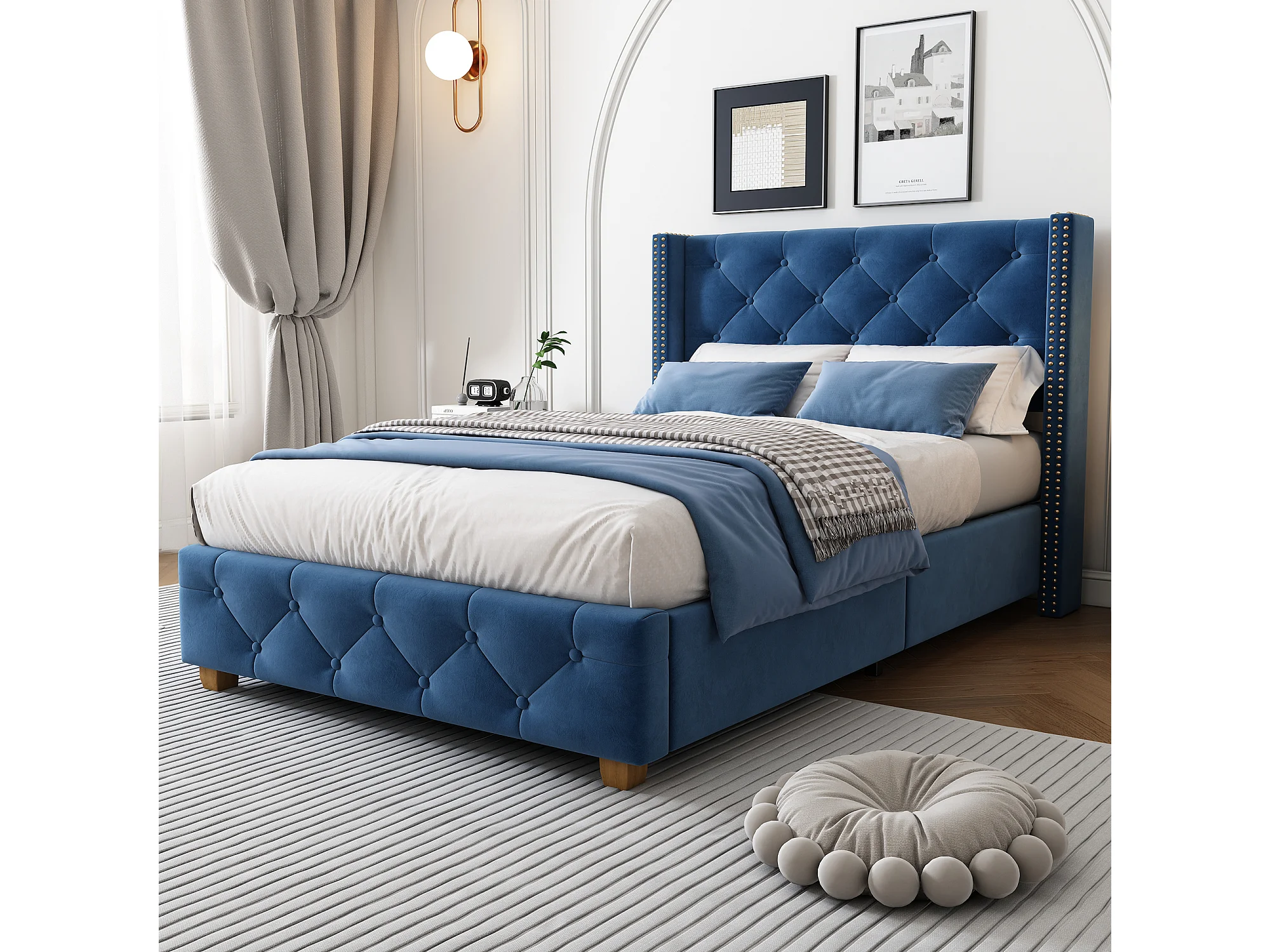 Lit adulte 90x200 cm avec sommier, Tête de lit capitonnée avec clous, Velours bleu, sans matelas