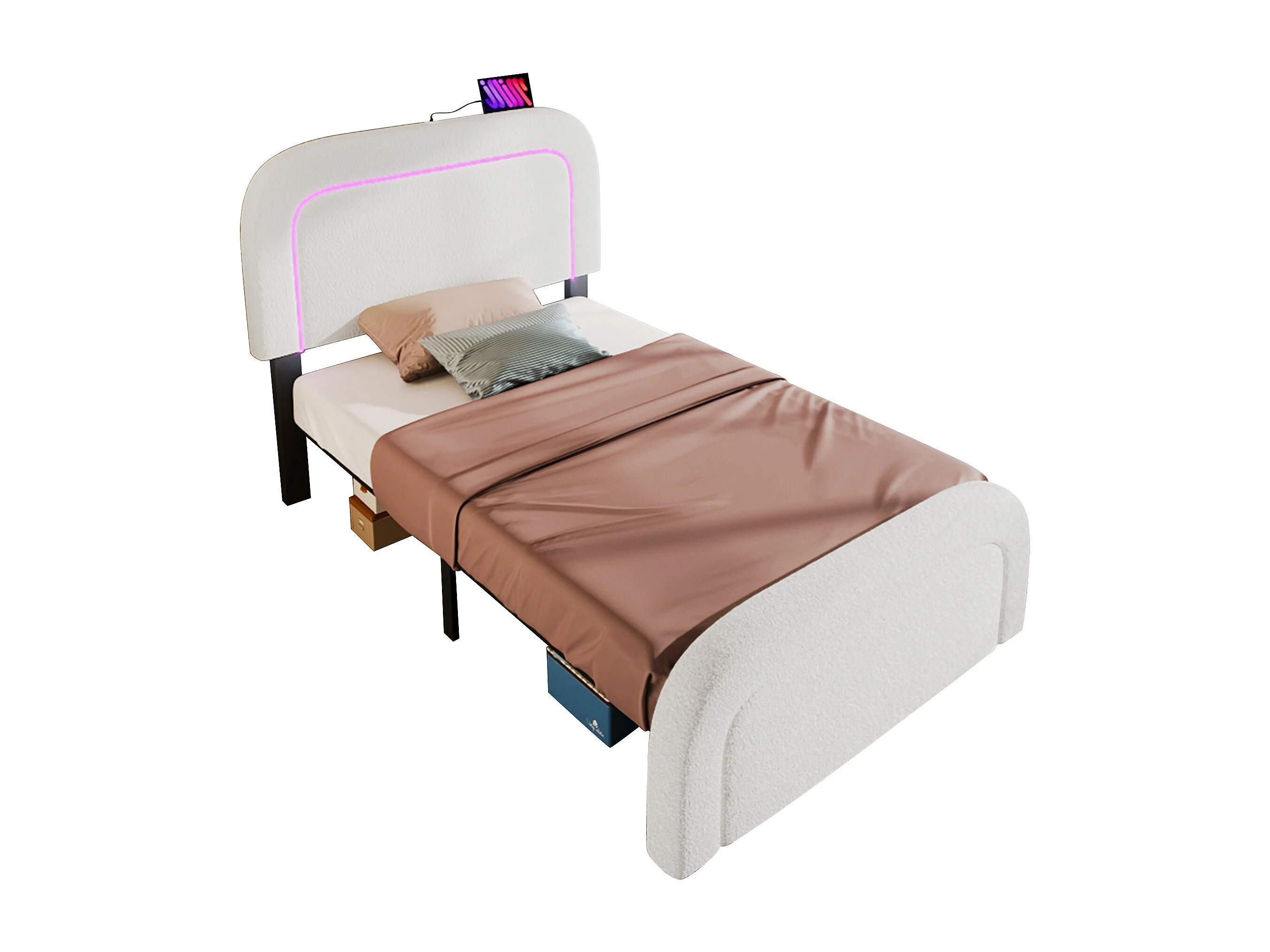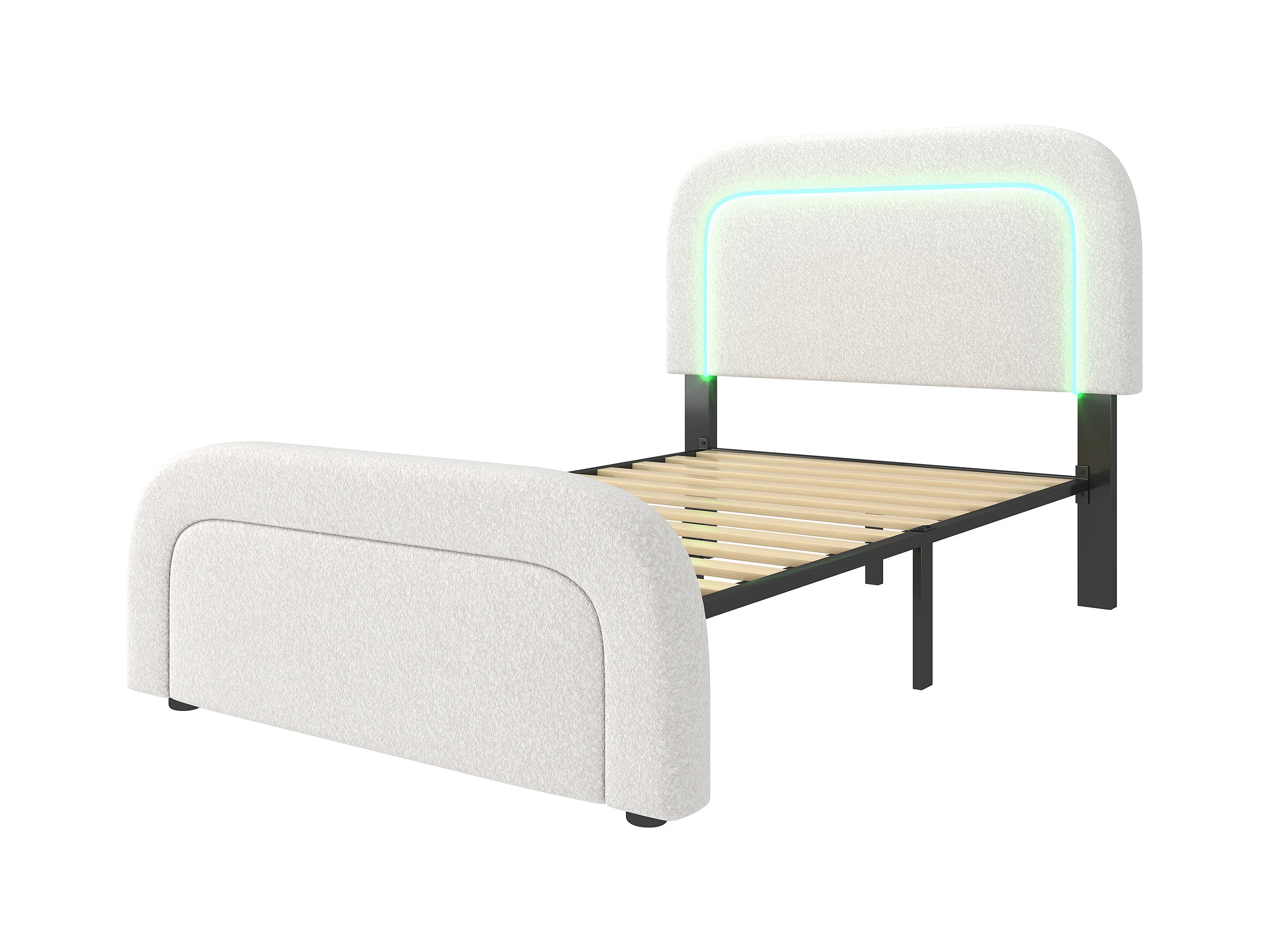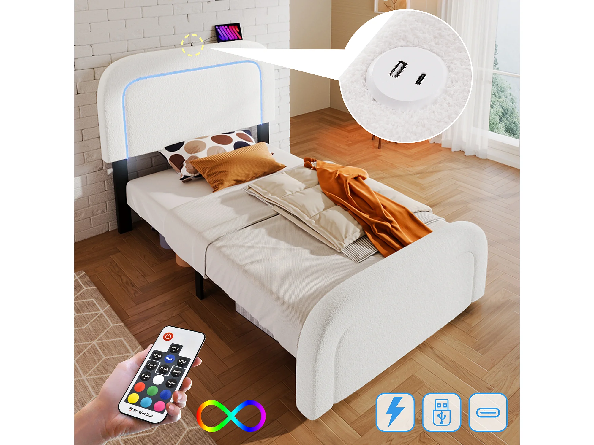 Lit enfant 90x200 cm avec USB et LED, tête de lit réglable, sommier en bois, blanc Sherpa (sans matelas)