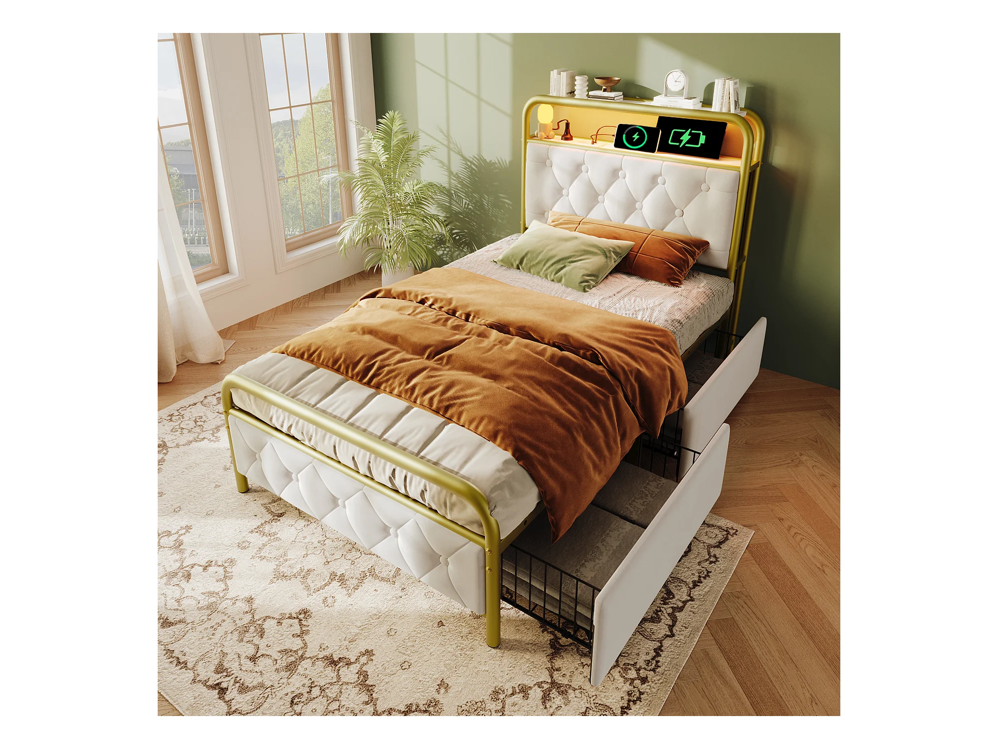 Lit simple 90x200 cm avec USB Type C, LED, 2 tiroirs et tête de lit en velours, blanc (223x94x106 cm)