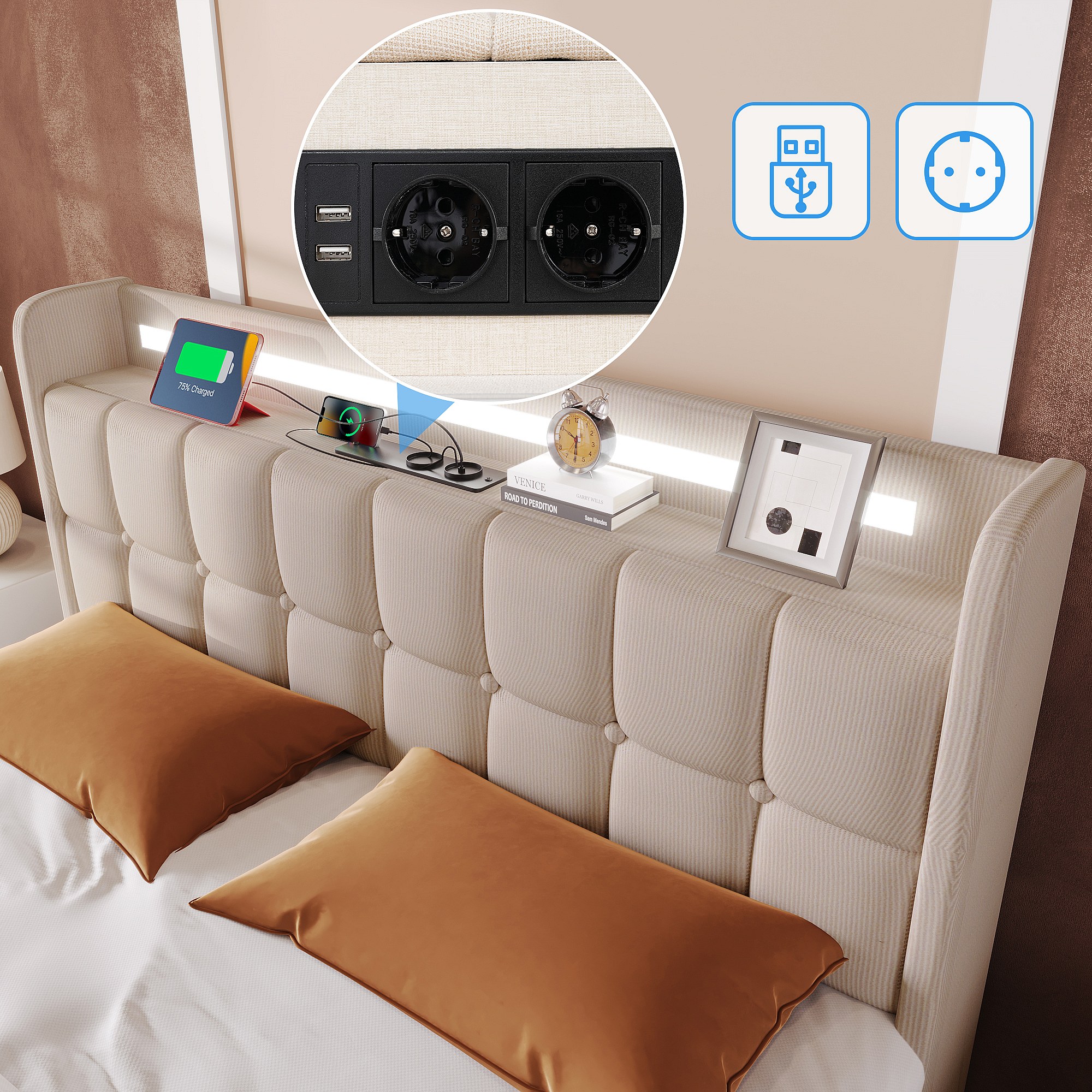 Lit simple 90x200 cm beige avec prises USB, éclairage LED et 2 tiroirs de rangement
