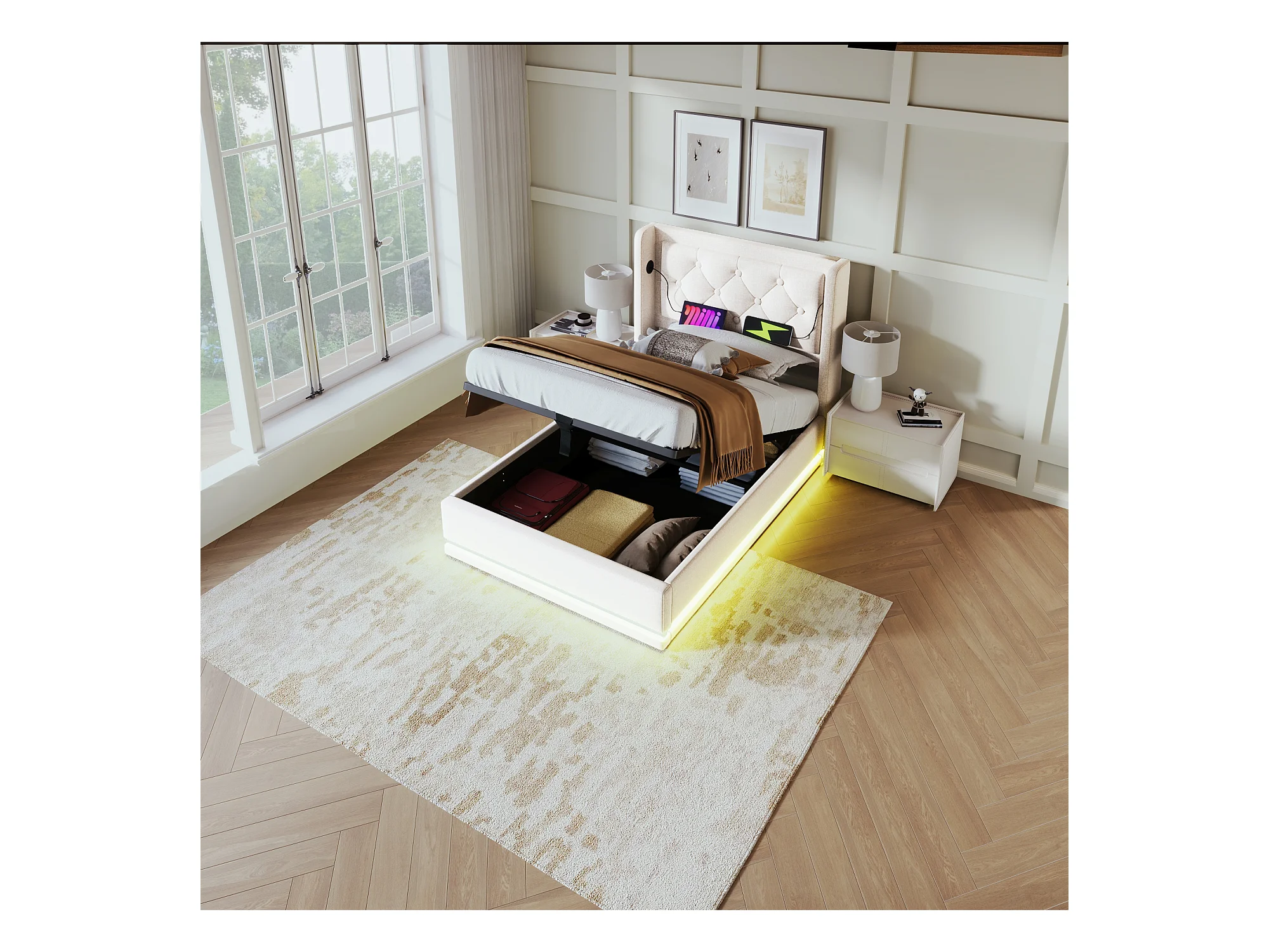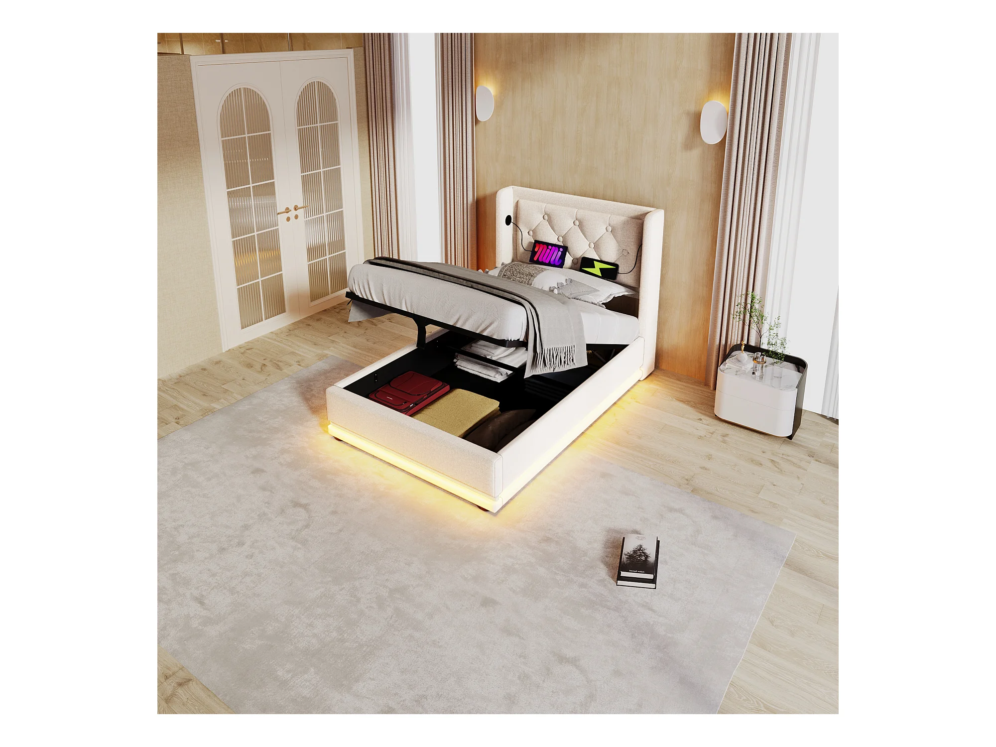 Lit simple 90x200 cm beige en coton avec fonction LED 3 côtés, tête de lit rembourrée, USB Type-C, lit de rangement hydraulique (sans matelas)