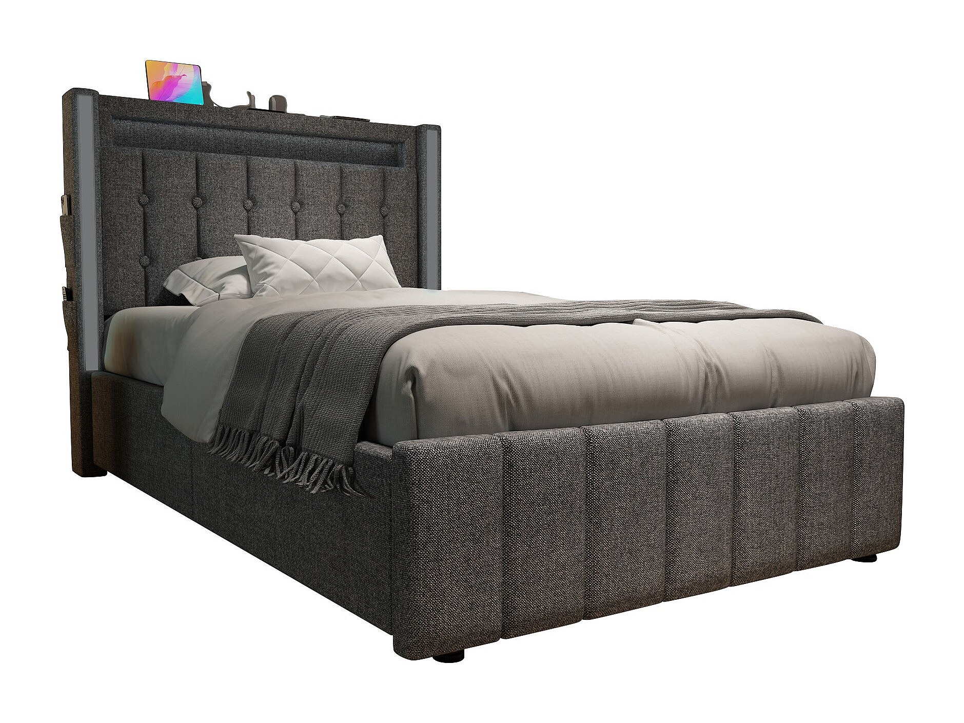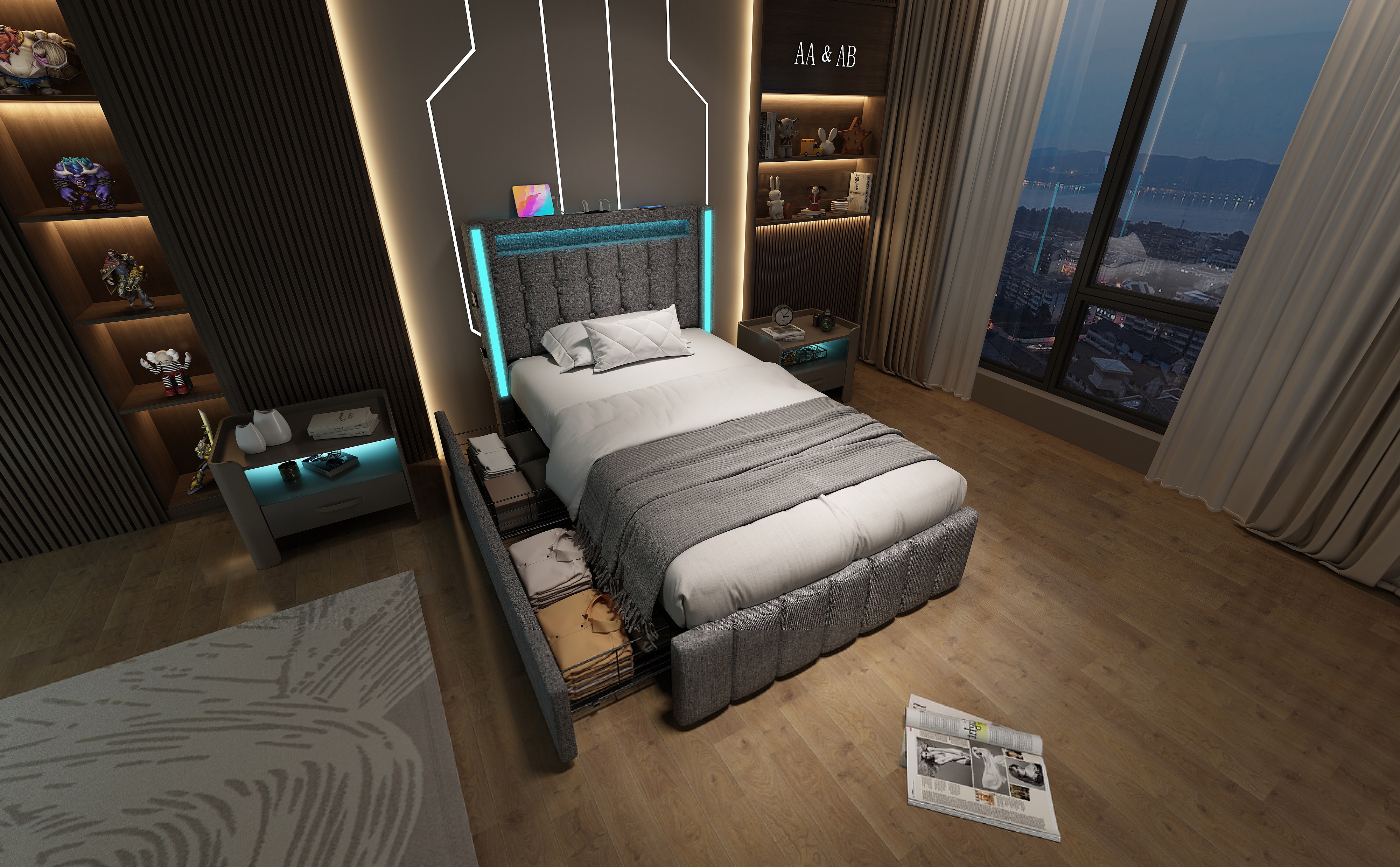 Lit simple 90x200 cm en gris avec fonction de chargement USB et éclairage LED, 2 tiroirs de rangement