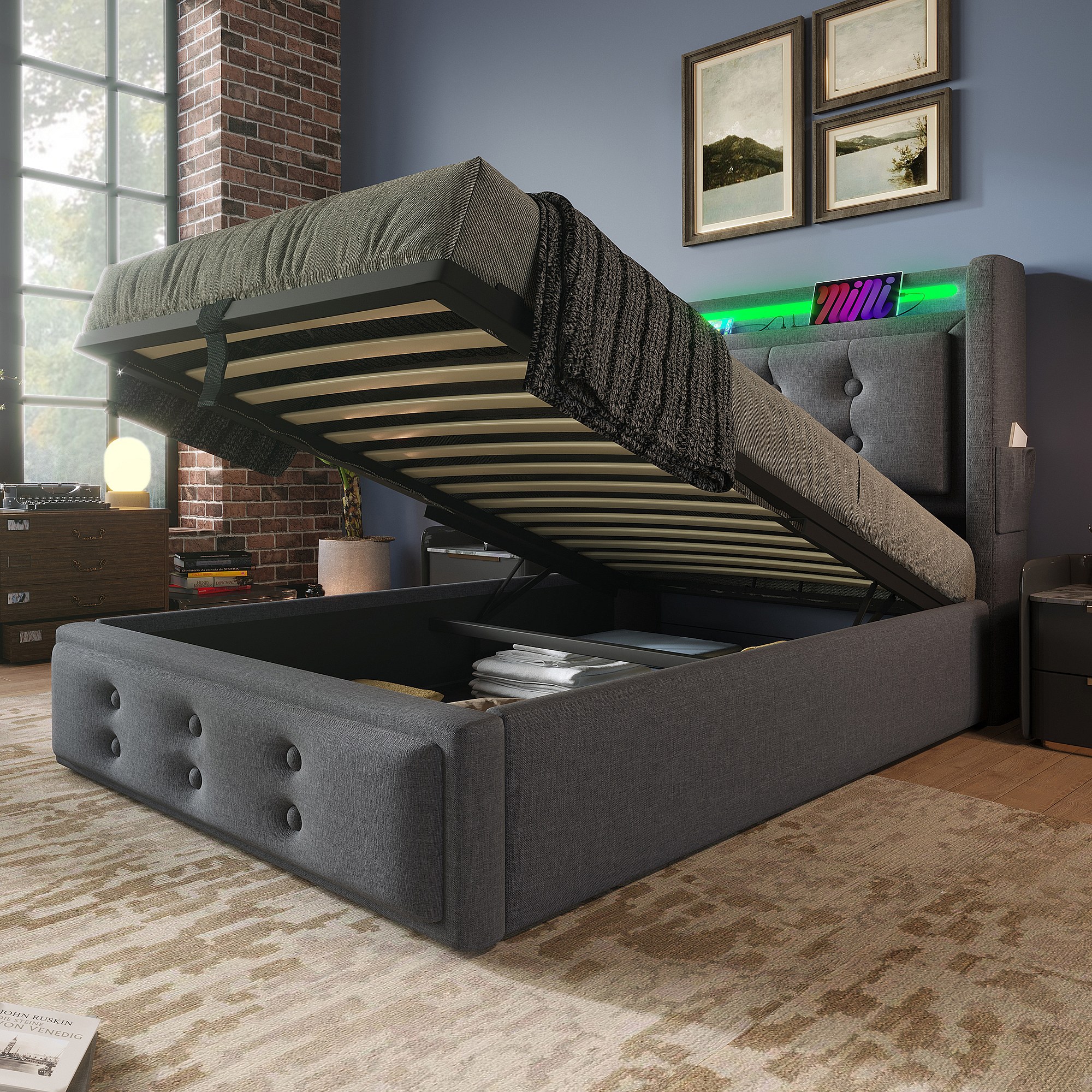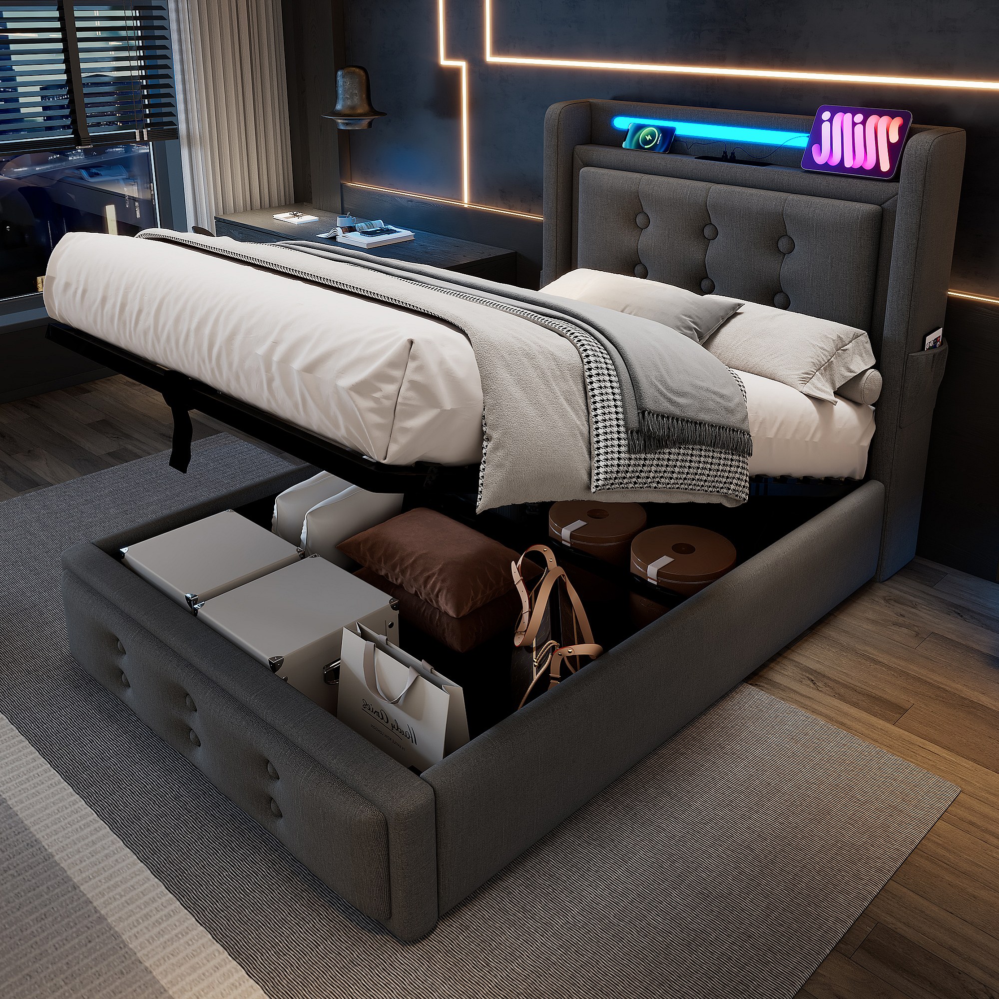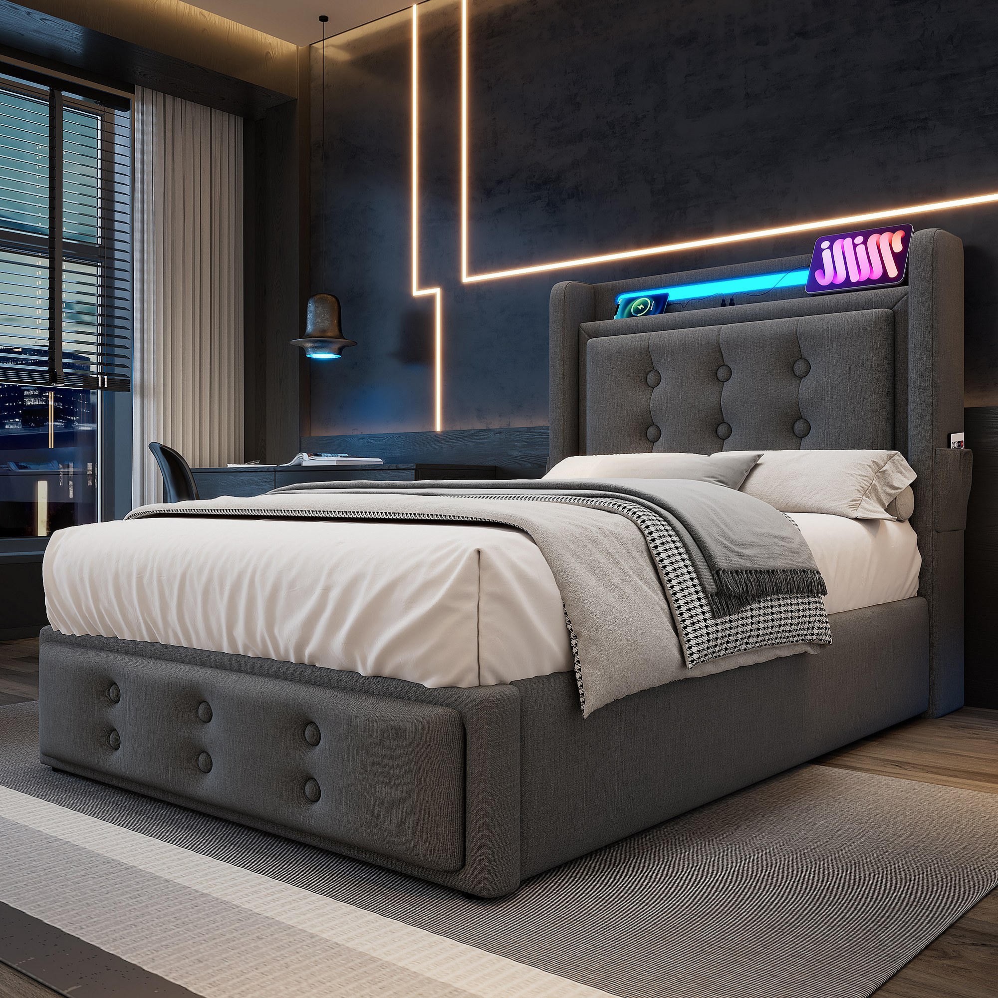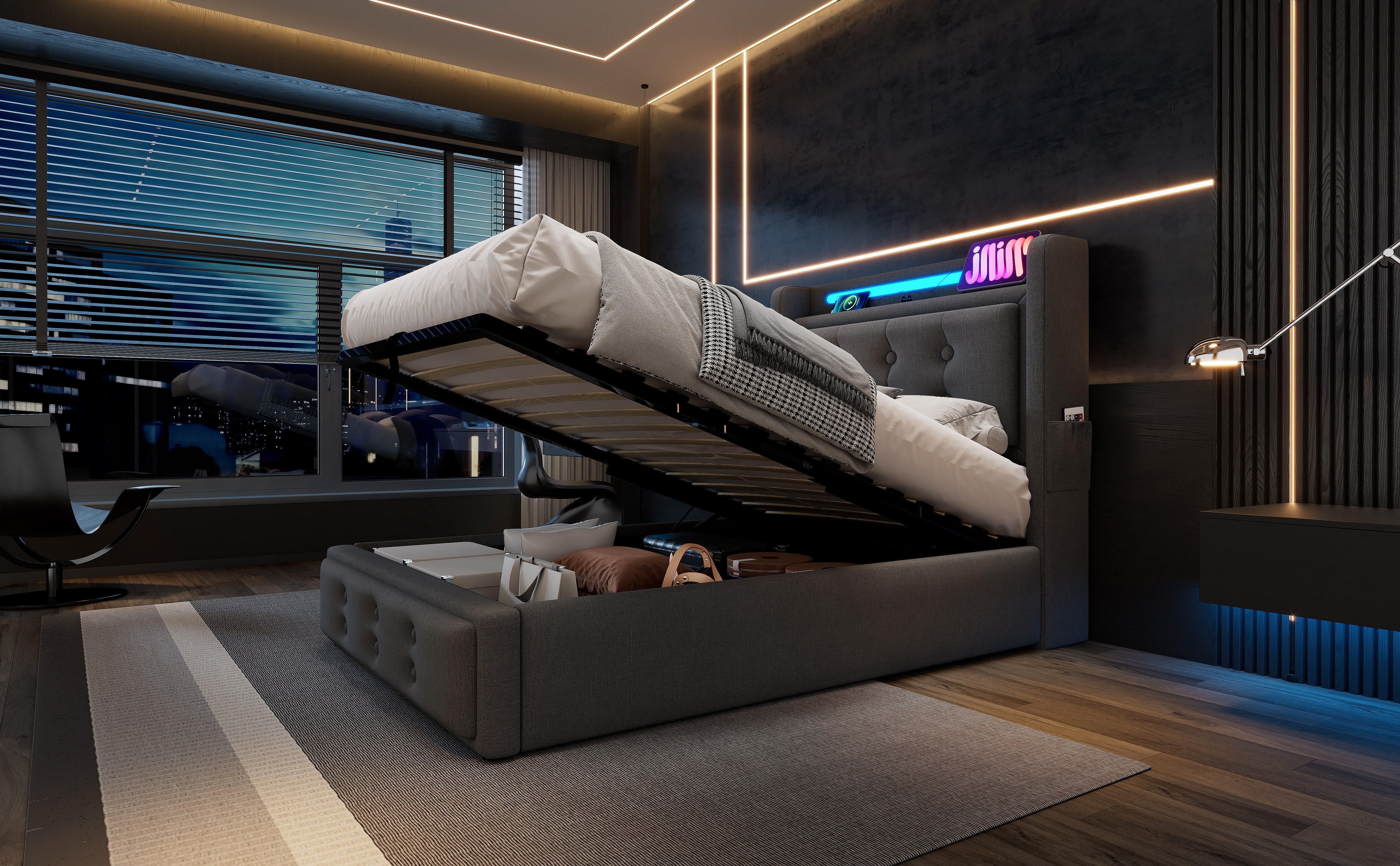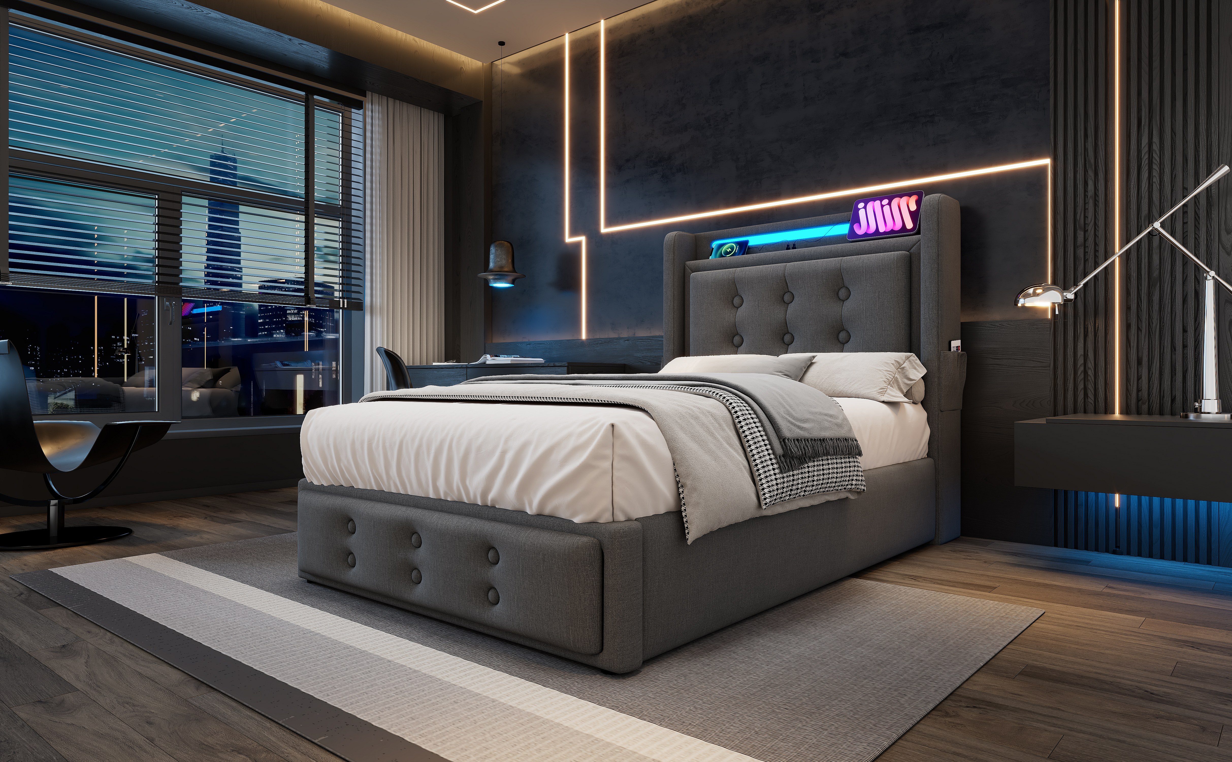 Lit simple 90×200 cm en gris avec tête de lit LED et ports USB intégrés, rangement pratique