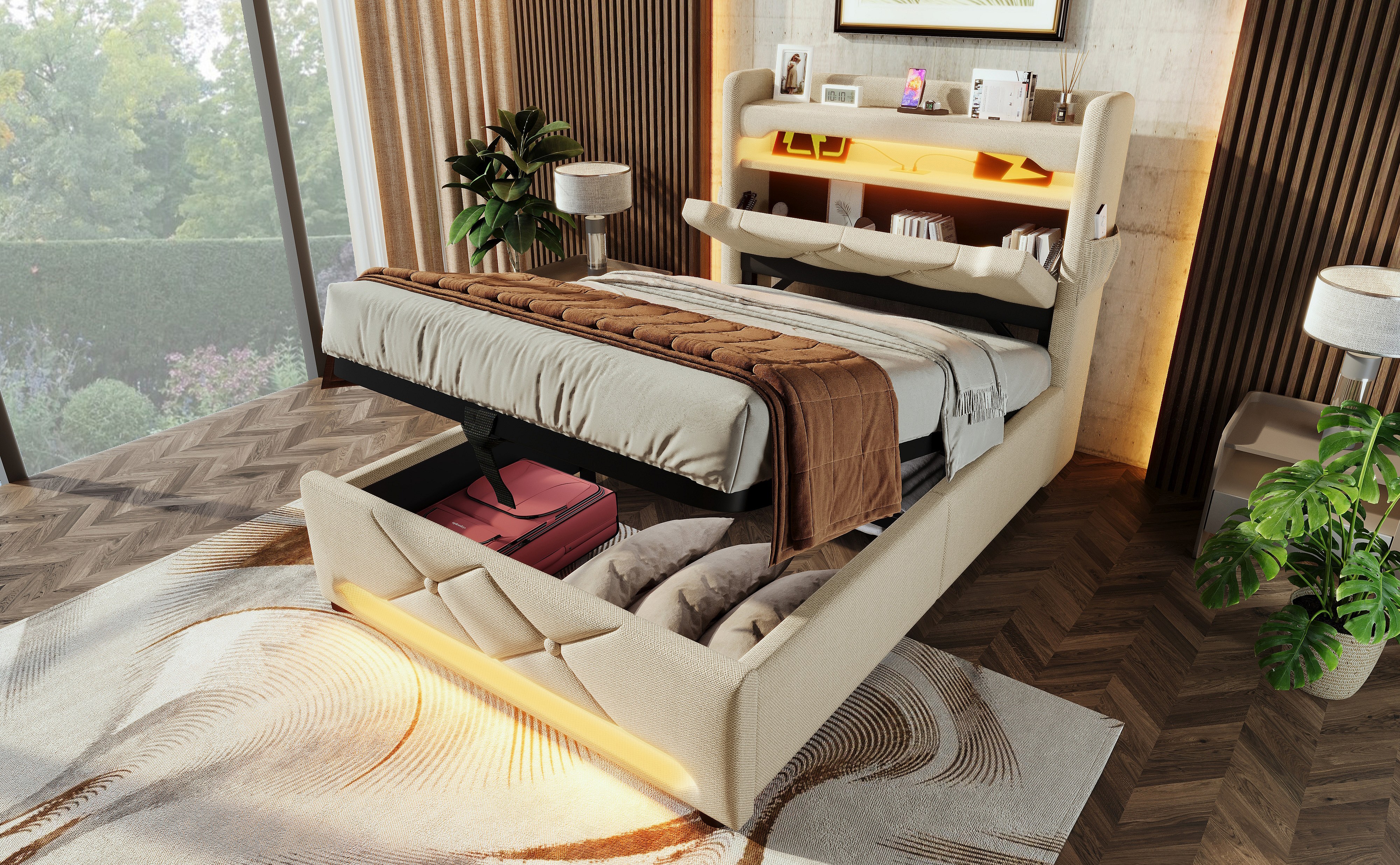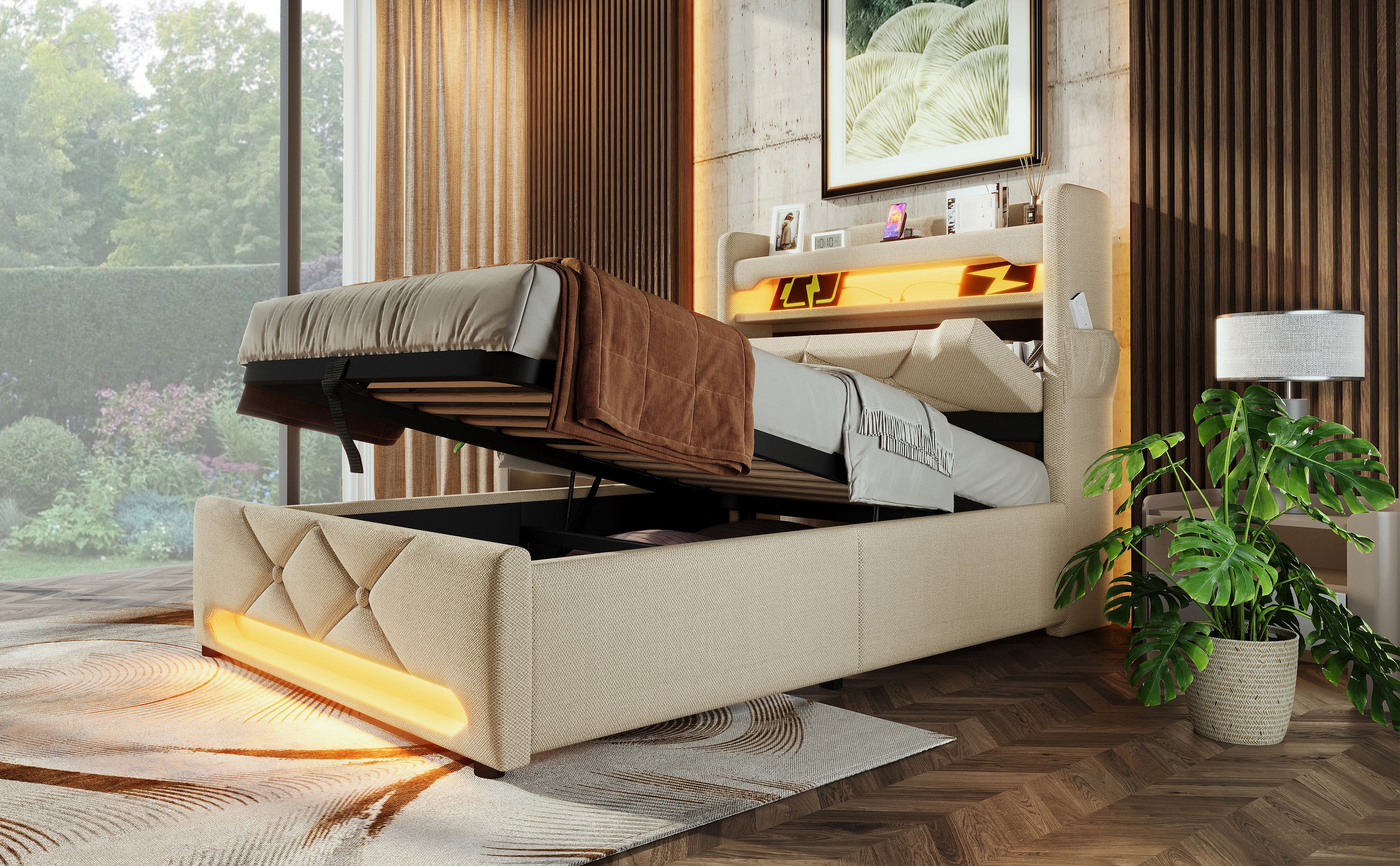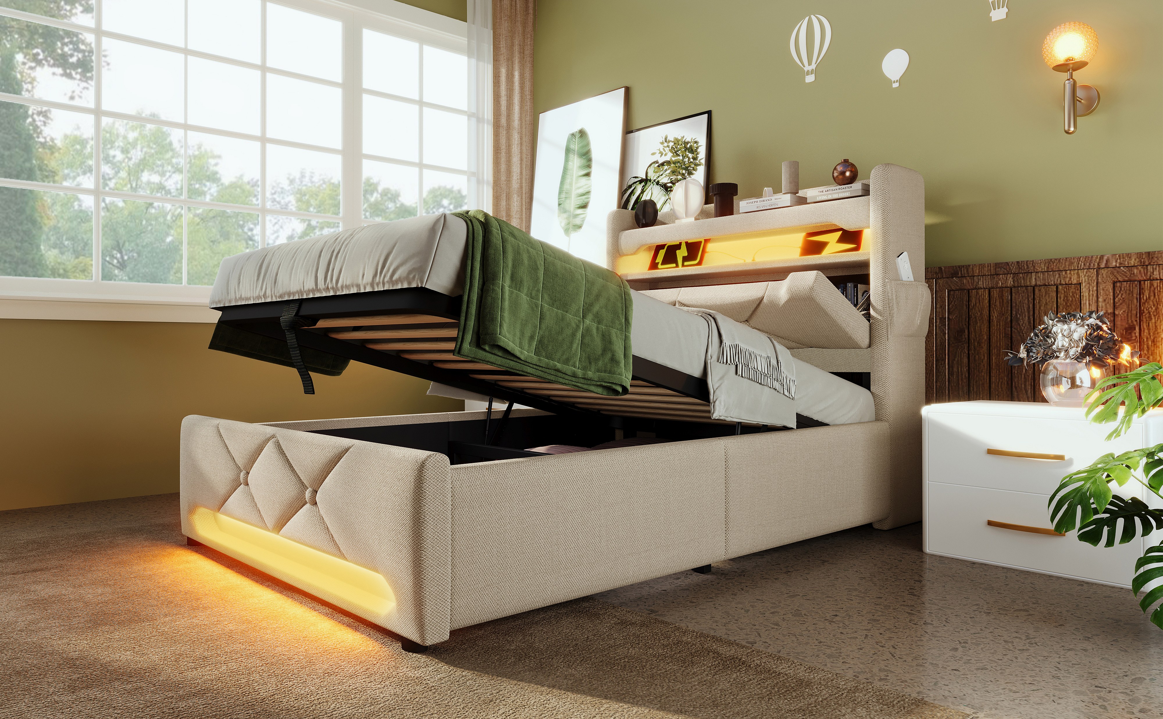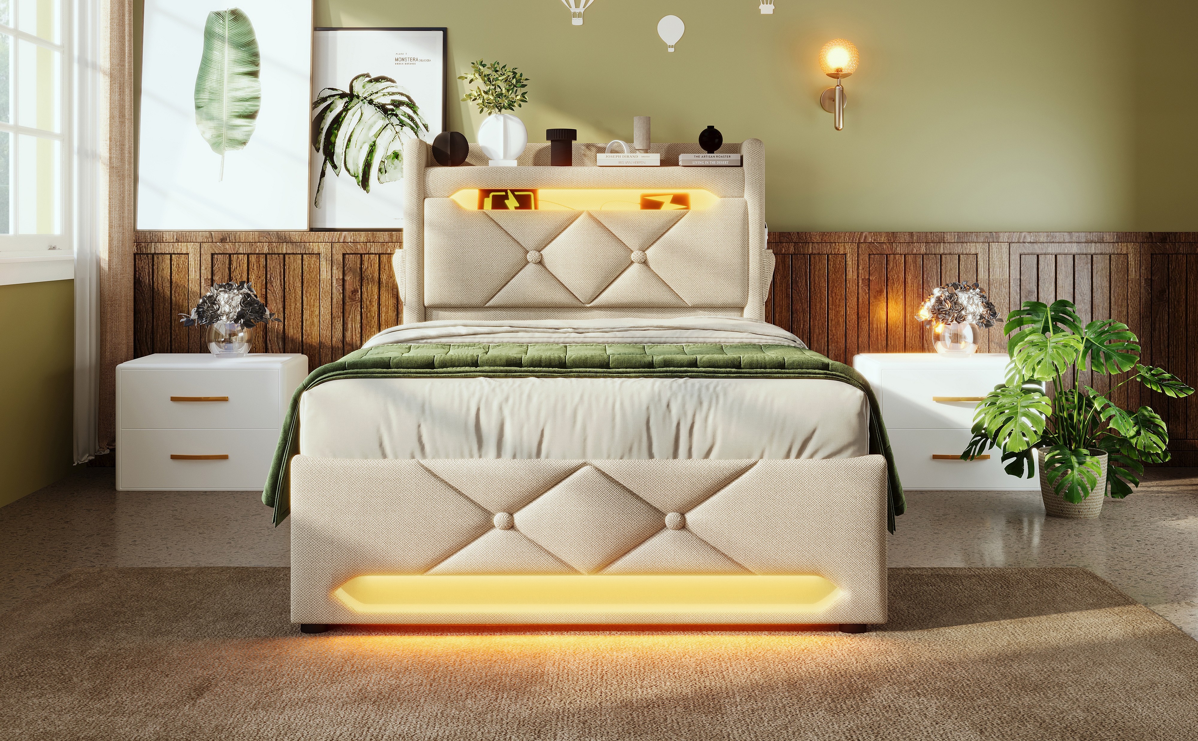 Lit simple 90×200 cm en lin beige avec tête de lit de rangement et ports USB