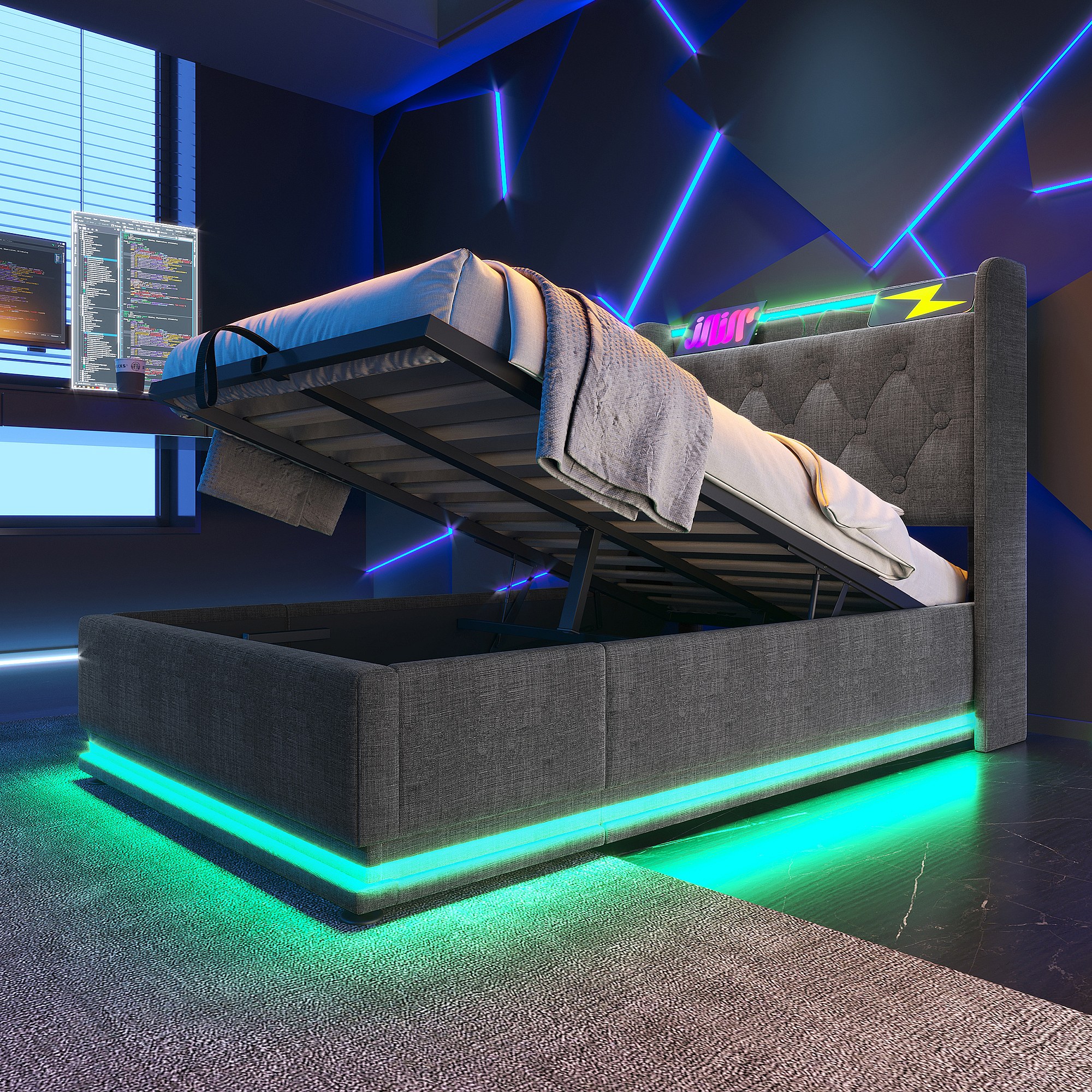 Lit simple 90×200 cm en lin gris avec éclairage LED 360° et port USB intégré