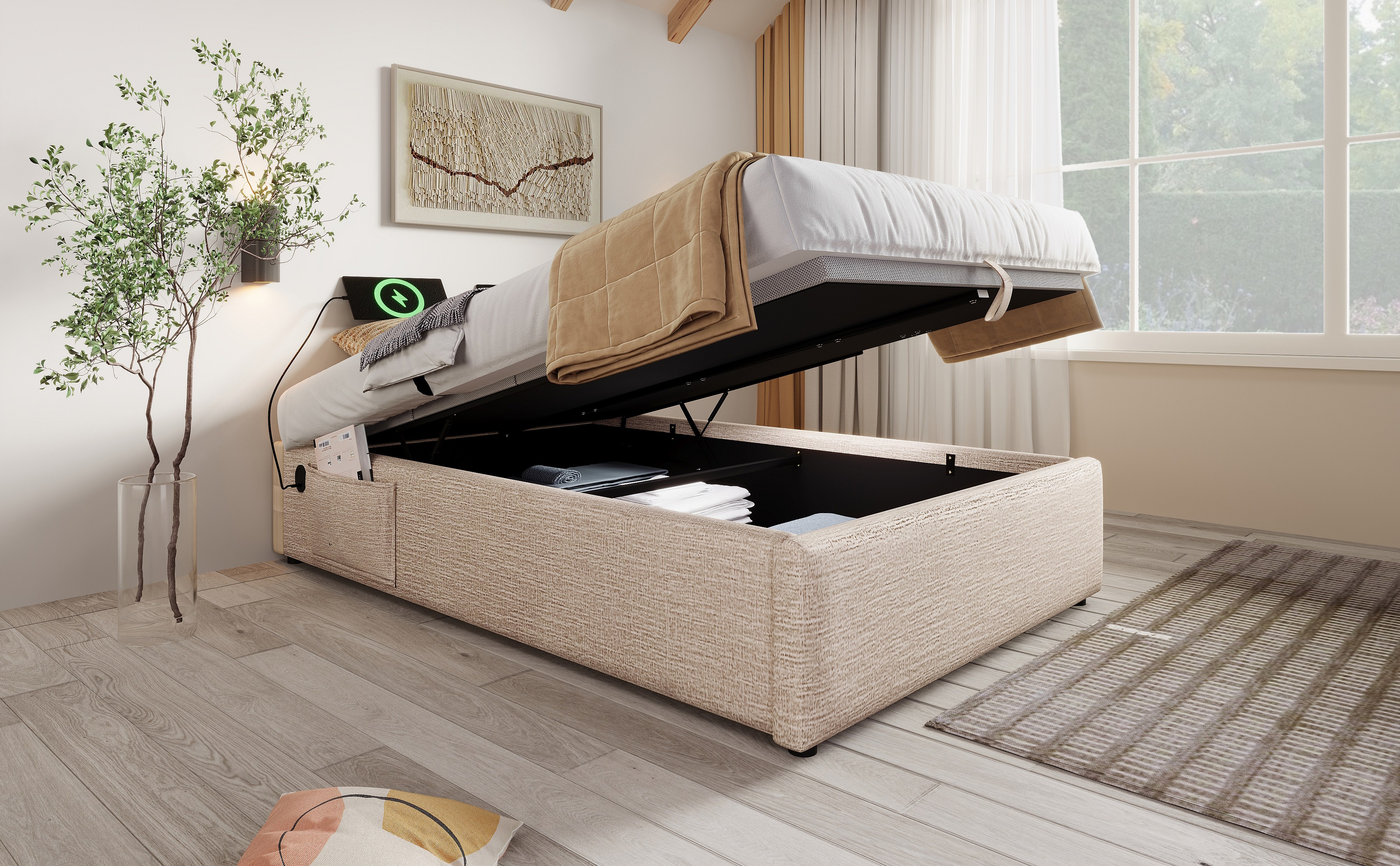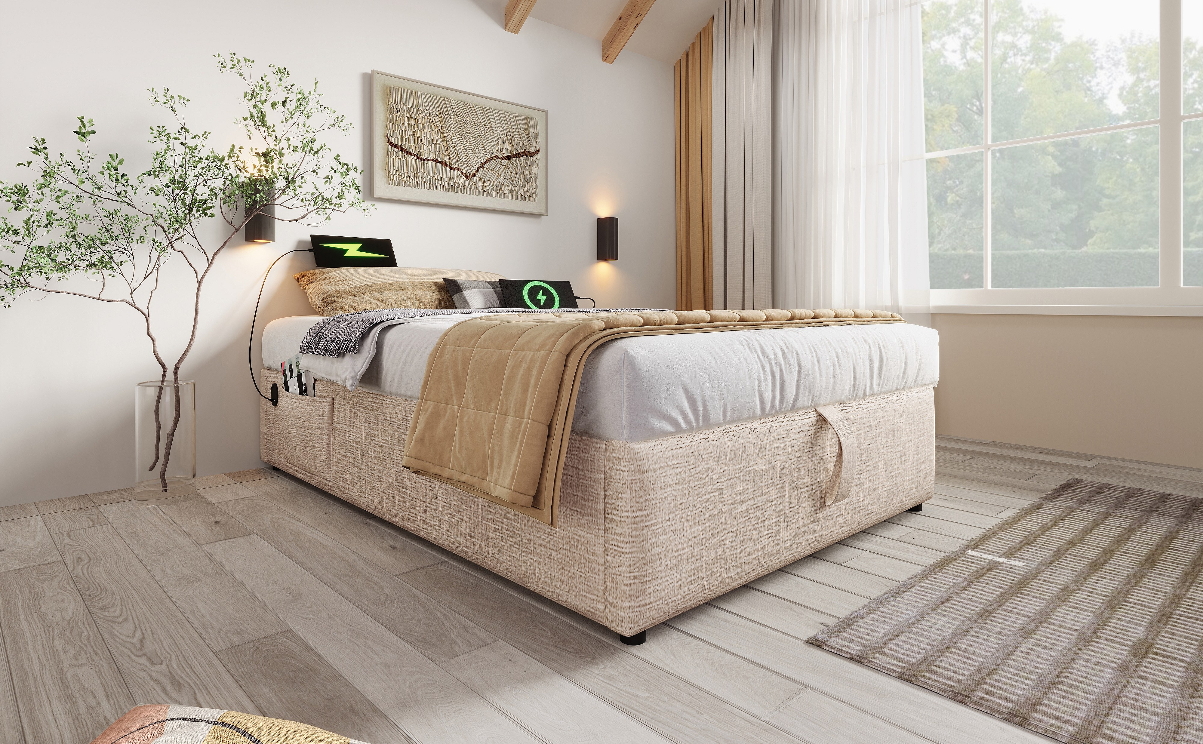 Lit simple 90×200 cm en lin naturel avec rangement hydraulique et ports USB intégrés