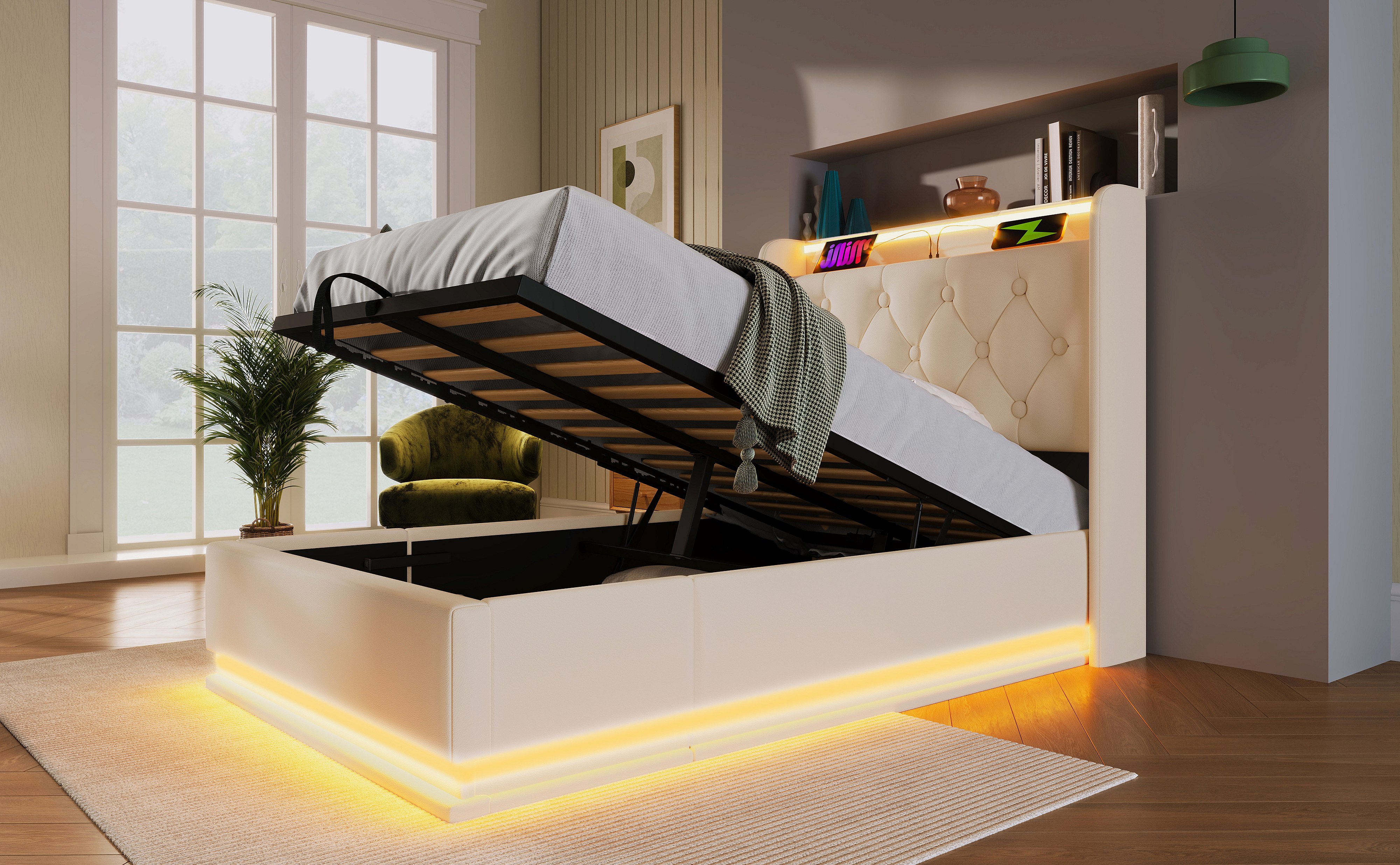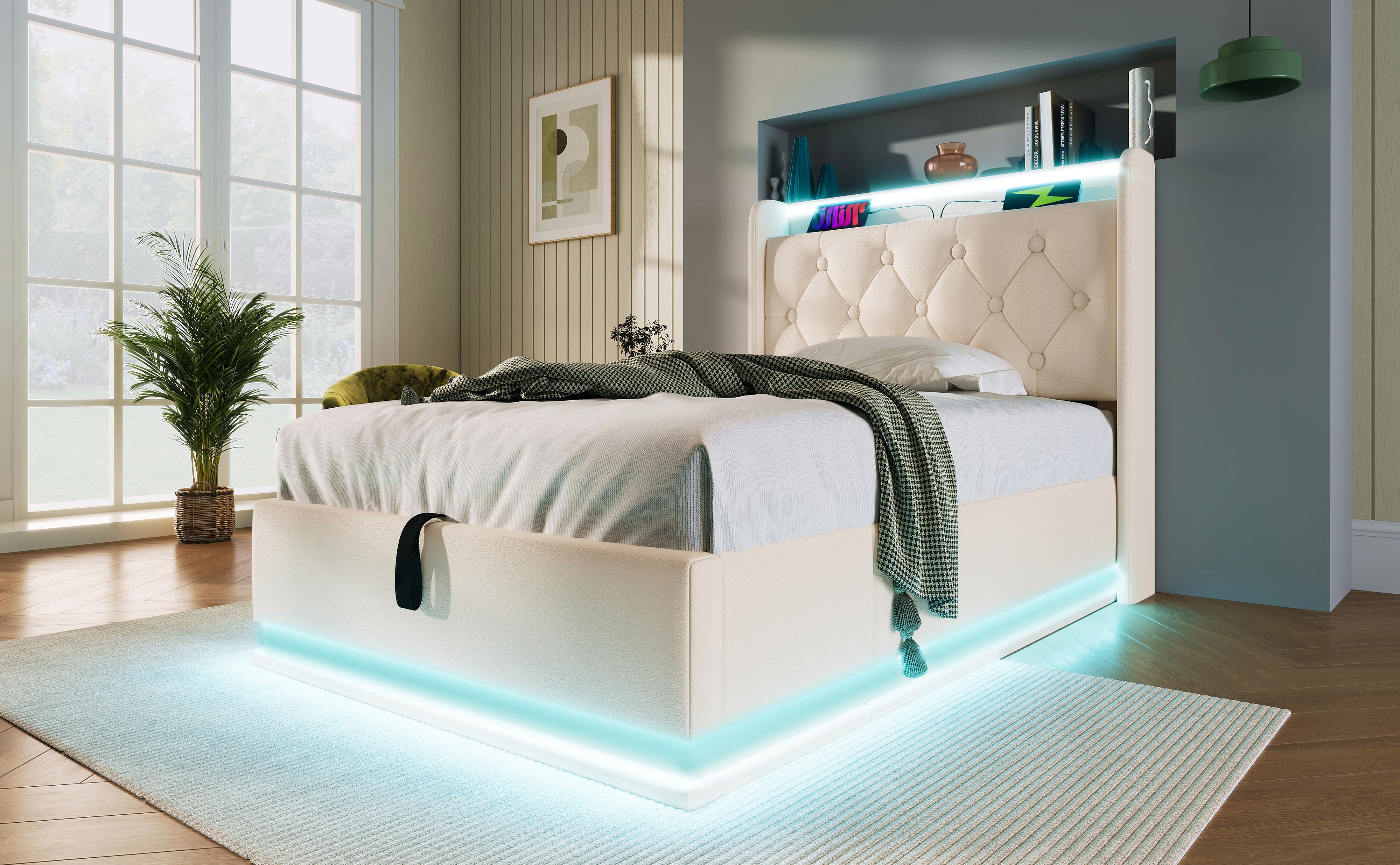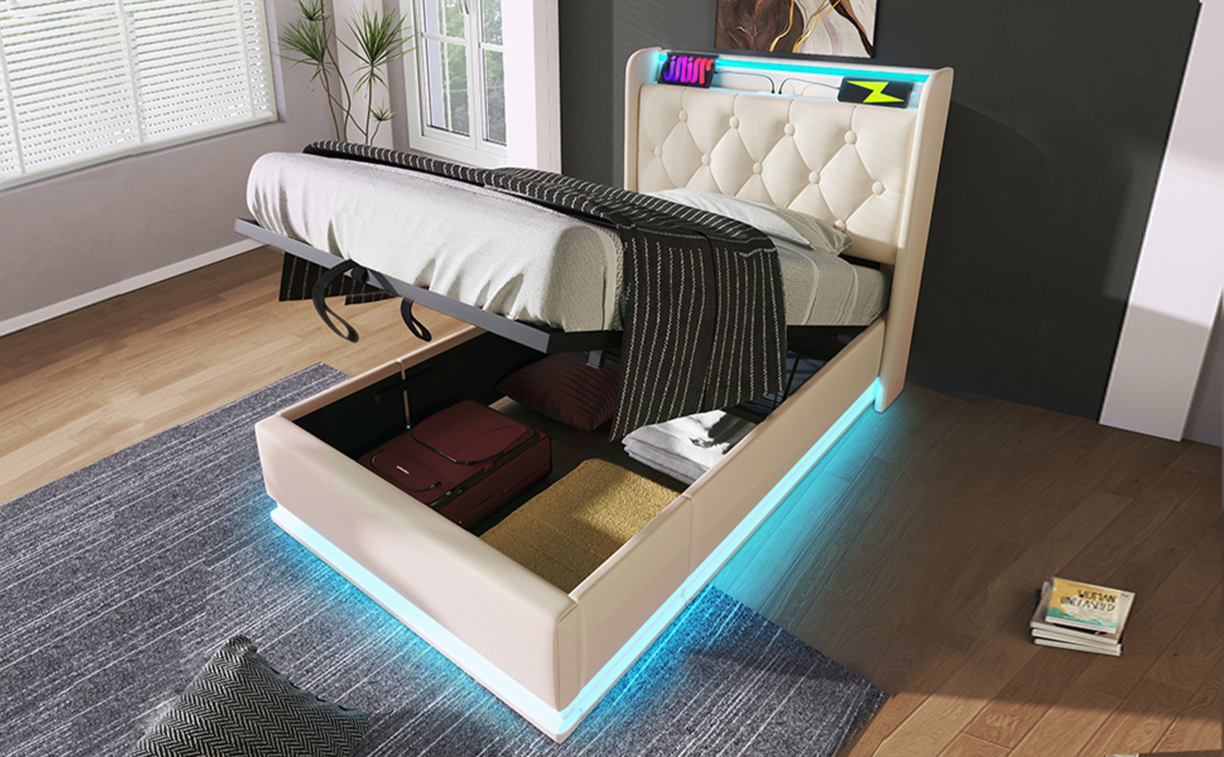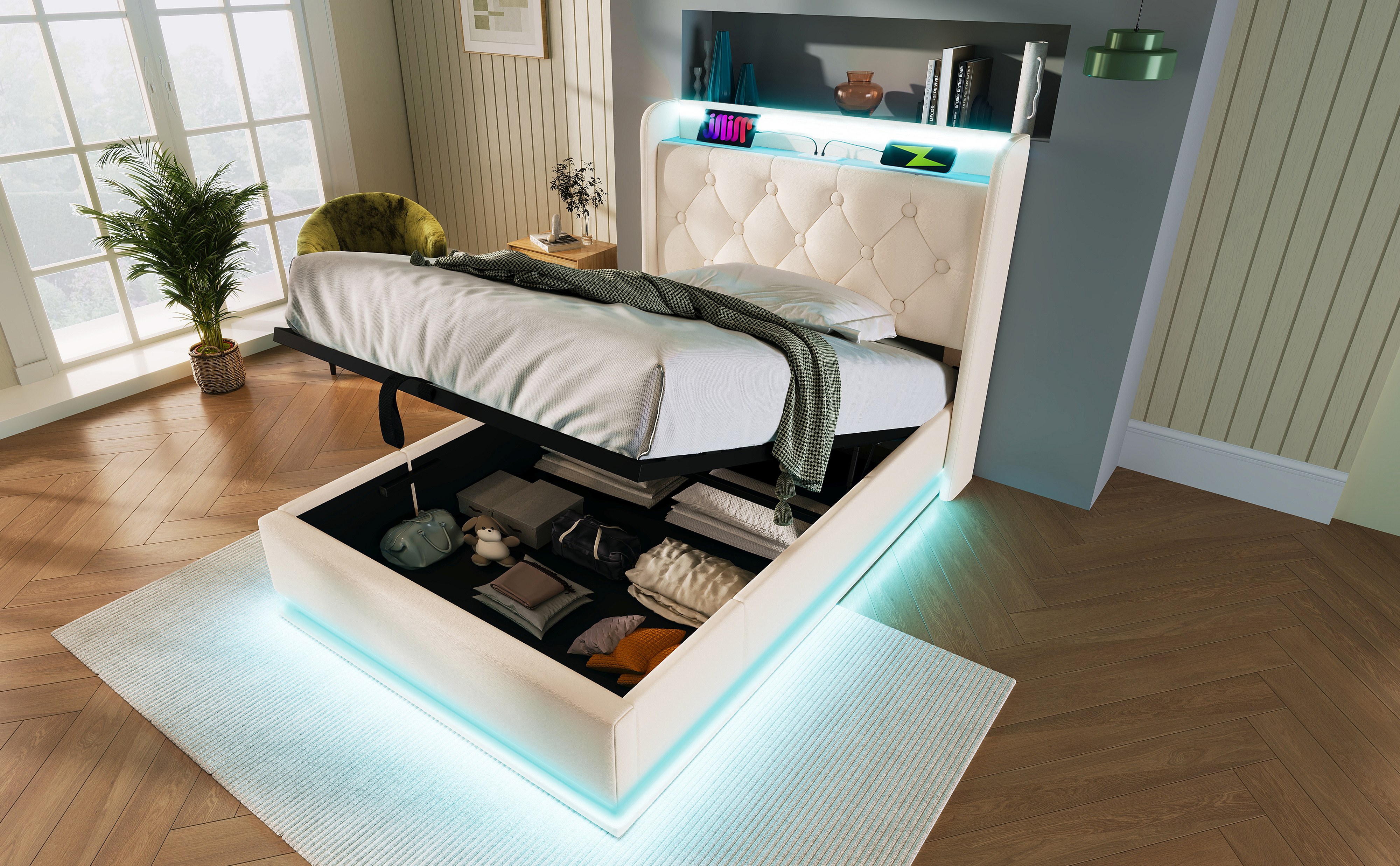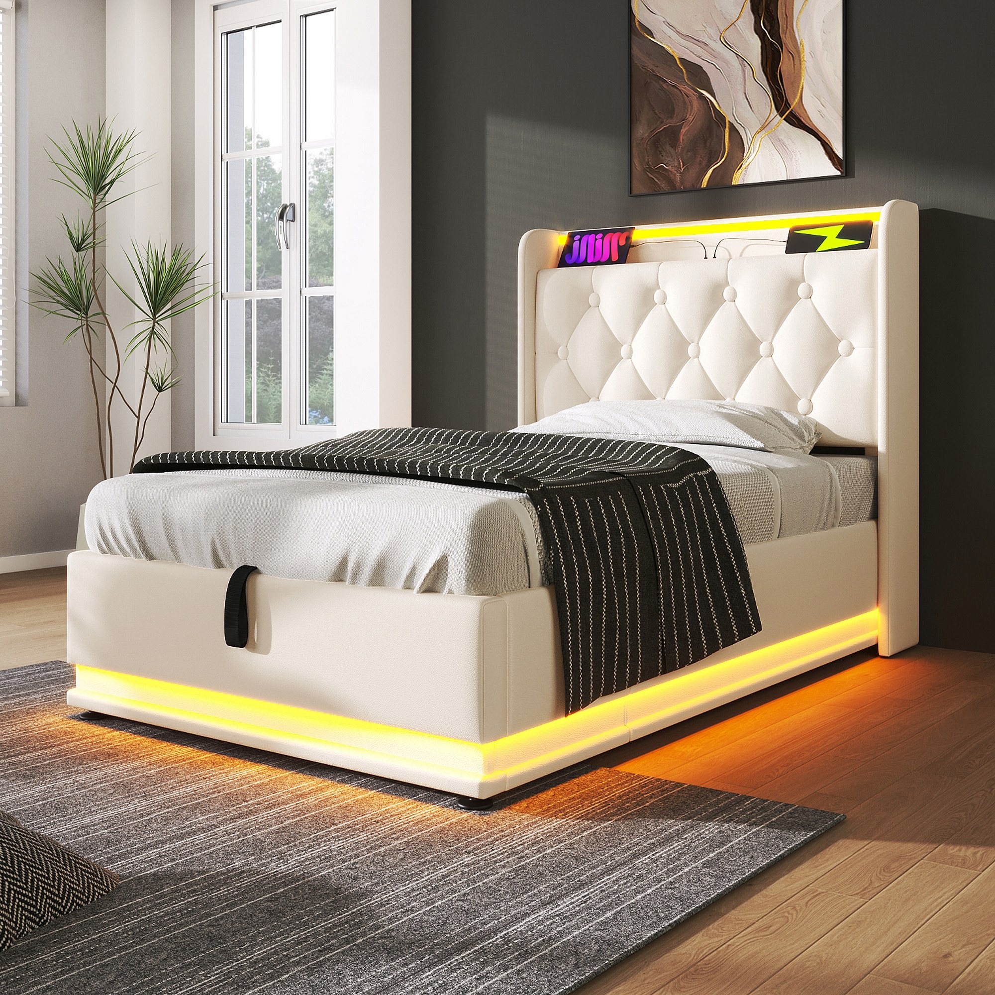 Lit simple 90×200 cm en PU blanc avec éclairage LED 360°, tête de lit rembourrée et USB