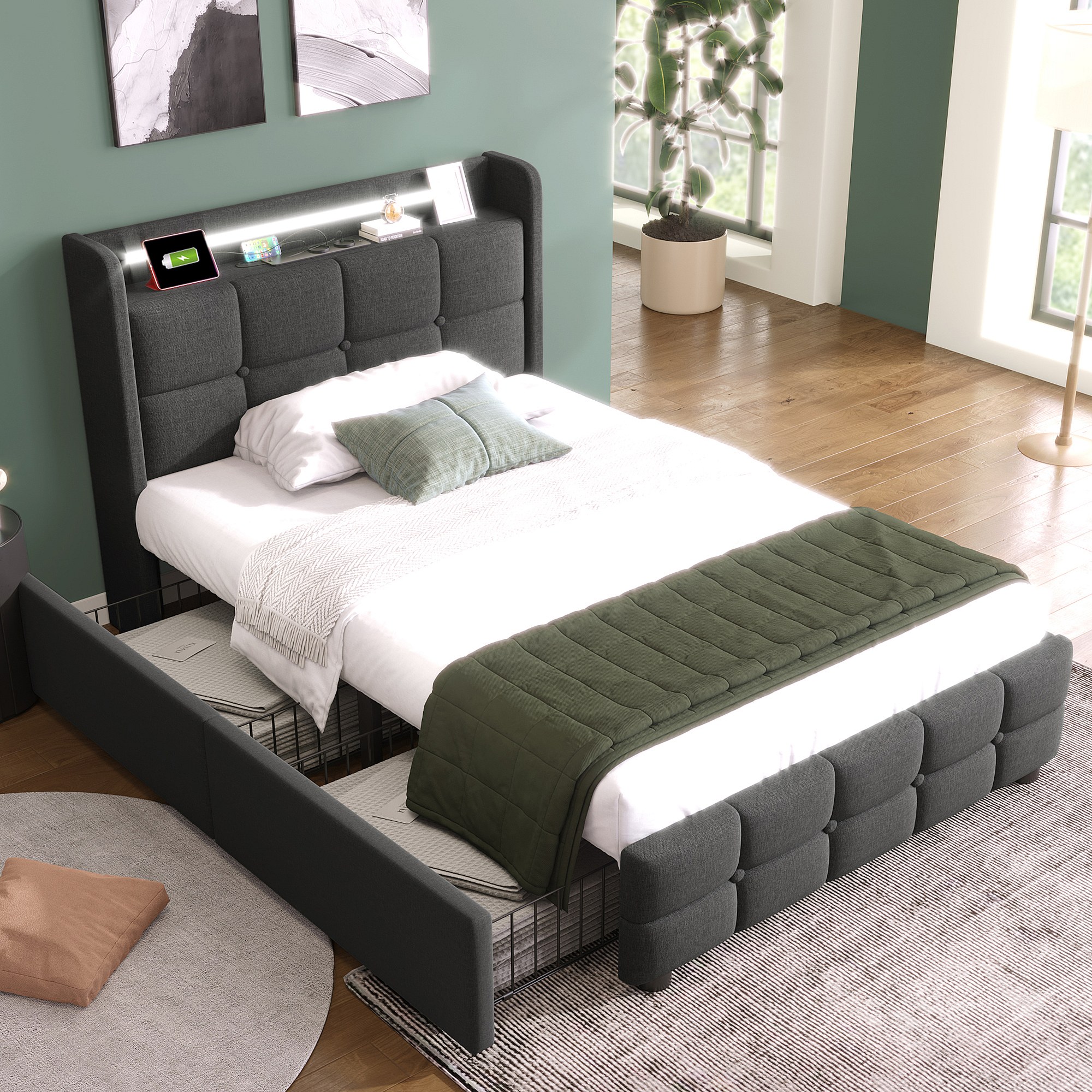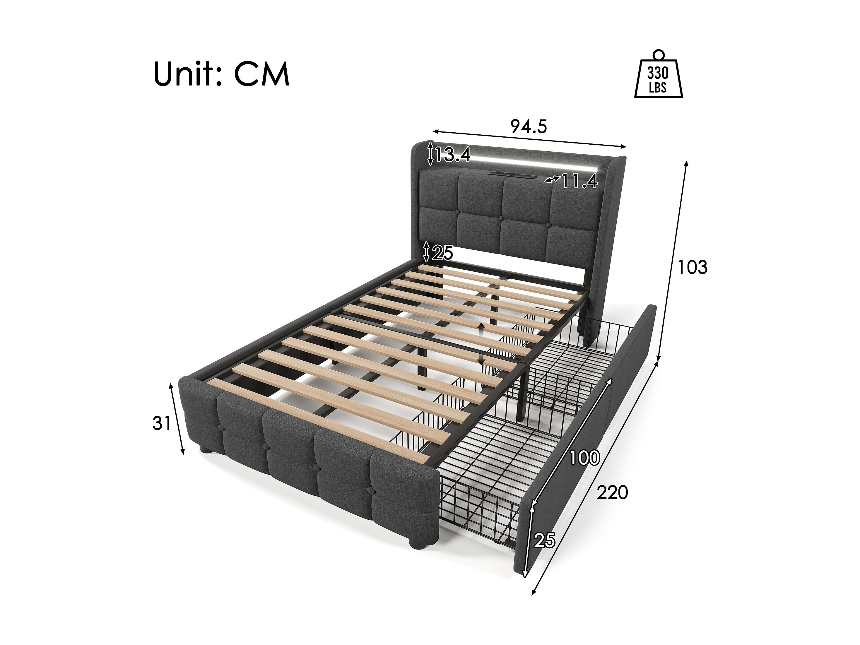 Lit simple 90×200 cm gris avec éclairage LED, prises USB et 2 tiroirs de rangement