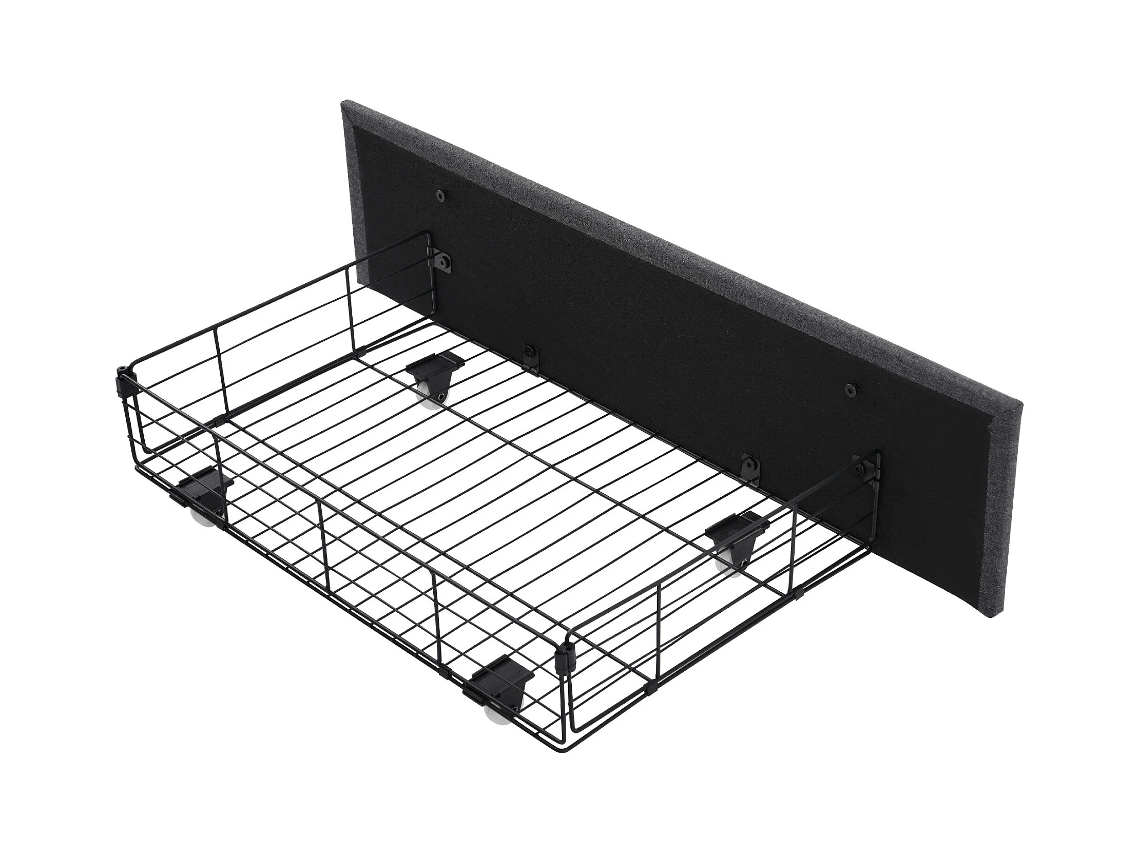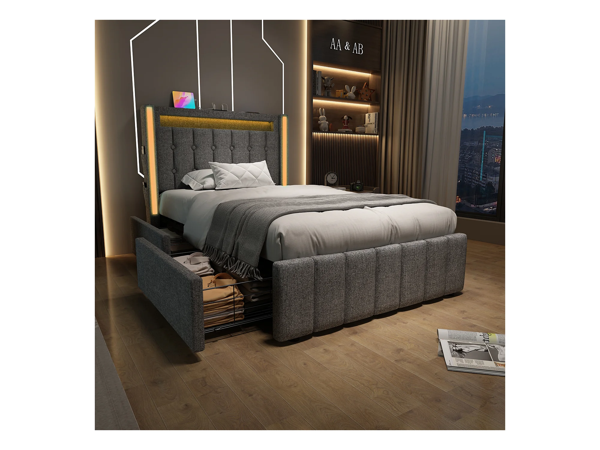 Lit simple 90x200 cm Lit jeune - Lin gris - avec chargement USB et LED - 2 tiroirs - sans matelas
