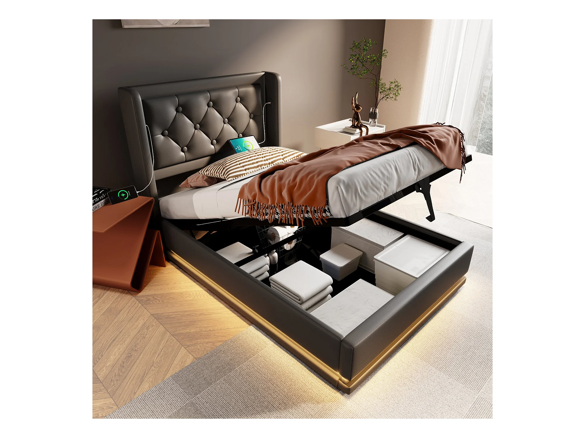 Lit simple 90x200 cm noir en PU avec LED 3 côtés, tête rembourrée, USB Type-C, lit coffre hydraulique (sans matelas)