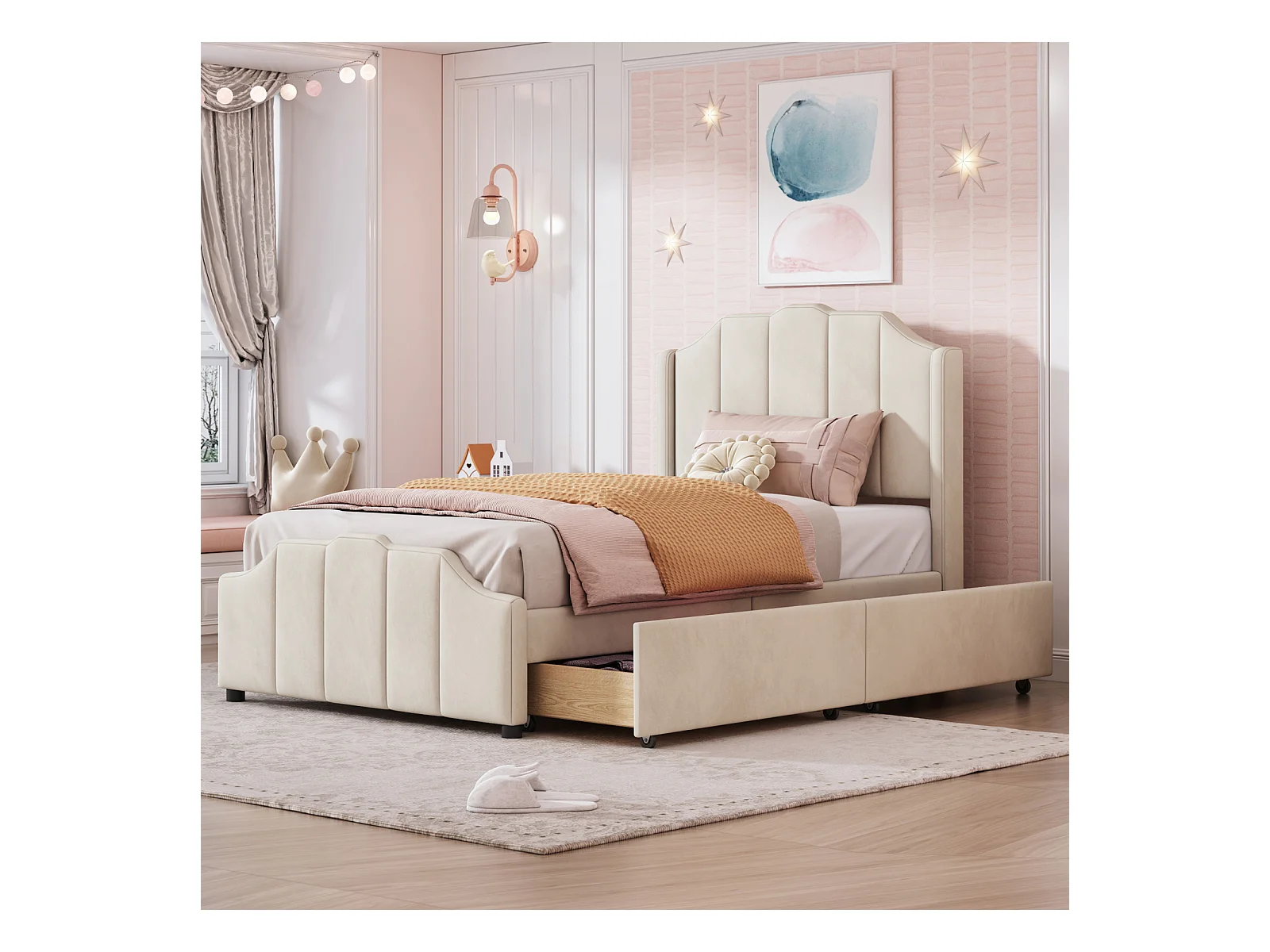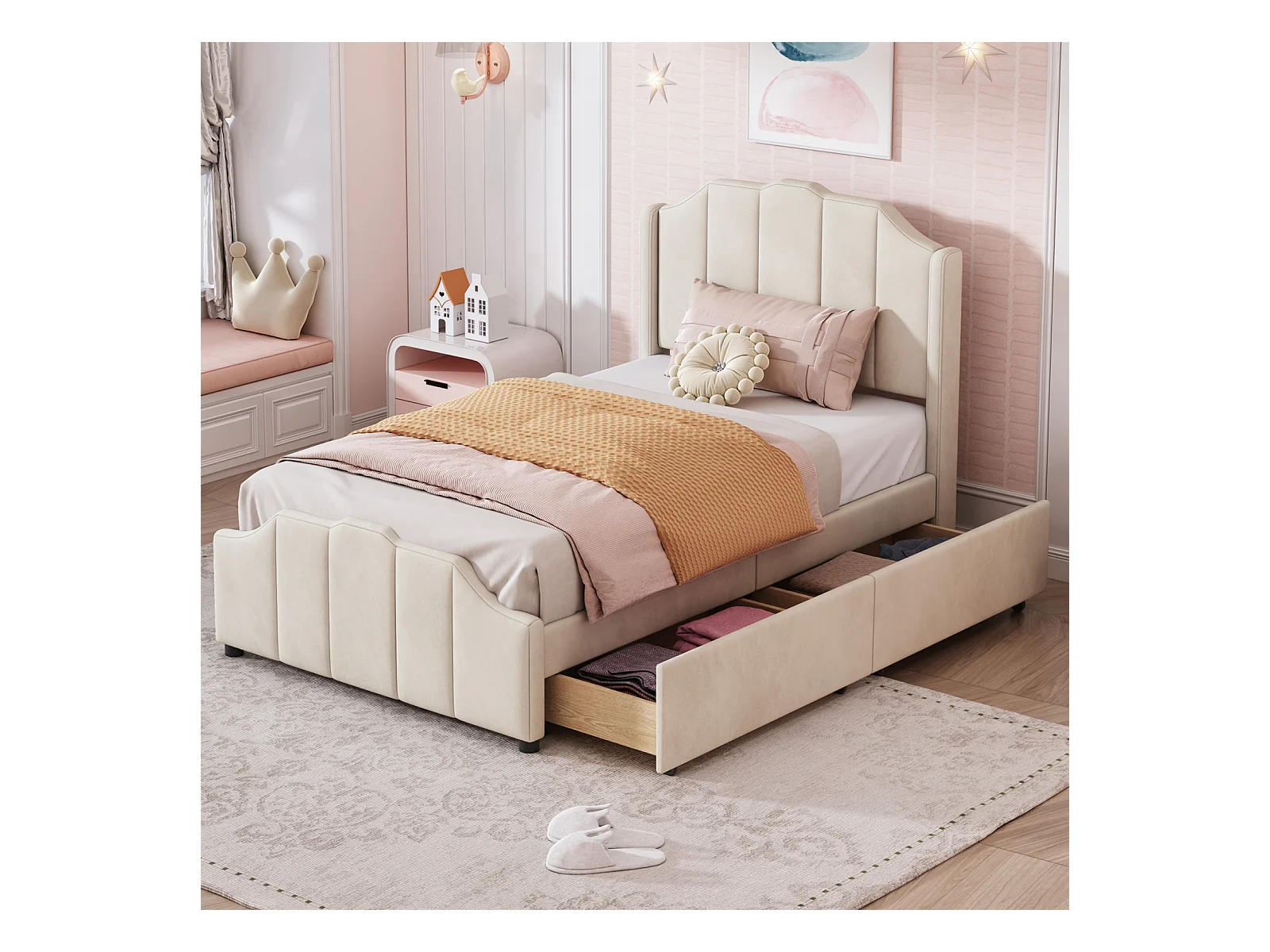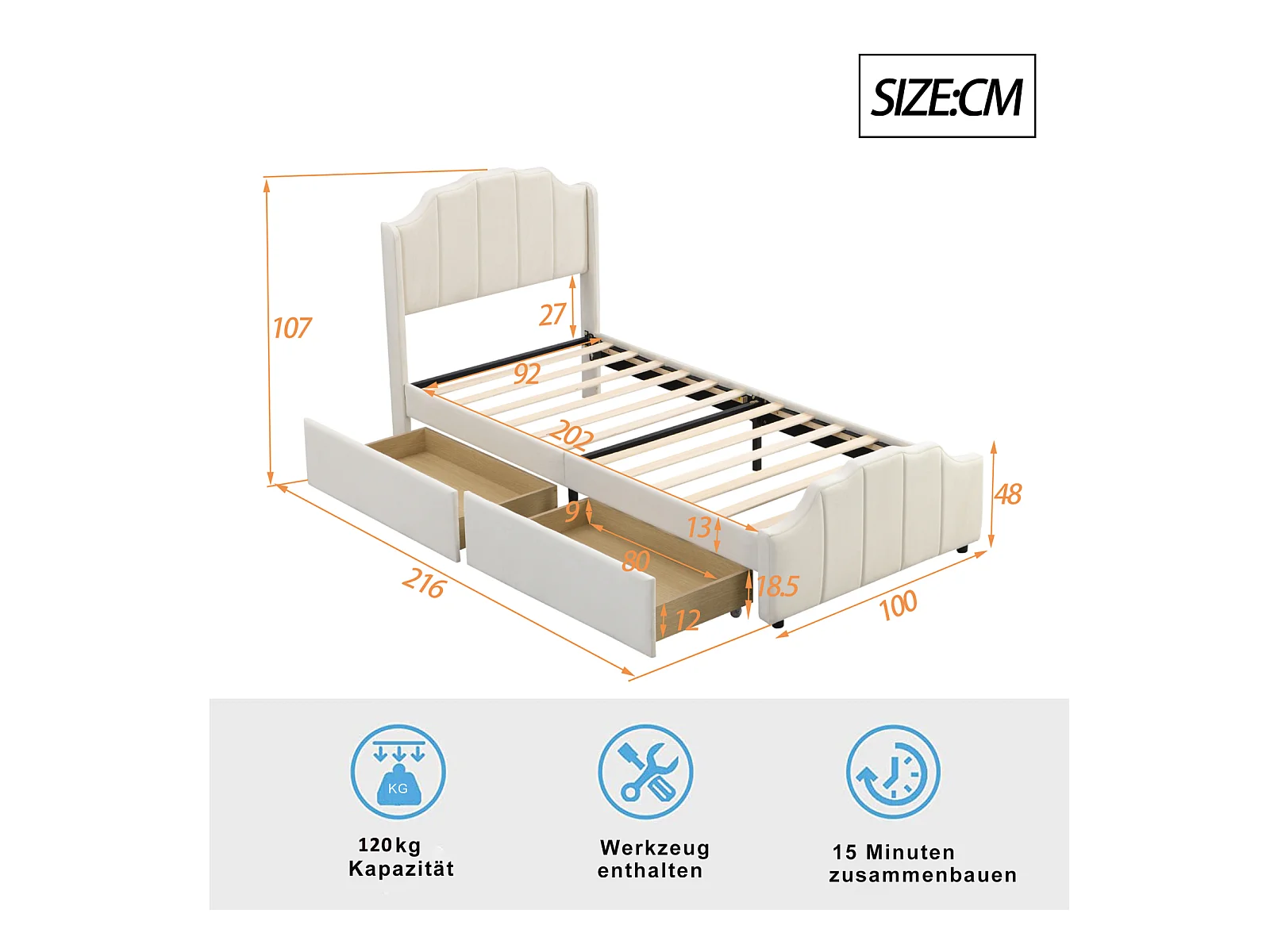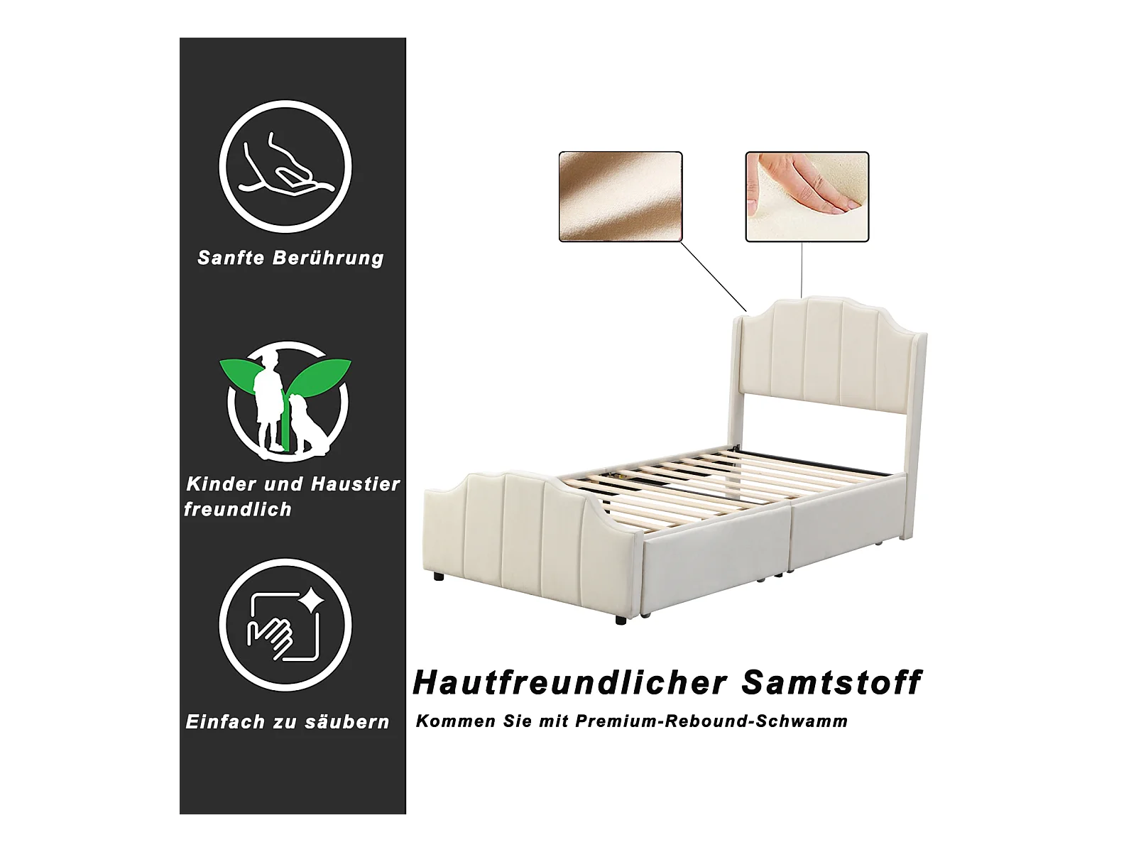 Lit simple 90x200cm avec 2 tiroirs, cadre de lit en bois avec sommier à lattes et tête de lit velours, rose
