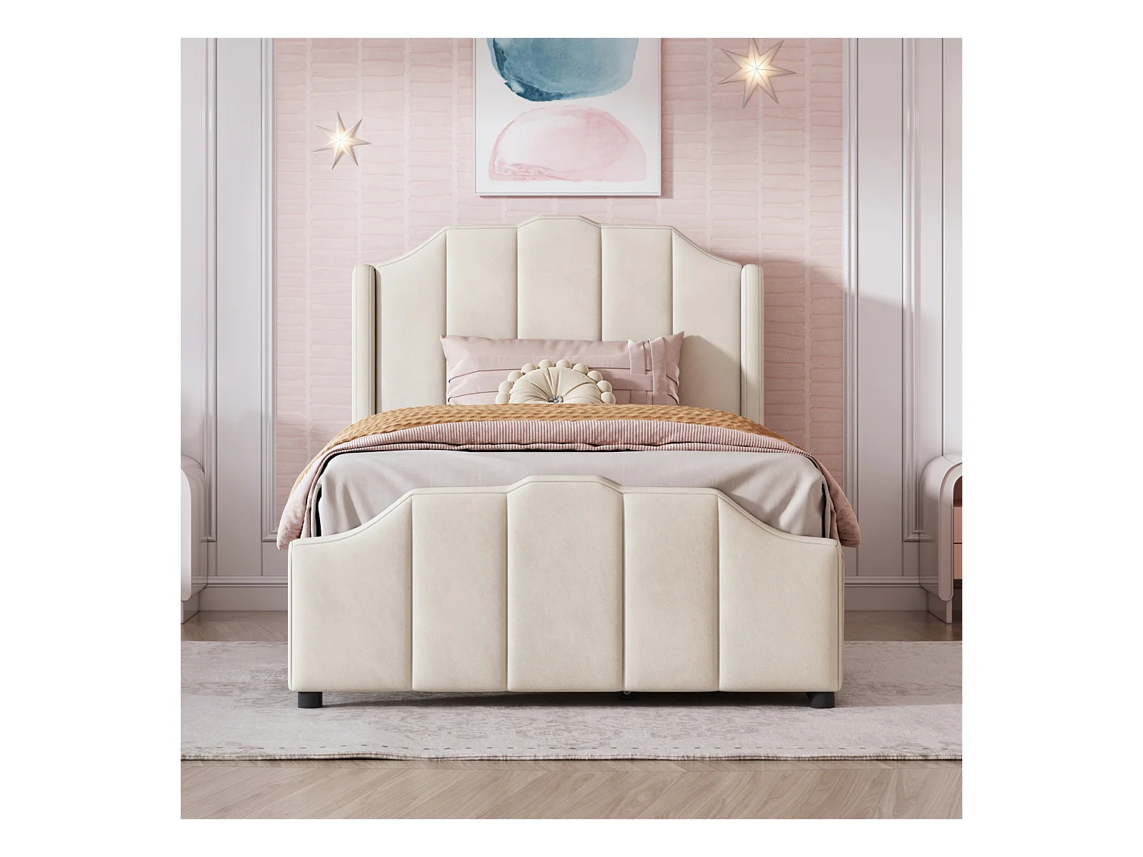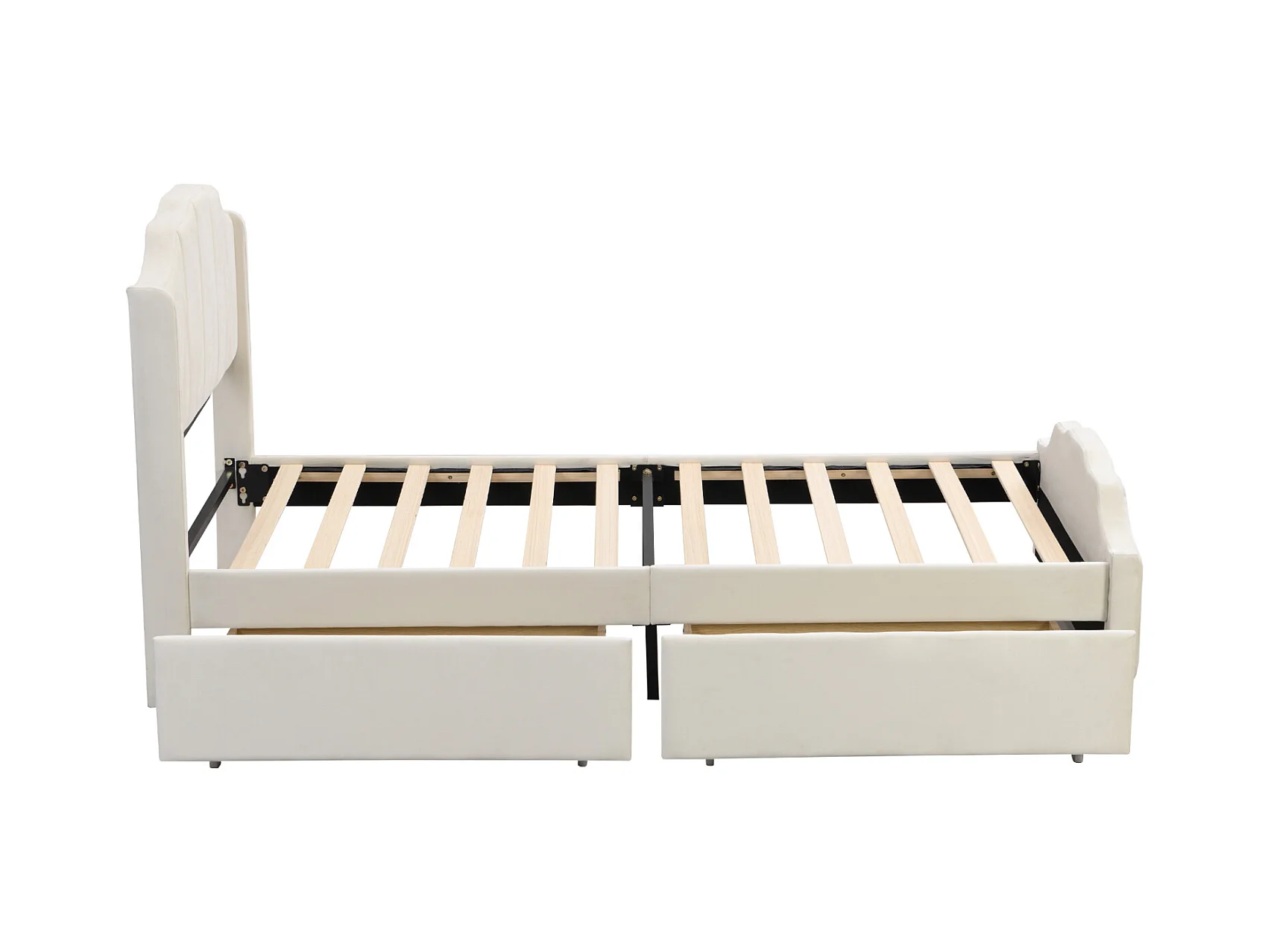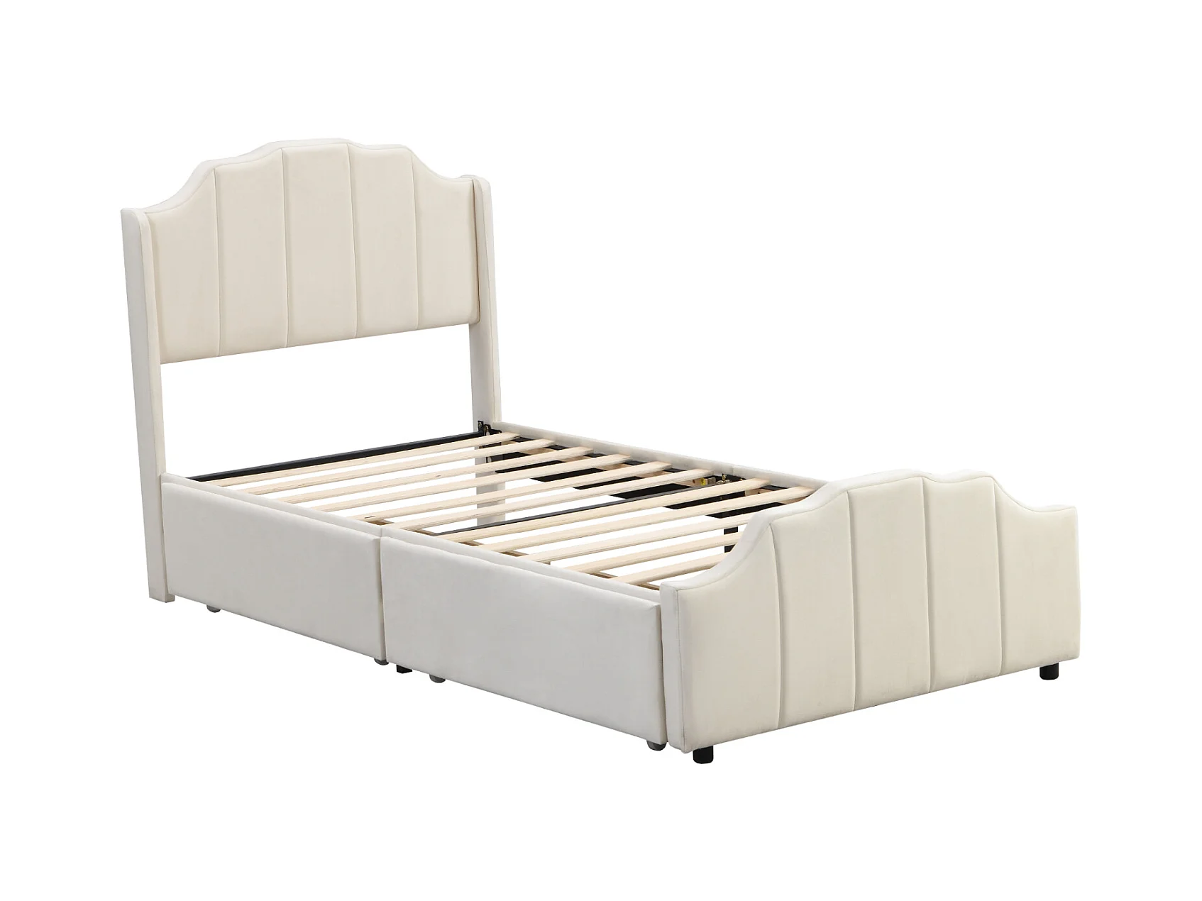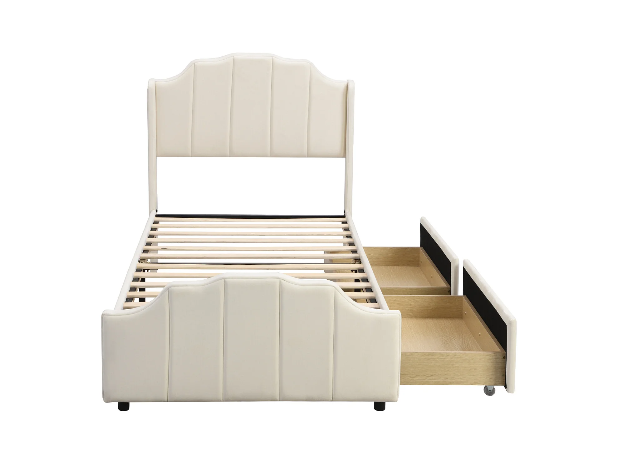 Lit simple 90x200cm avec 2 tiroirs, cadre de lit en bois avec sommier à lattes et tête de lit velours, rose
