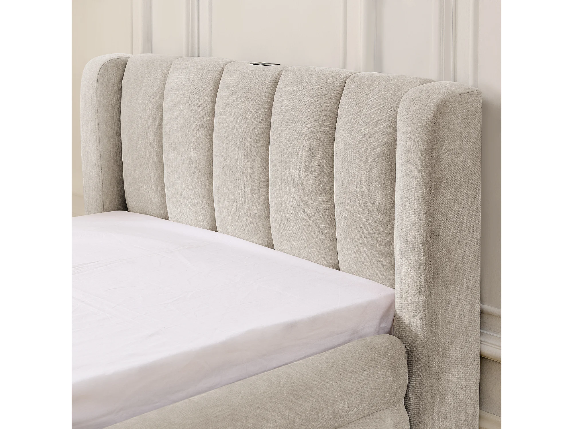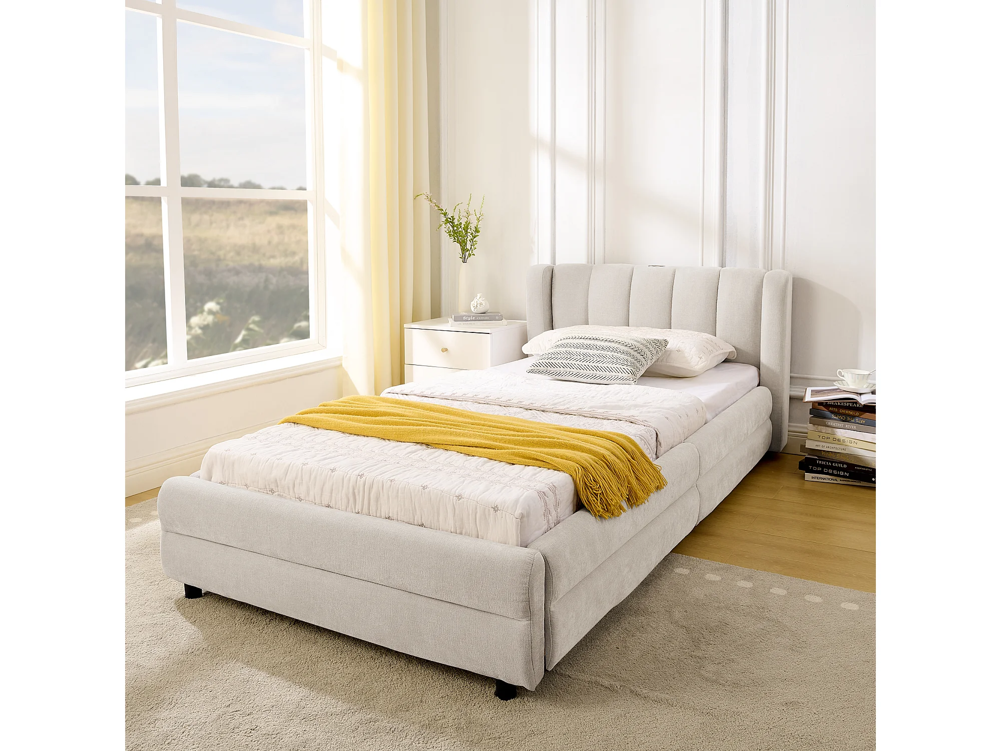 Lit simple 90x200cm avec compartiment de rangement latéral et port de chargement USB tissu doux en beige pour enfant et adulte (sans matelas)