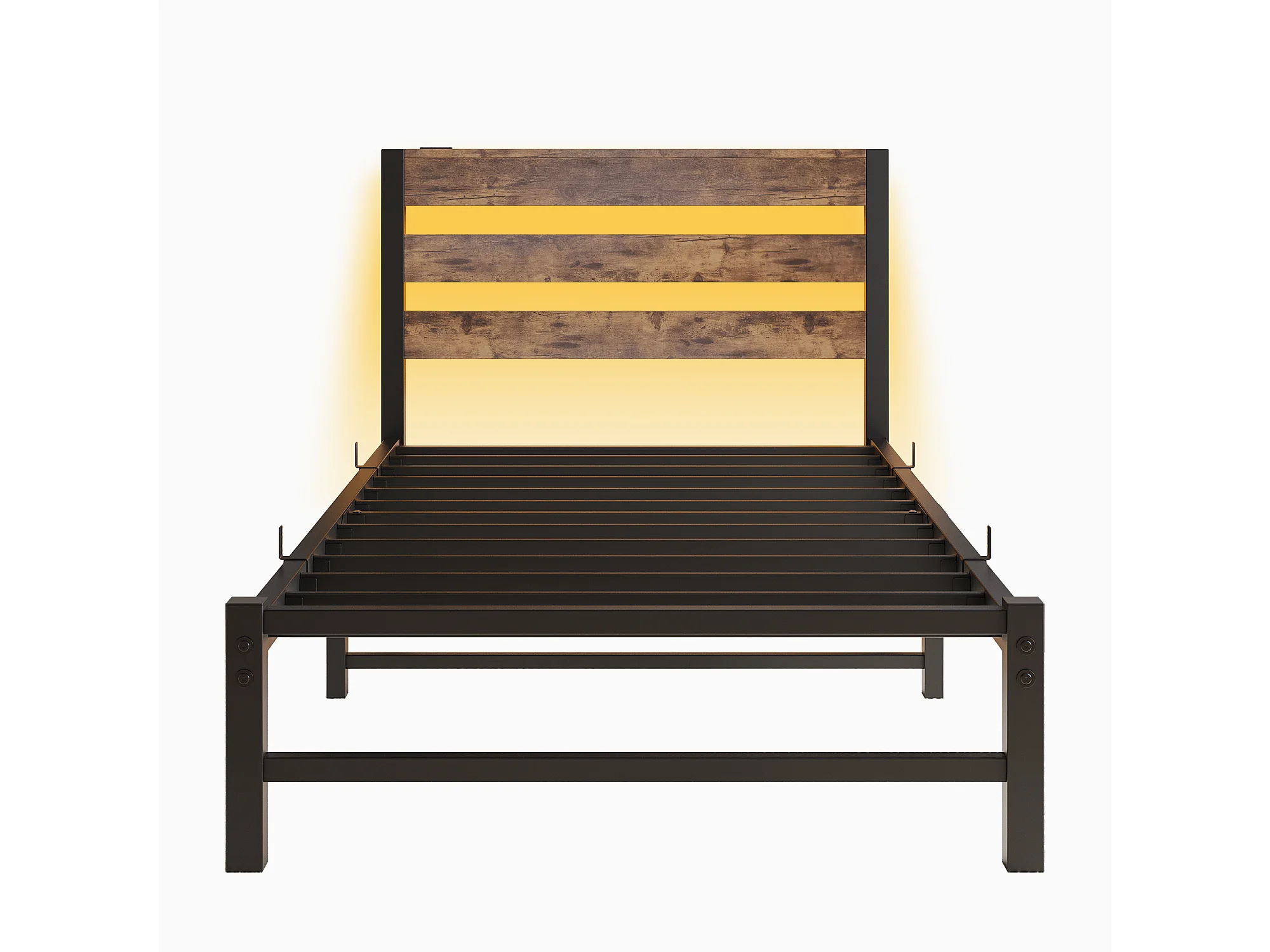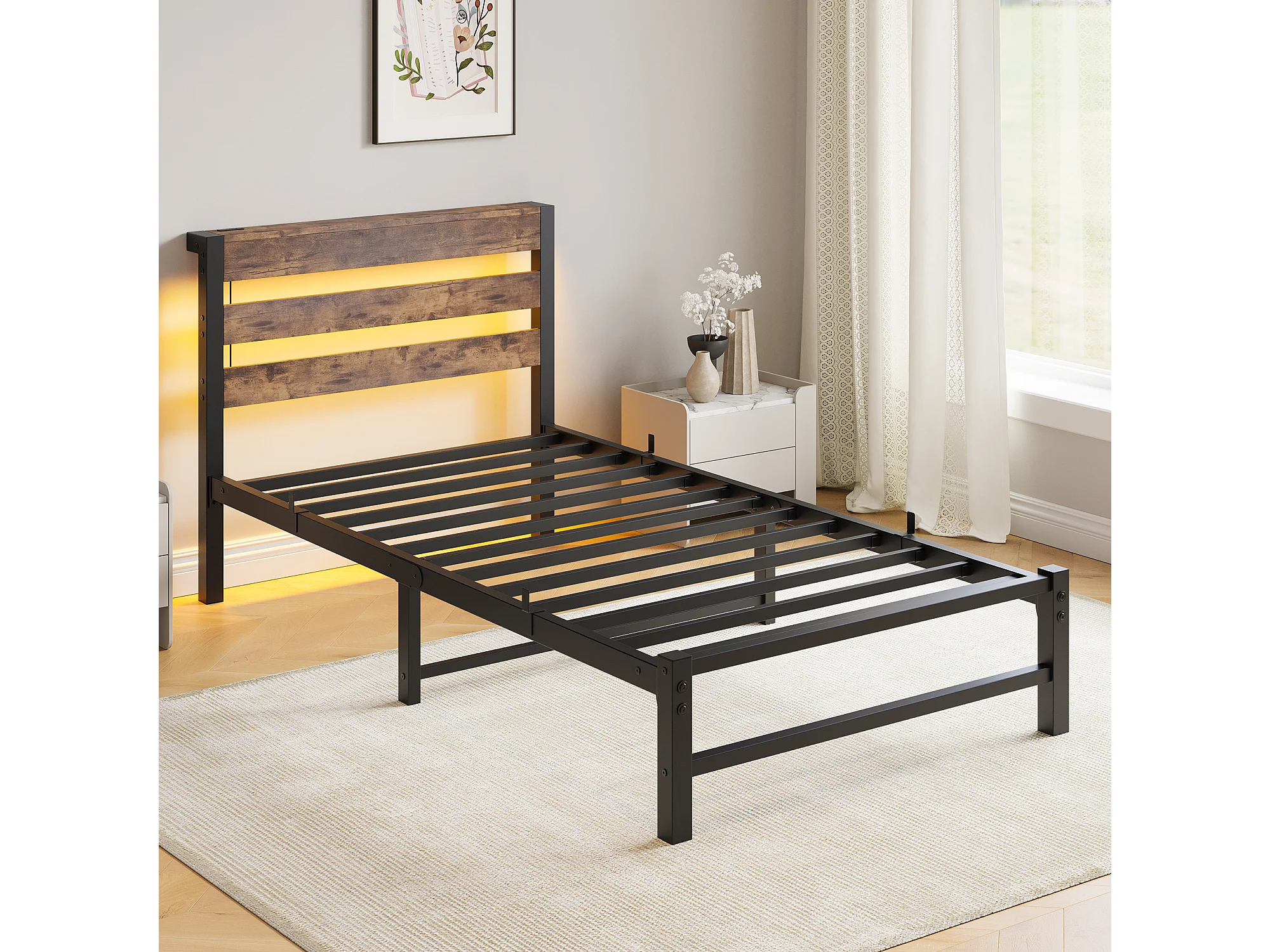 Lit simple 90x200cm avec LED et USB - Lit adulte en métal et bois- Couleur noir et bois (sans matelas)