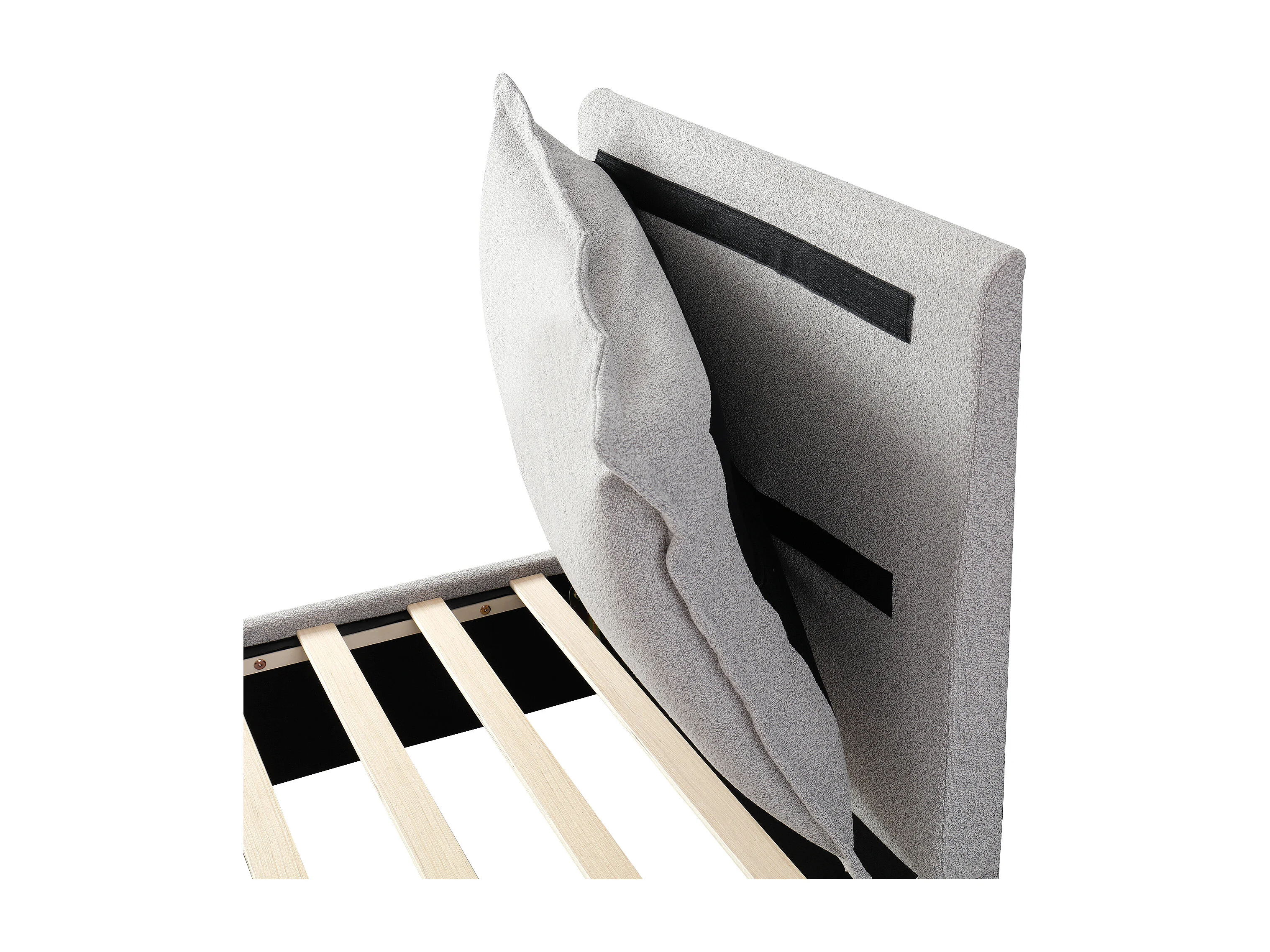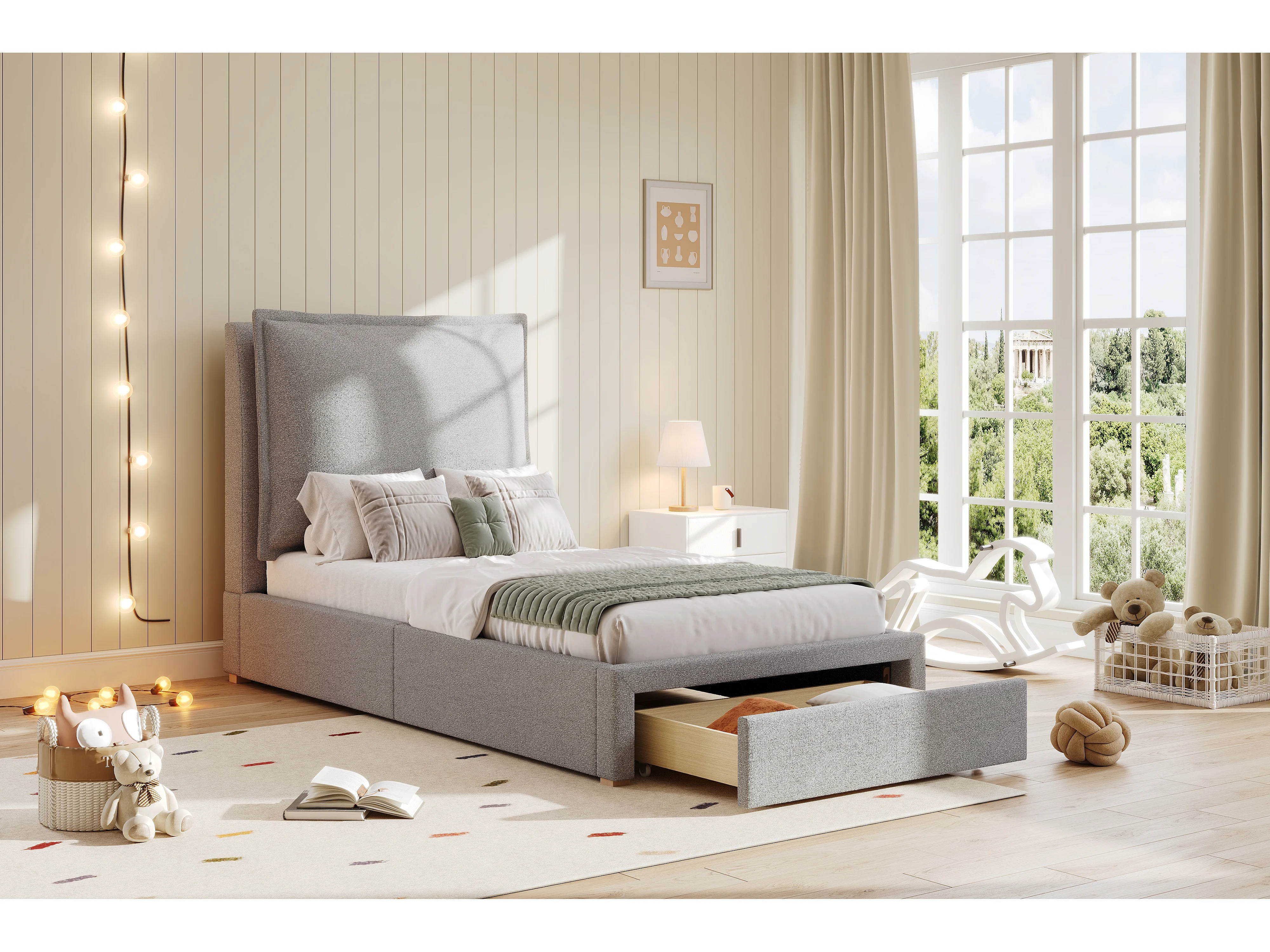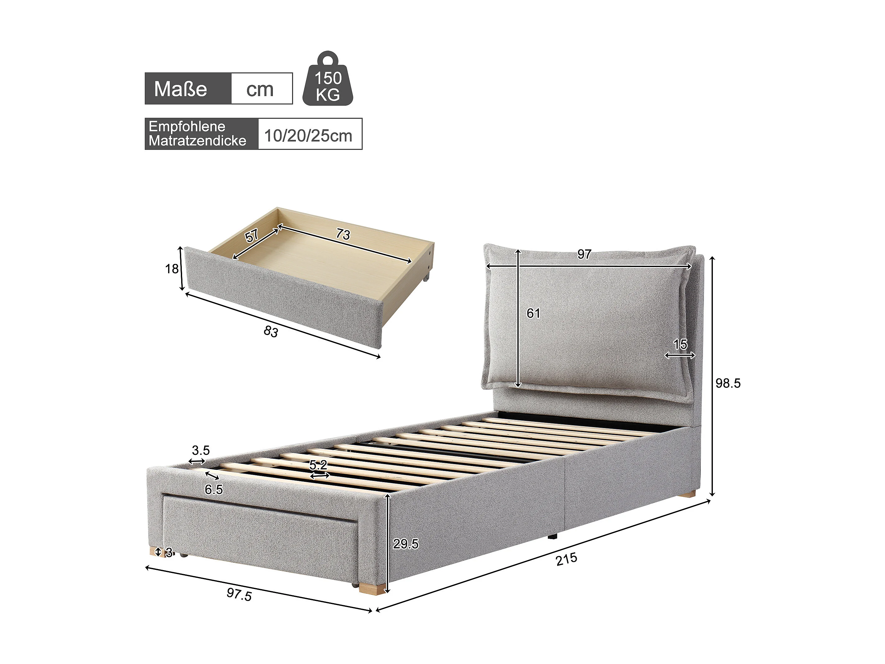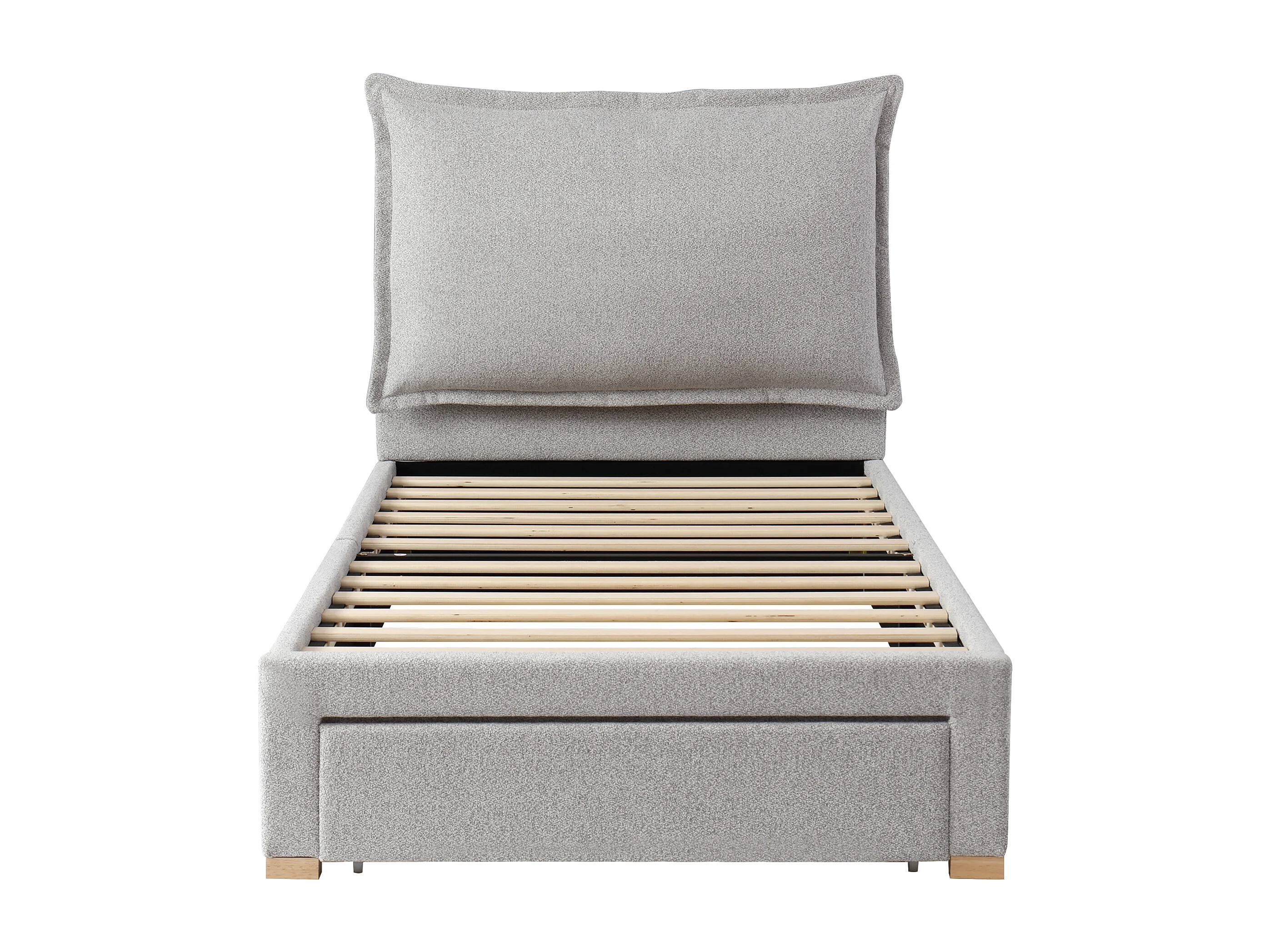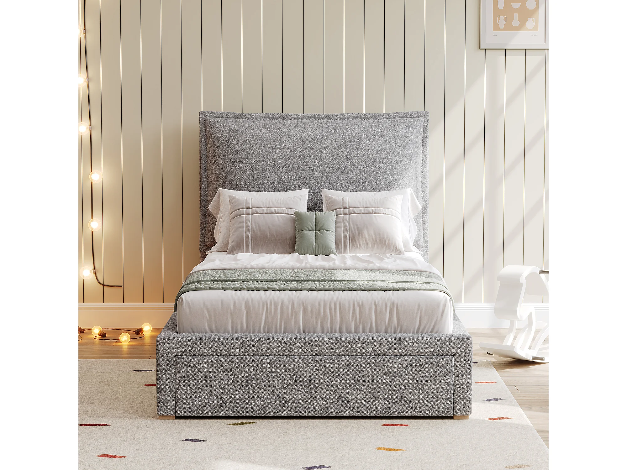 Lit simple 90x200cm avec tiroir et tête de lit rembourrée - Tissu chenille gris