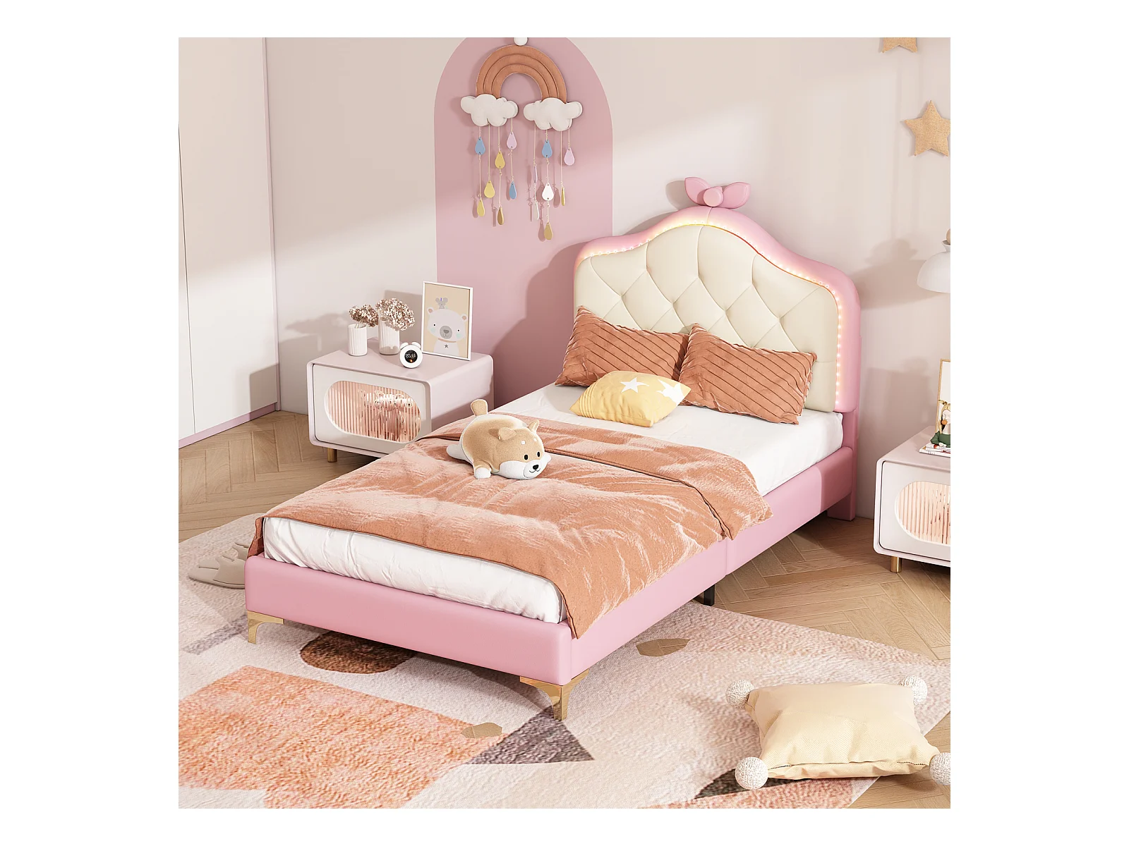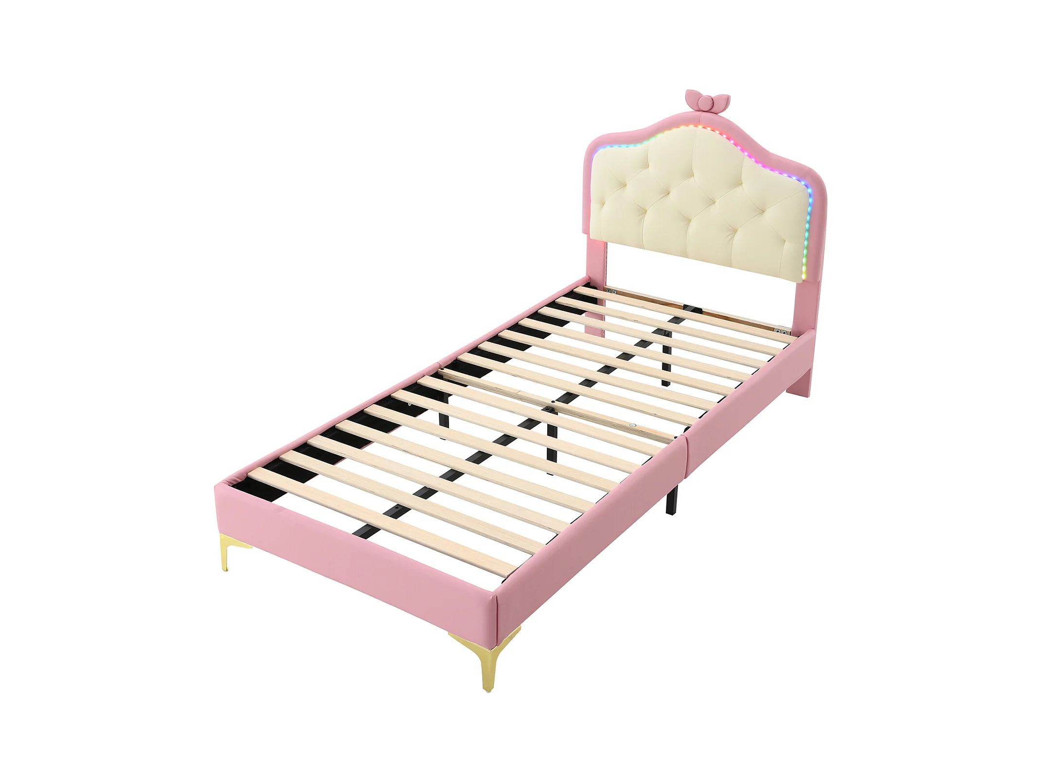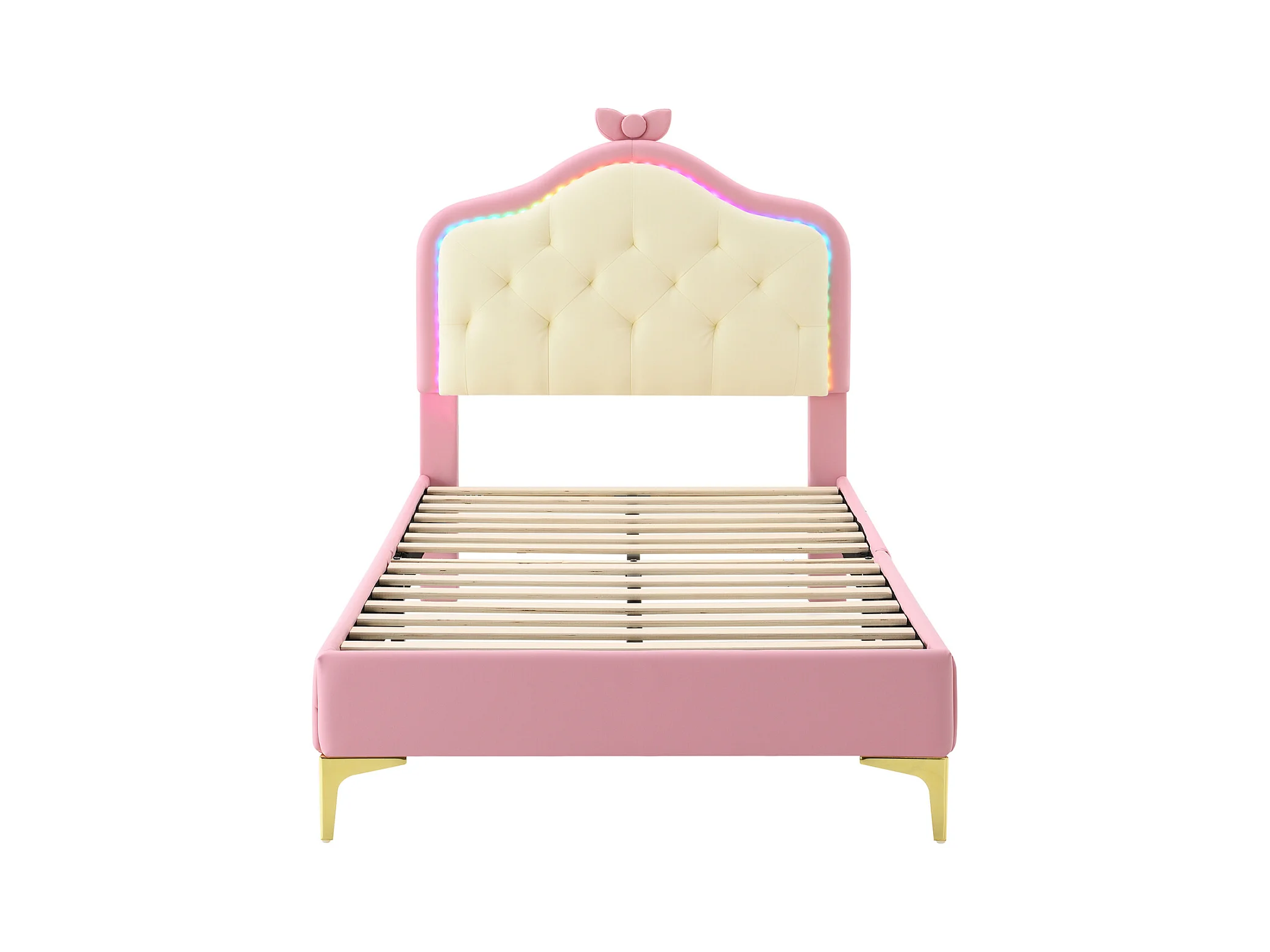 Lit simple 90x200cm, lit capitonné PU avec bandes LED couleurs variées, sommier à lattes, et tête de lit en forme de vague avec point de traction, rose