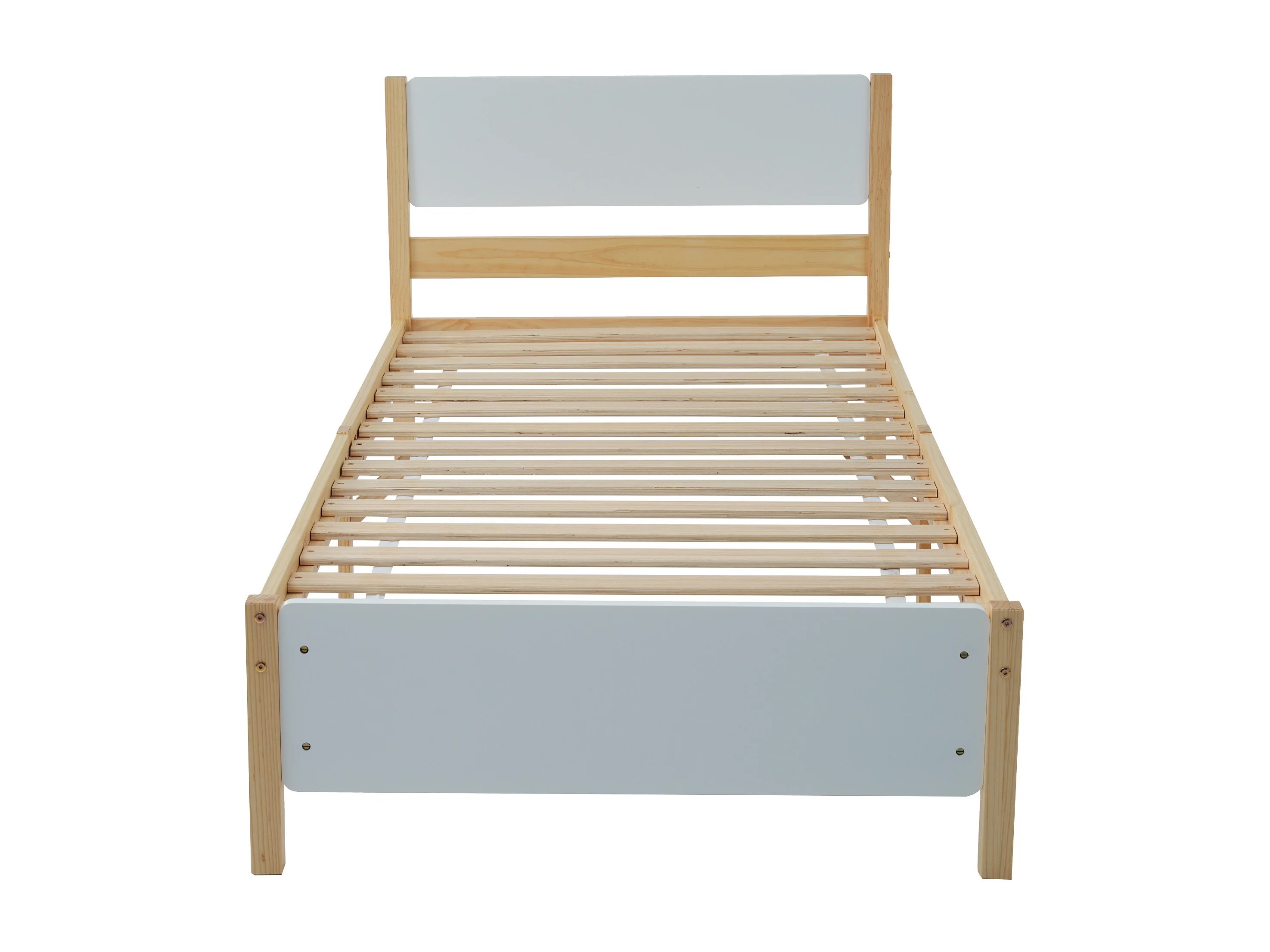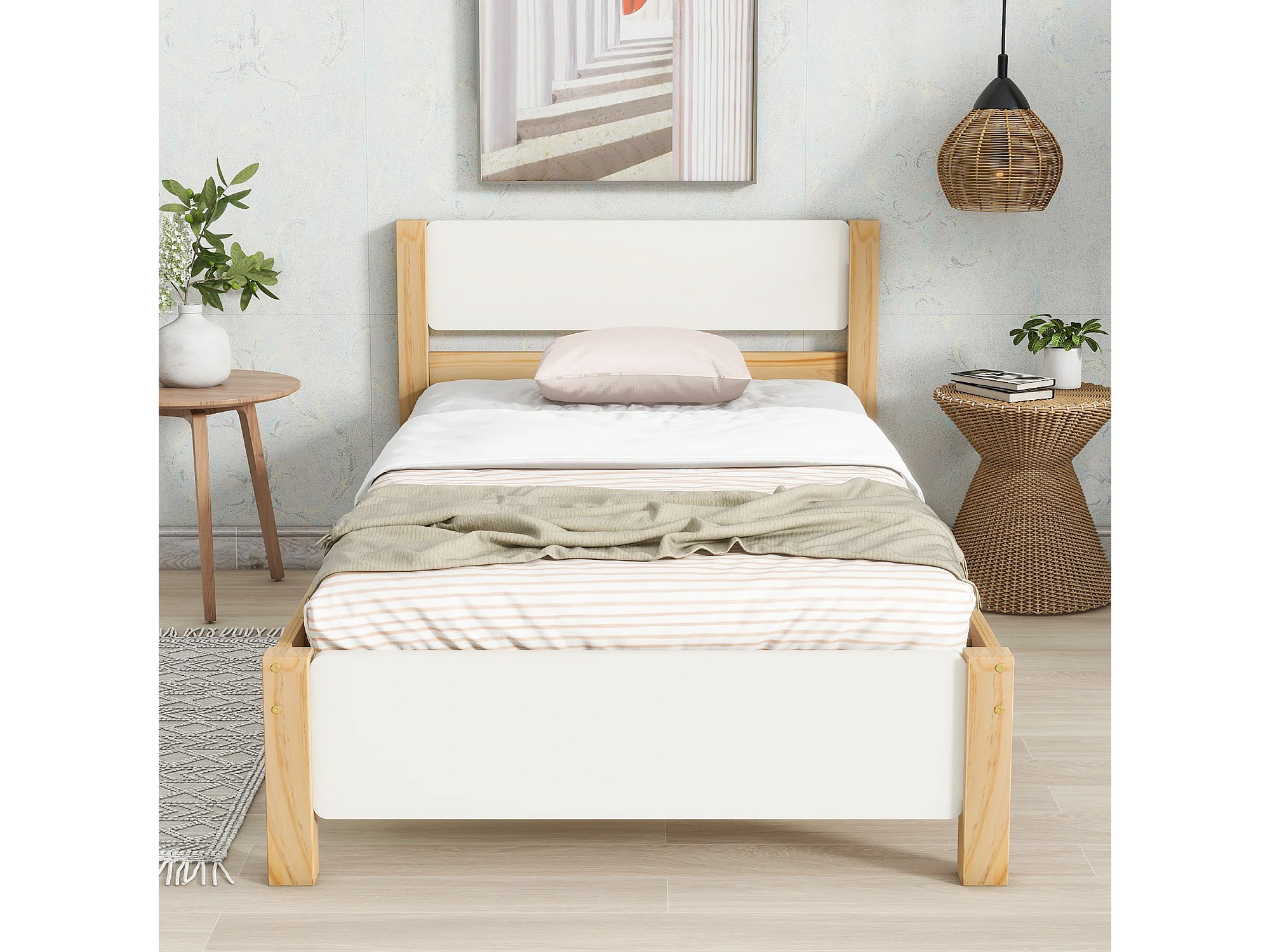 Lit simple 90x200cm, lit en bois, cadre en pin avec support central, lit enfant, lit adulte, MDF, blanc et naturel, sans matelas