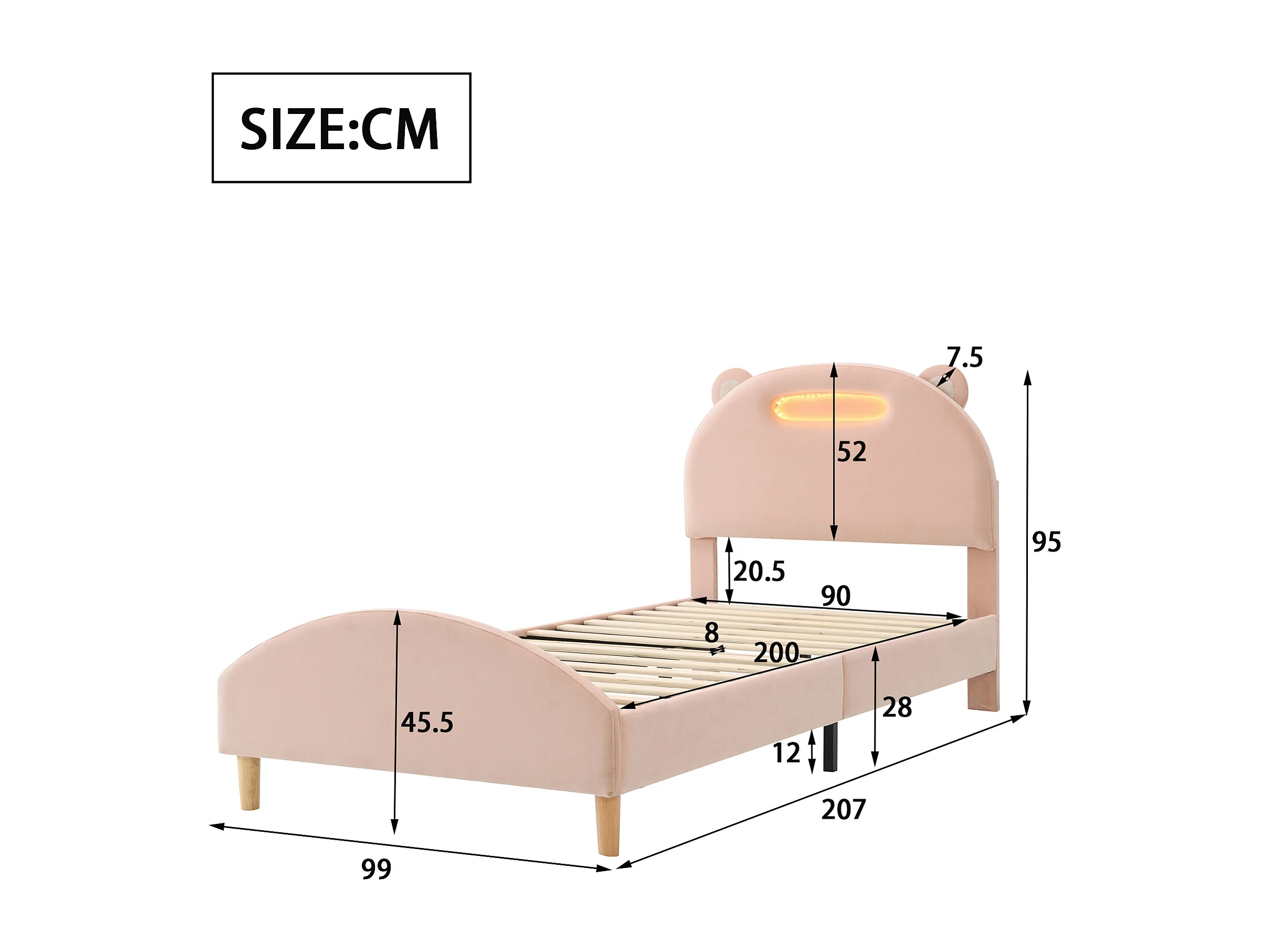 Lit simple adolescent 90x200cm, lit rembourré avec bande LED, tête de lit drôle en forme de tête d'ours, velours, rose