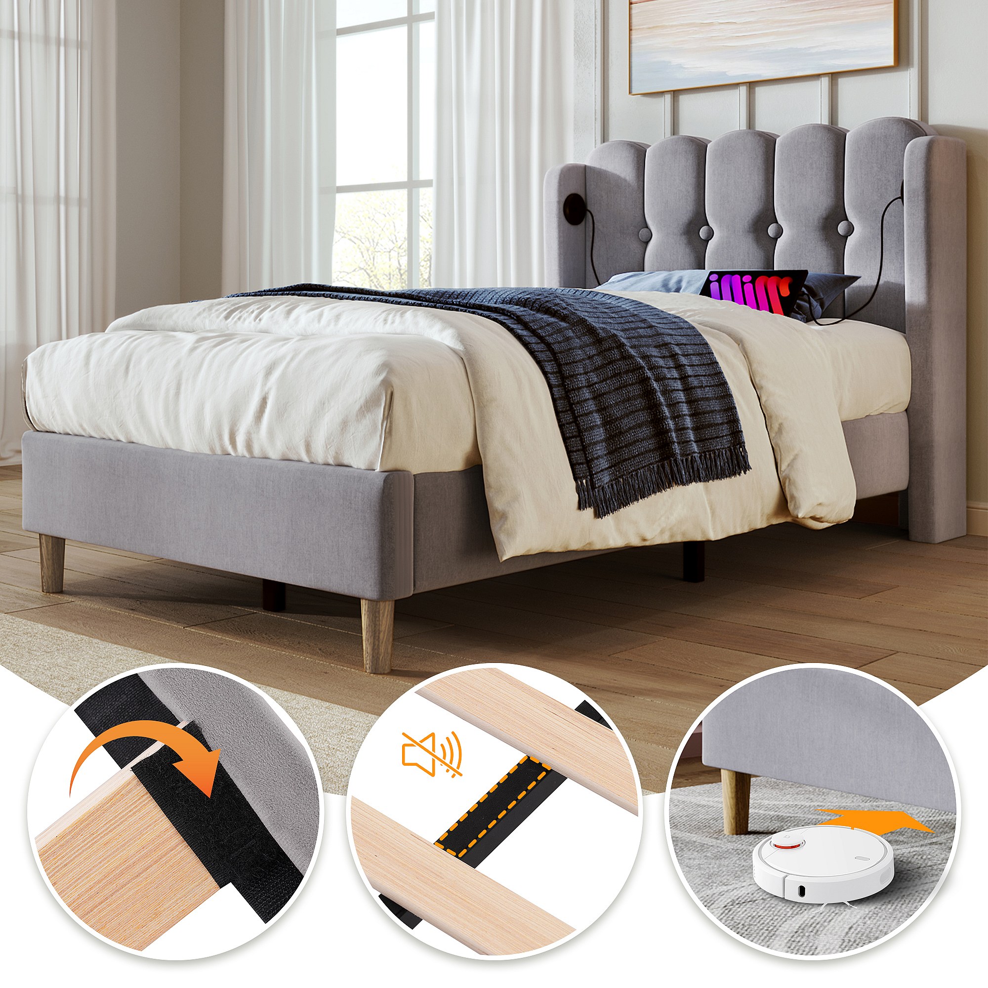 Lit simple avec fonction de chargement USB Type C, cadre de lit en lin gris 90 x 200 cm avec sommier