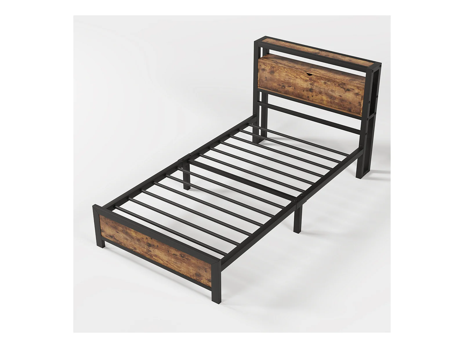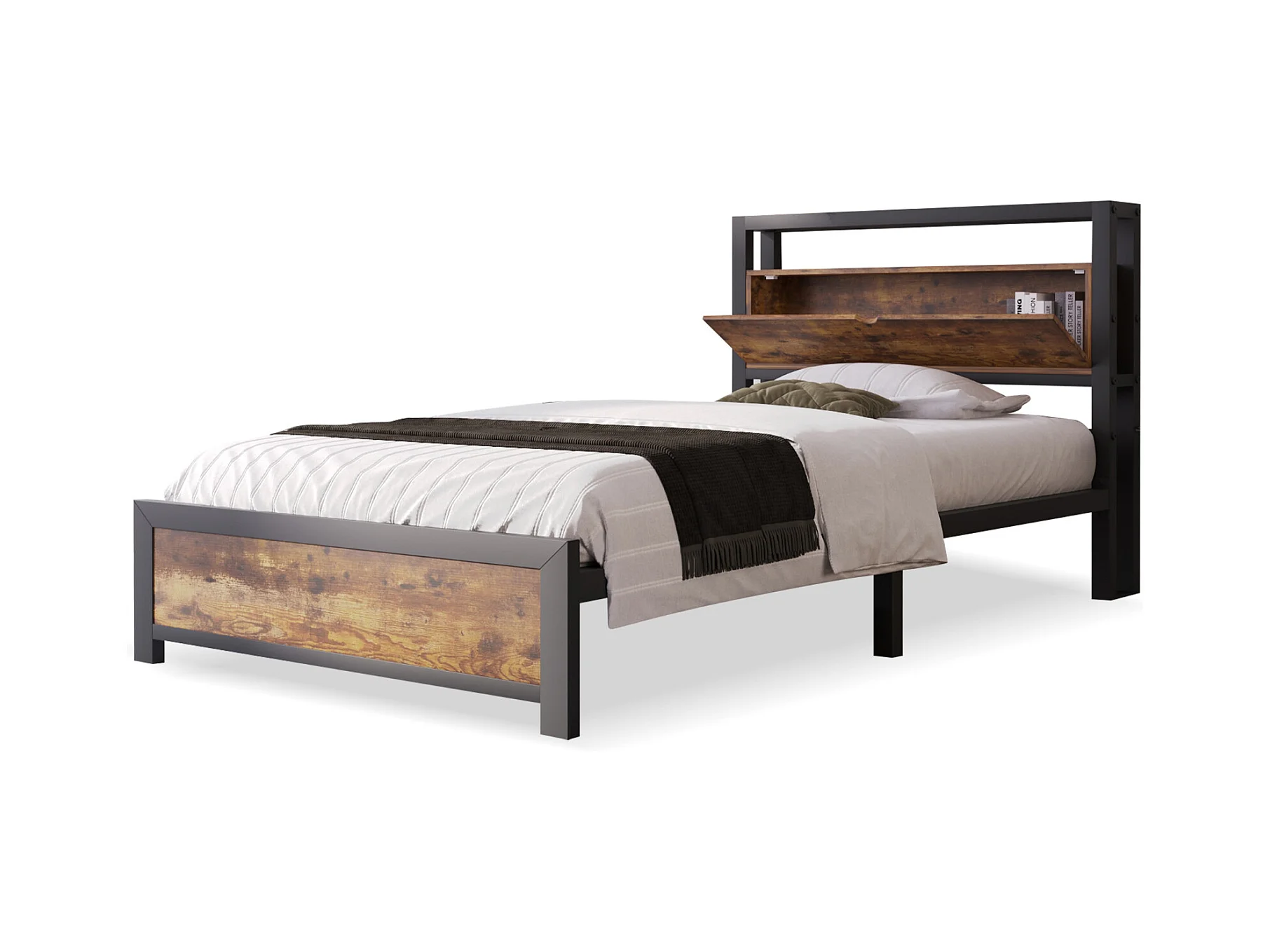 Lit simple avec rangement 90 x 200 cm - Lit ado avec tête de lit rangement et piètement en métal, style industriel - noir