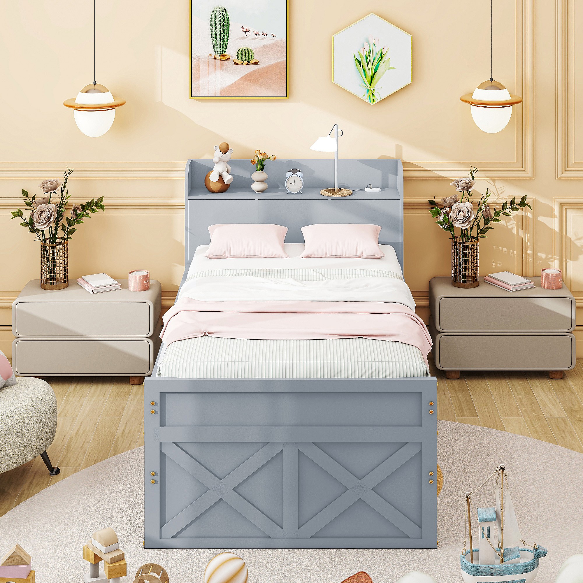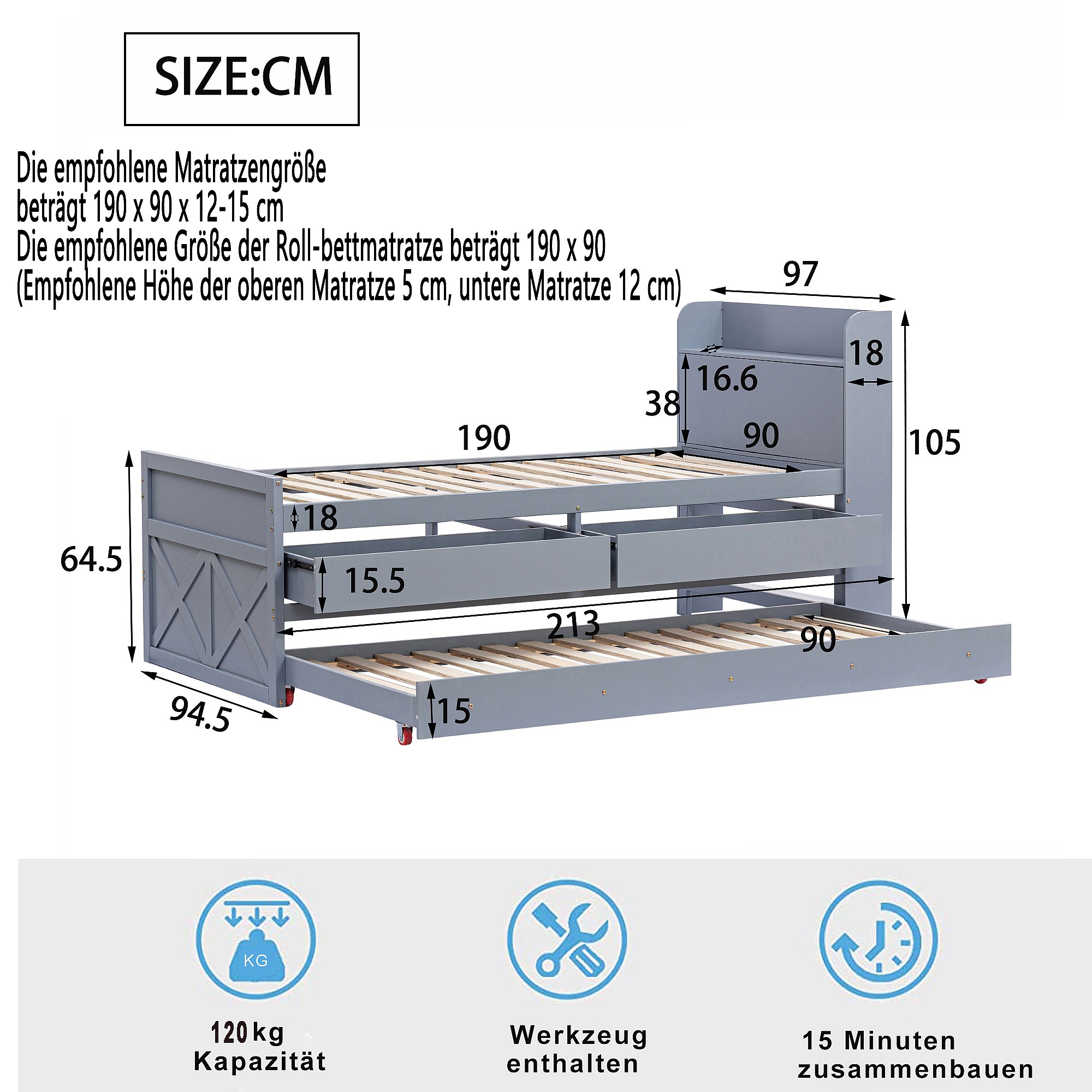 Lit simple bois massif pin 90x190 cm, tiroir extensible, sommier à lattes, table de nuit avec prise USB, gris.