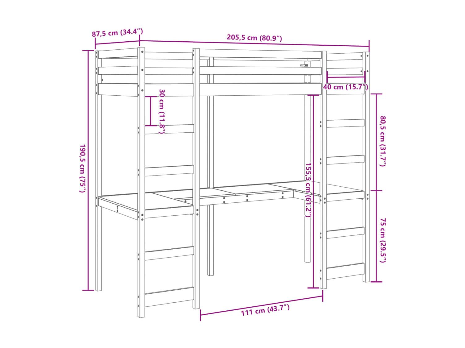 Ce lit superposé polyvalent intègre un lit simple avec un bureau, offrant un espace de couchage confortable et un espace de travail spacieux. C'est un choix idéal pour les maisons à l'espace limité.Cadre stable et durable : le bois de pin massif est connu pour sa résistance et sa durabilité. Ses grains droits et ses nœuds distinctifs contribuent à son charme rustique.Optimisez l'utilisation de l'espace : ce cadre de lit est doté d'un bureau en dessous, ce qui permet d'utiliser efficacement l'espace sous le lit pour créer une zone confortable pour travailler et étudier. Il s'agit d'un choix idéal pour les espaces plus petits ou plus confinés.Facile à monter et à descendre : ce cadre de lit est doté de deux échelles intégrées qui permettent aux utilisateurs de monter et de descendre facilement.Garde-corps pour une sécurité accrue : ce cadre de lit est équipé de garde-corps pour éviter que vous ne tombiez du lit pendant votre sommeil.Sommier à lattes pour un soutien optimal : le cadre de lit est équipé d'un sommier à lattes qui assure le soutien et la respirabilité de votre matelas.Attention :Pour éviter qu'il ne bascule, ce produit doit être utilisé avec le dispositif de fixation murale fourni.Bon à savoir :Un matelas n'est pas inclus avec ce lit. Nous offrons une sélection variée de matelas. Vous pouvez consulter notre boutique pour trouver un matelas assorti.Les vis et les chevilles pour l'intérieur du mur ne sont pas incluses. Nous vous conseillons de trouver et d'utiliser des vis et des chevilles adaptées spécifiquement à vos murs. Si vous n'êtes pas sûr, vous pouvez consulter un professionnel. Veuillez lire et suivre chaque étape des instructions.