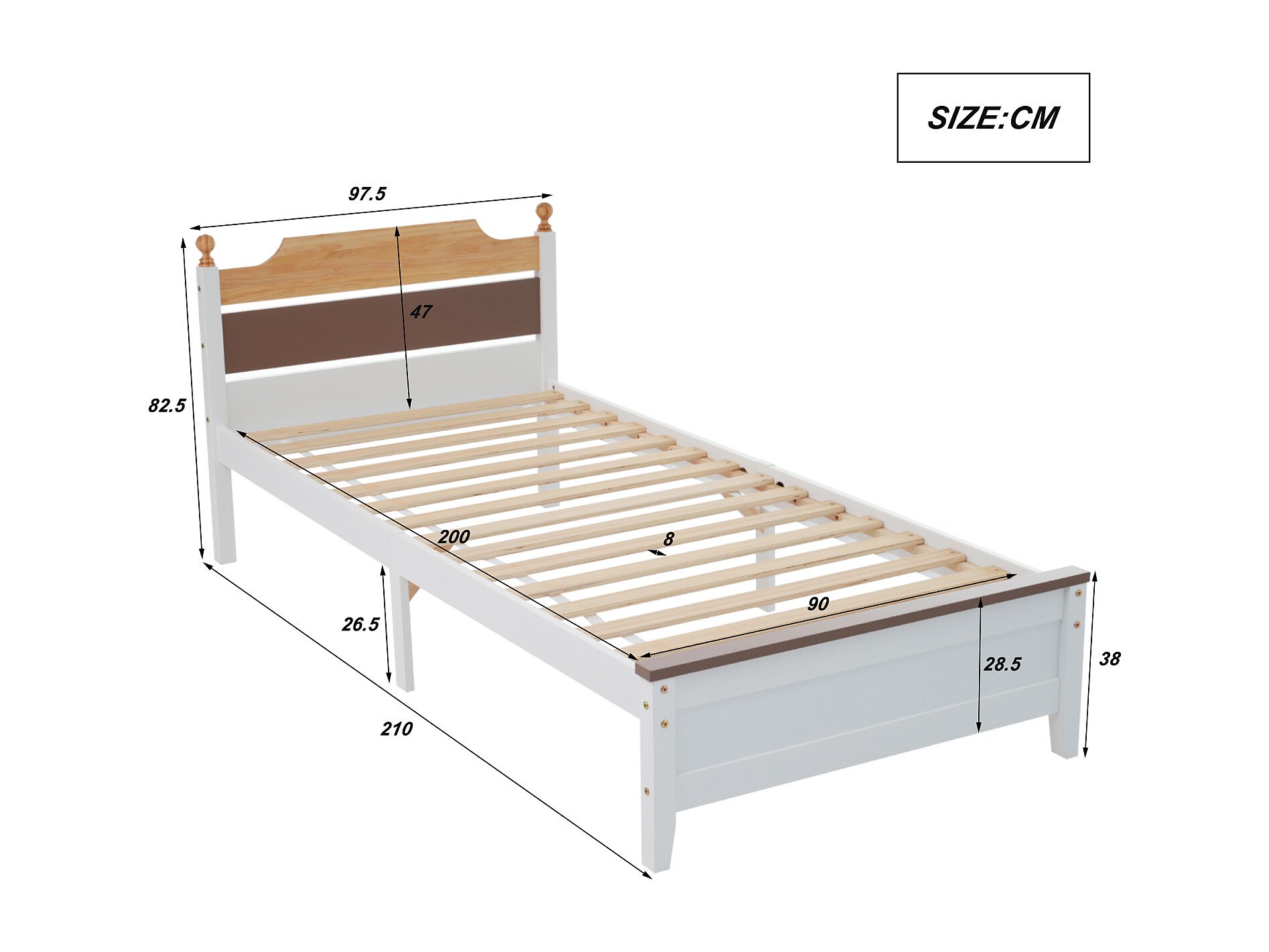 Lit simple en bois, cadre en pin avec pied central, lit junior/adulte, tête et pied de lit en MDF, color blocking, blanc, 90x200 cm
