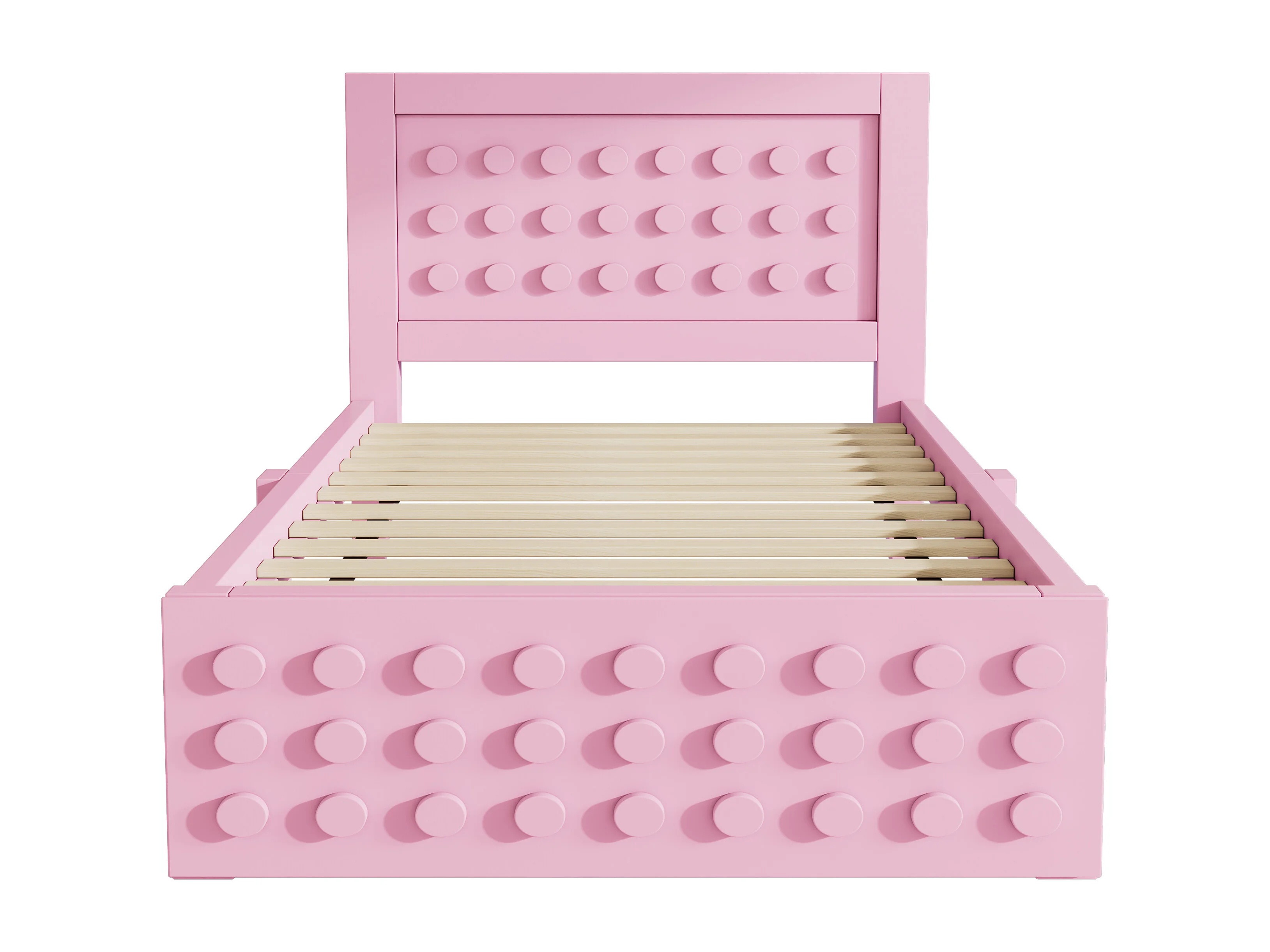 Lit simple en bois rose 90x190 cm, lit enfant, design en blocs, tiroirs, espace de rangement, sans matelas