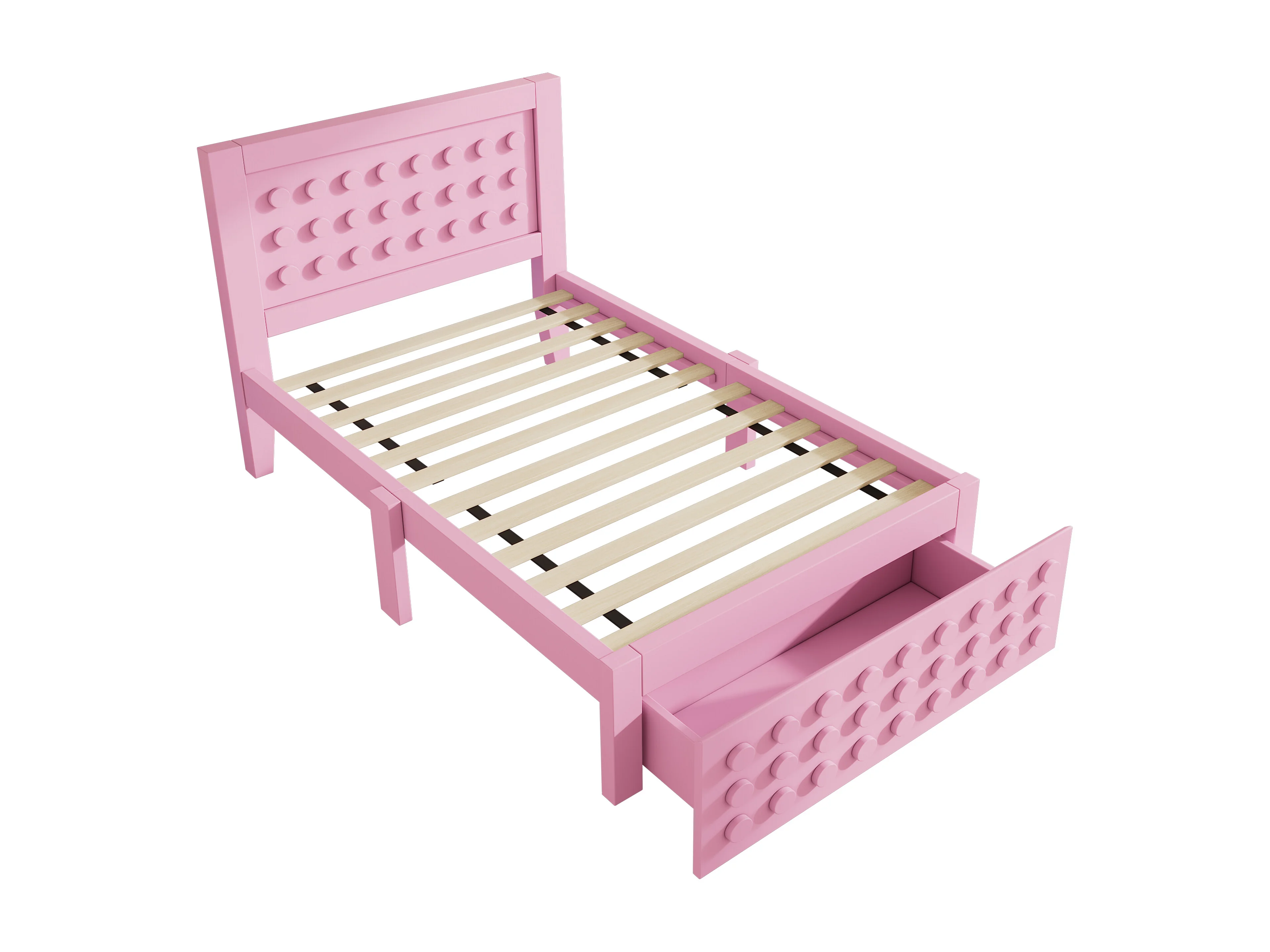 Lit simple en bois rose 90x200 cm, lit enfant, design en blocs, tiroirs, espace de rangement, sans matelas