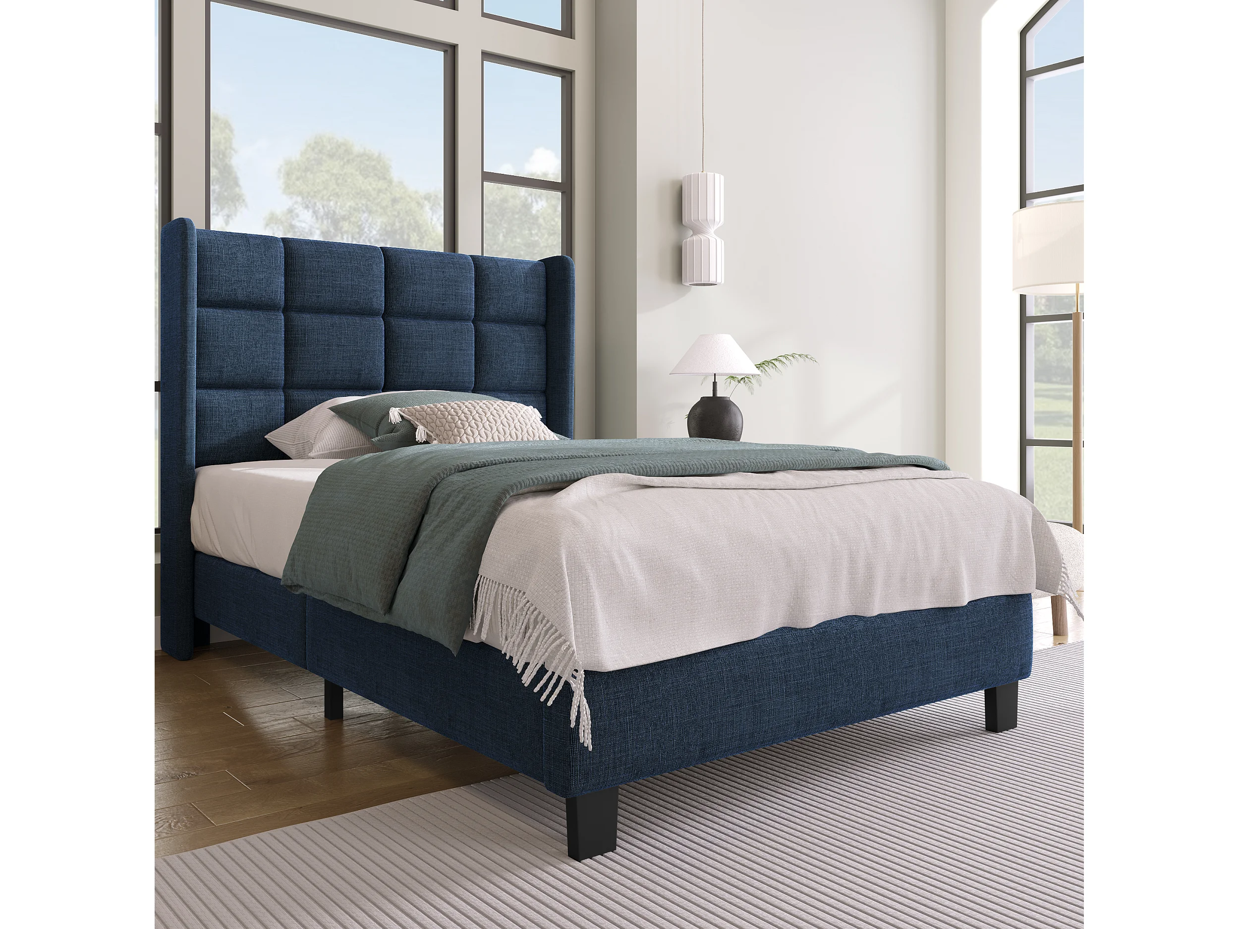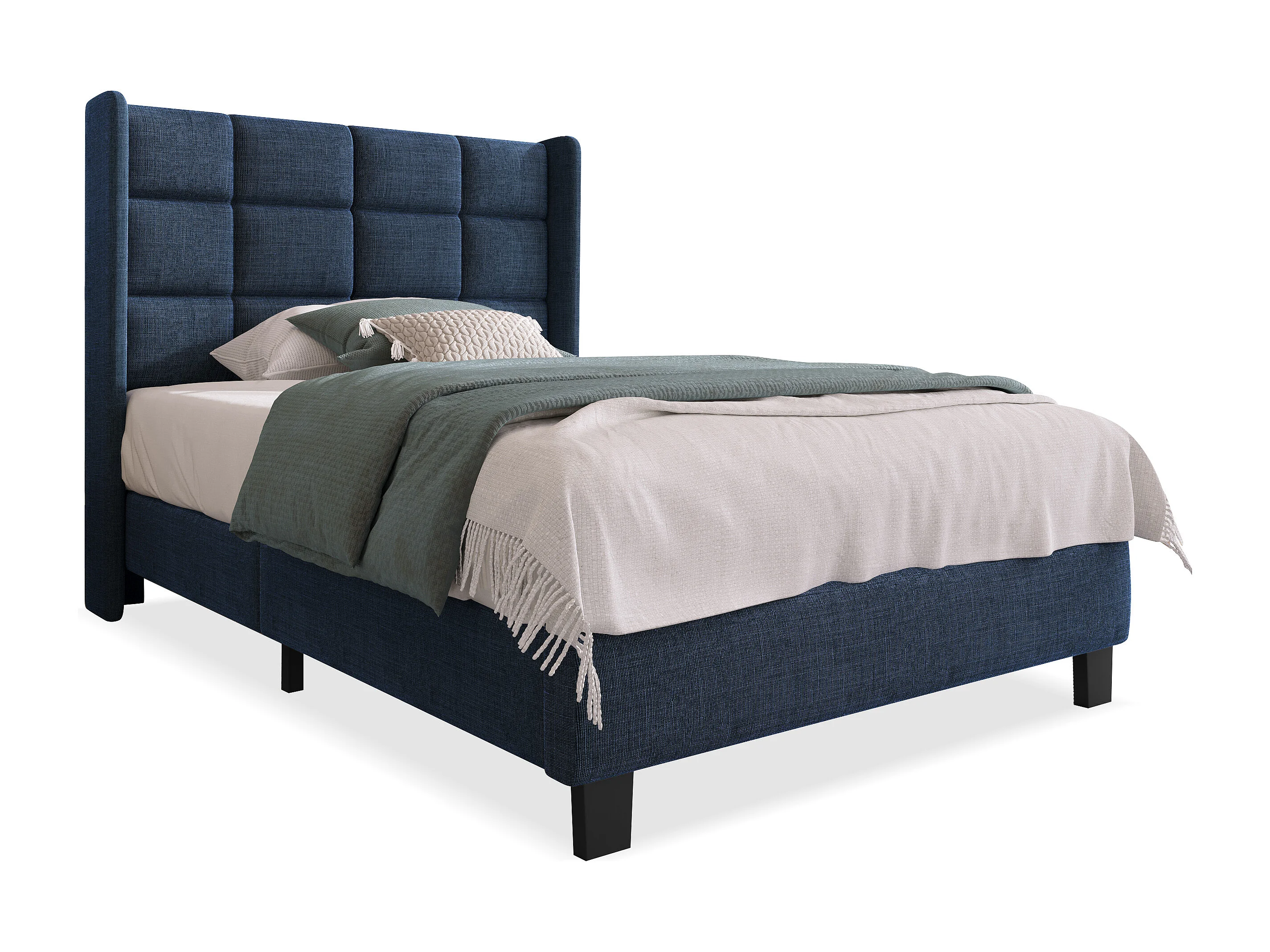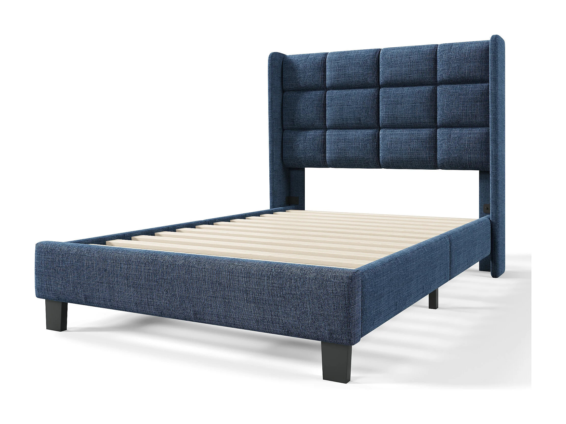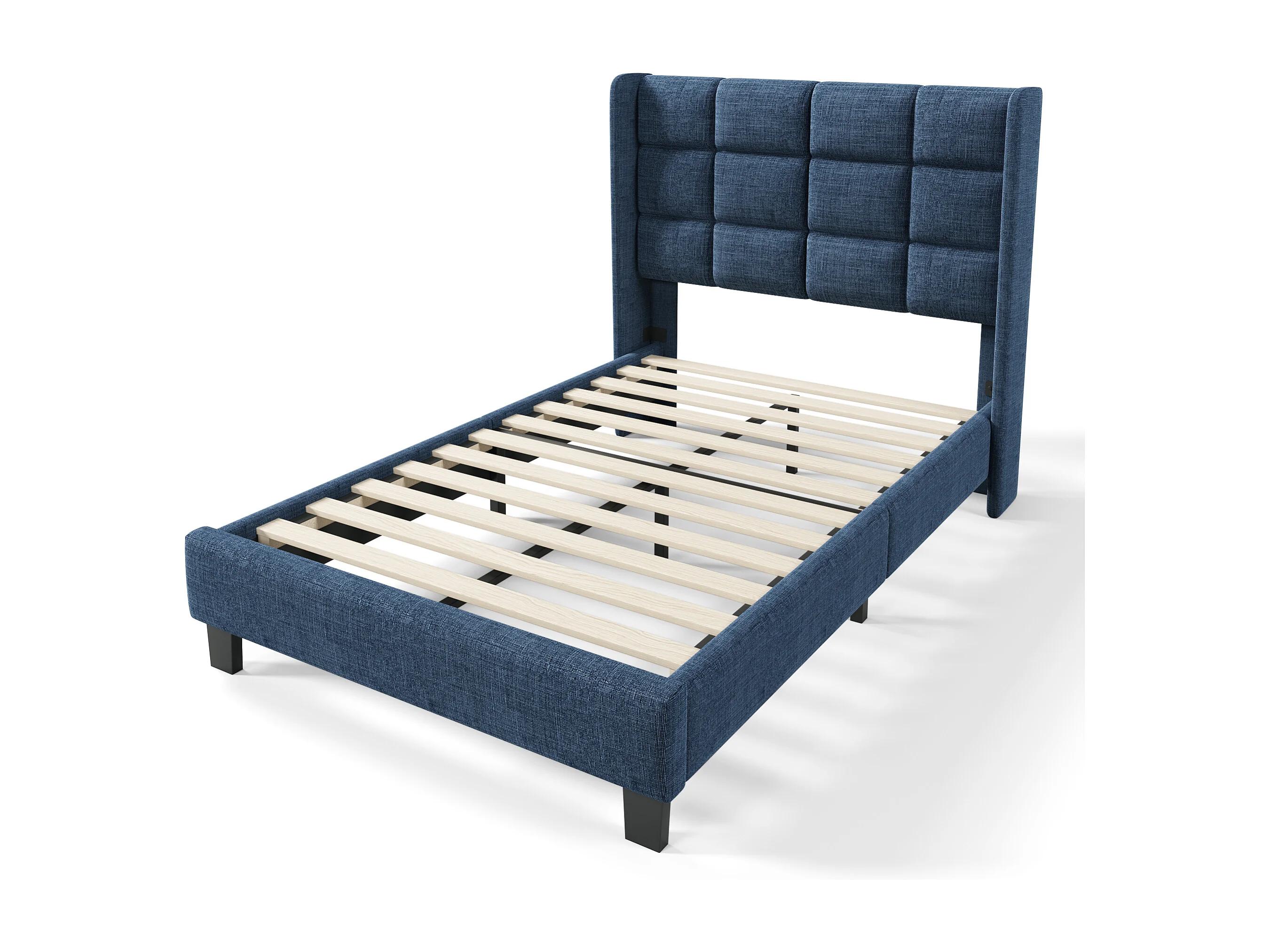 Lit simple en lin bleu 90x200 cm avec tête de lit rembourrée et lattes, design moderne et élégant