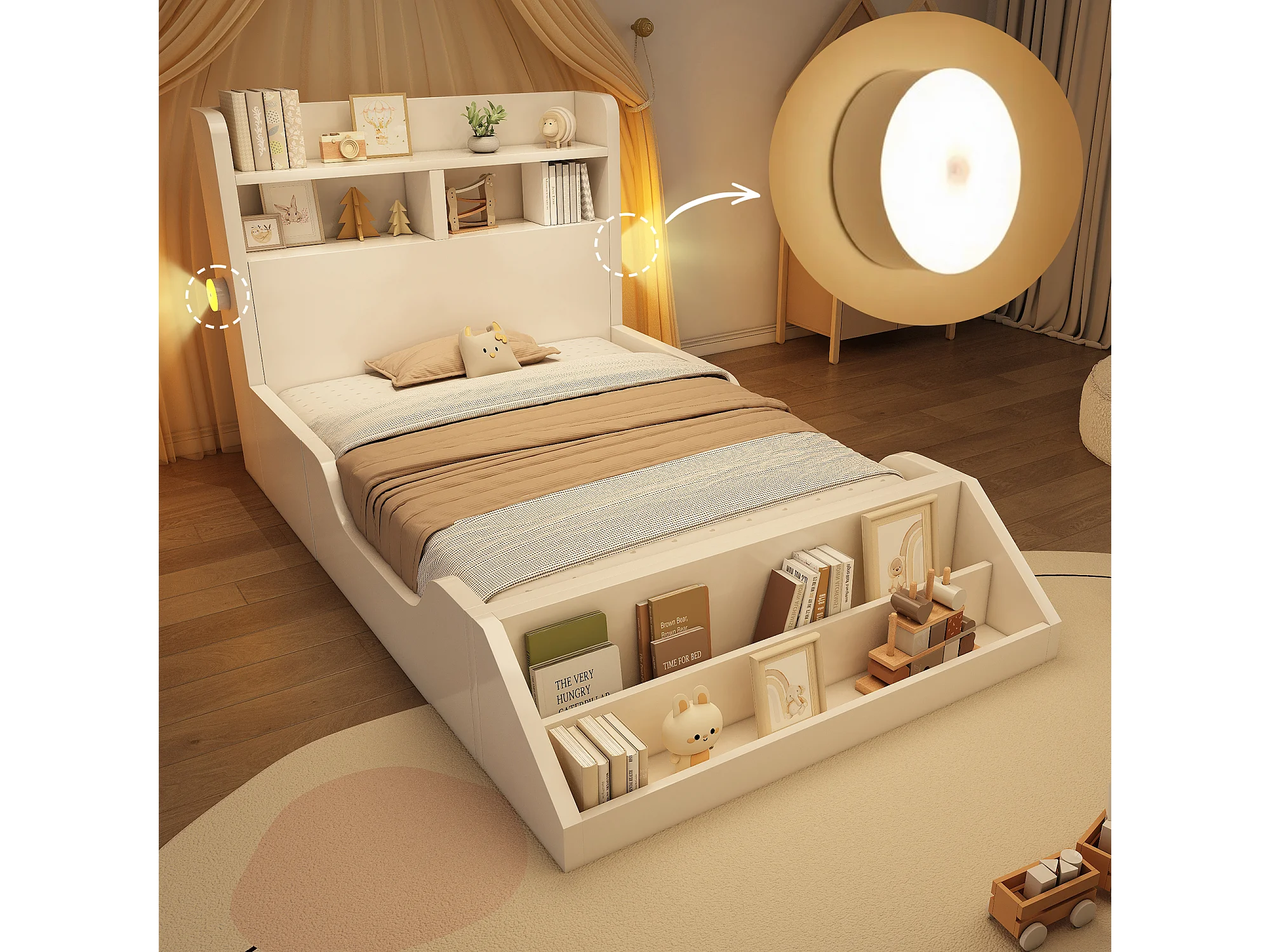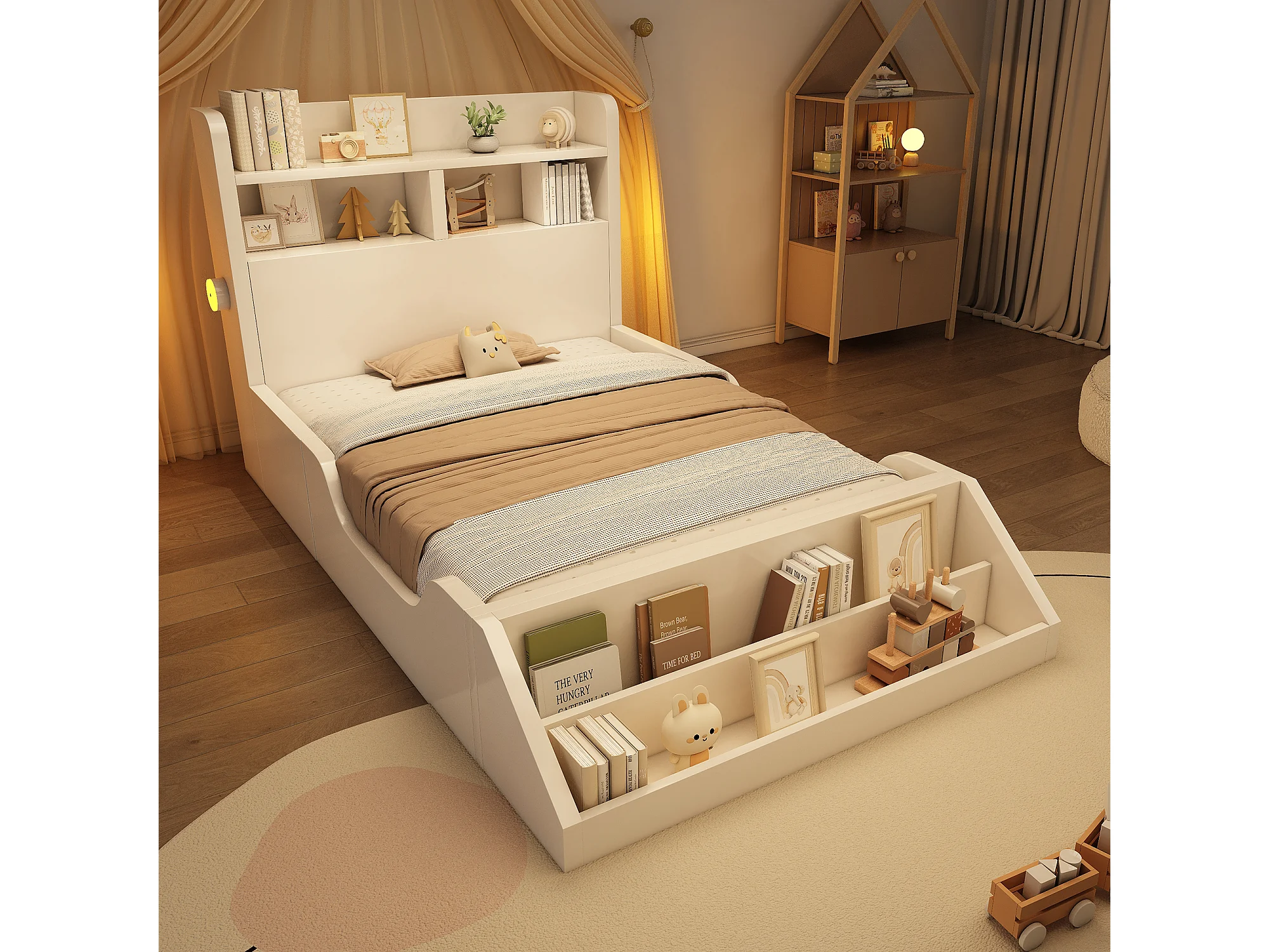 Lit simple enfant - 90 x 200 cm - avec tête de lit de rangement + étagère amovible + sommier à lattes - bois - blanc