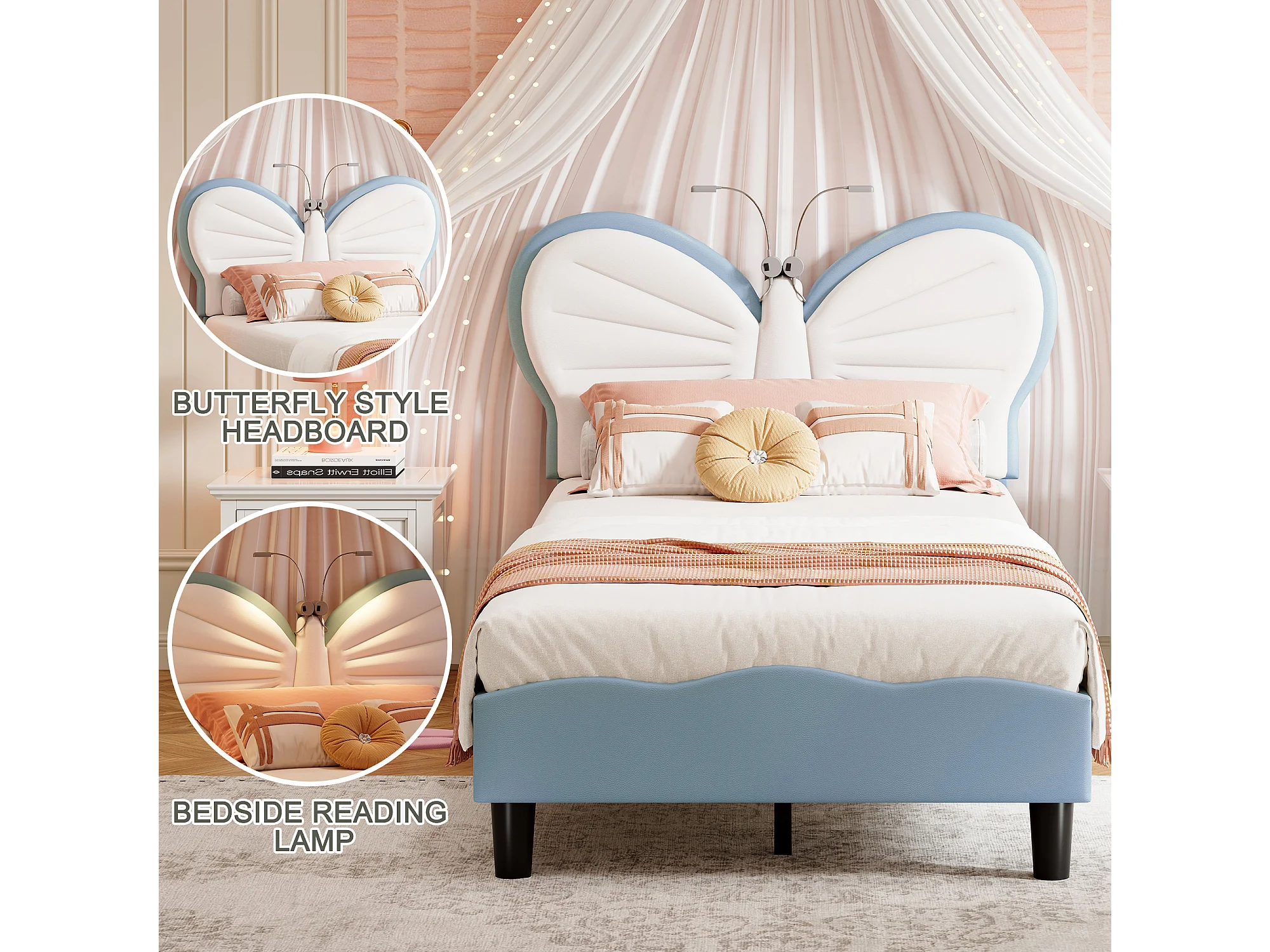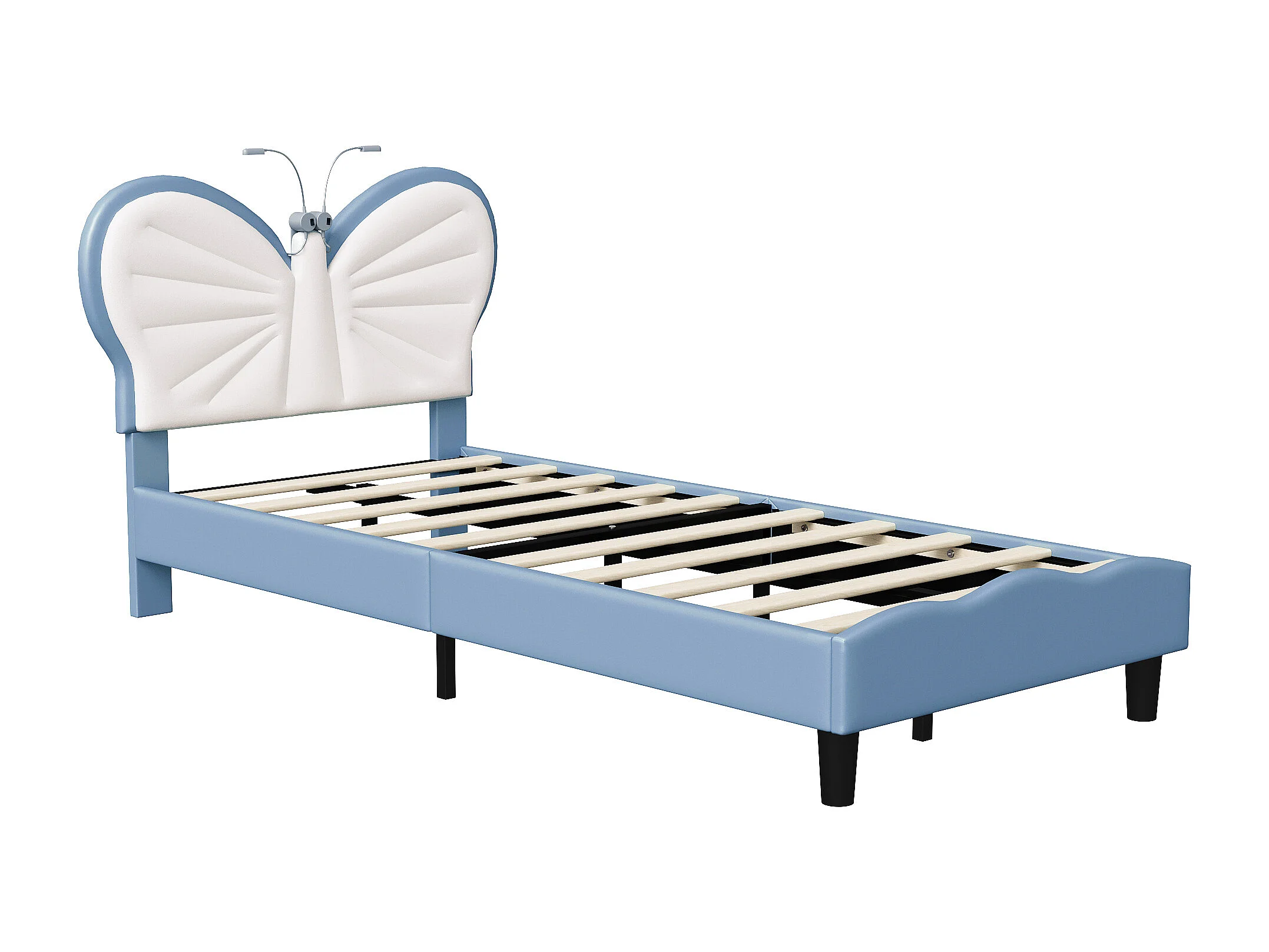 Lit simple enfant 90x190cm avec lampe de lecture - tête de lit papillon réglable - velours - bleu