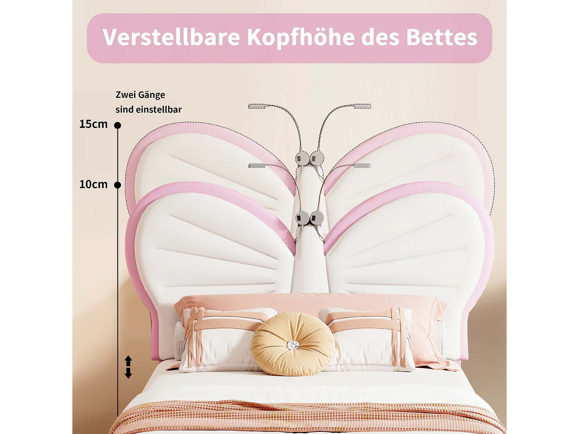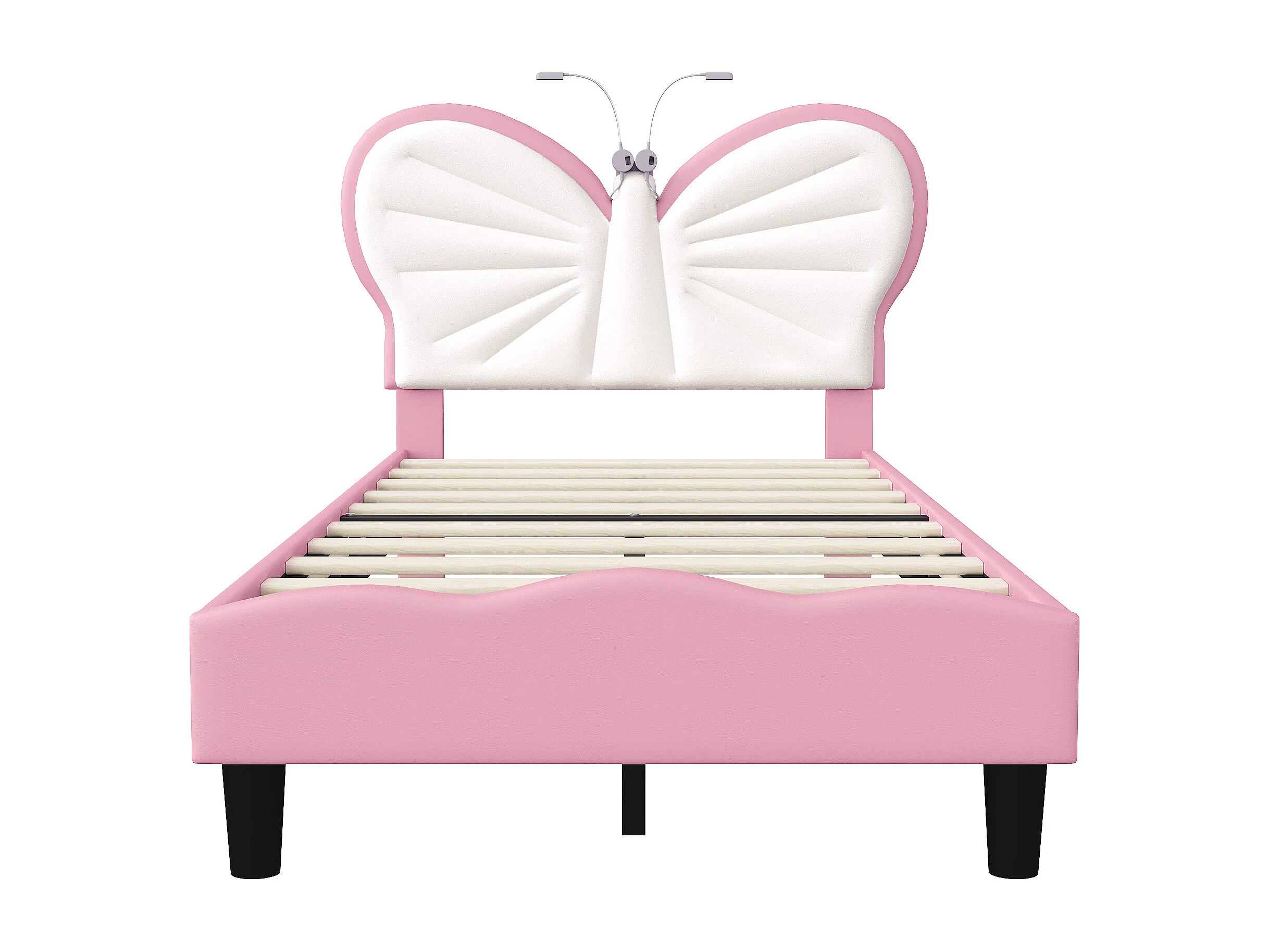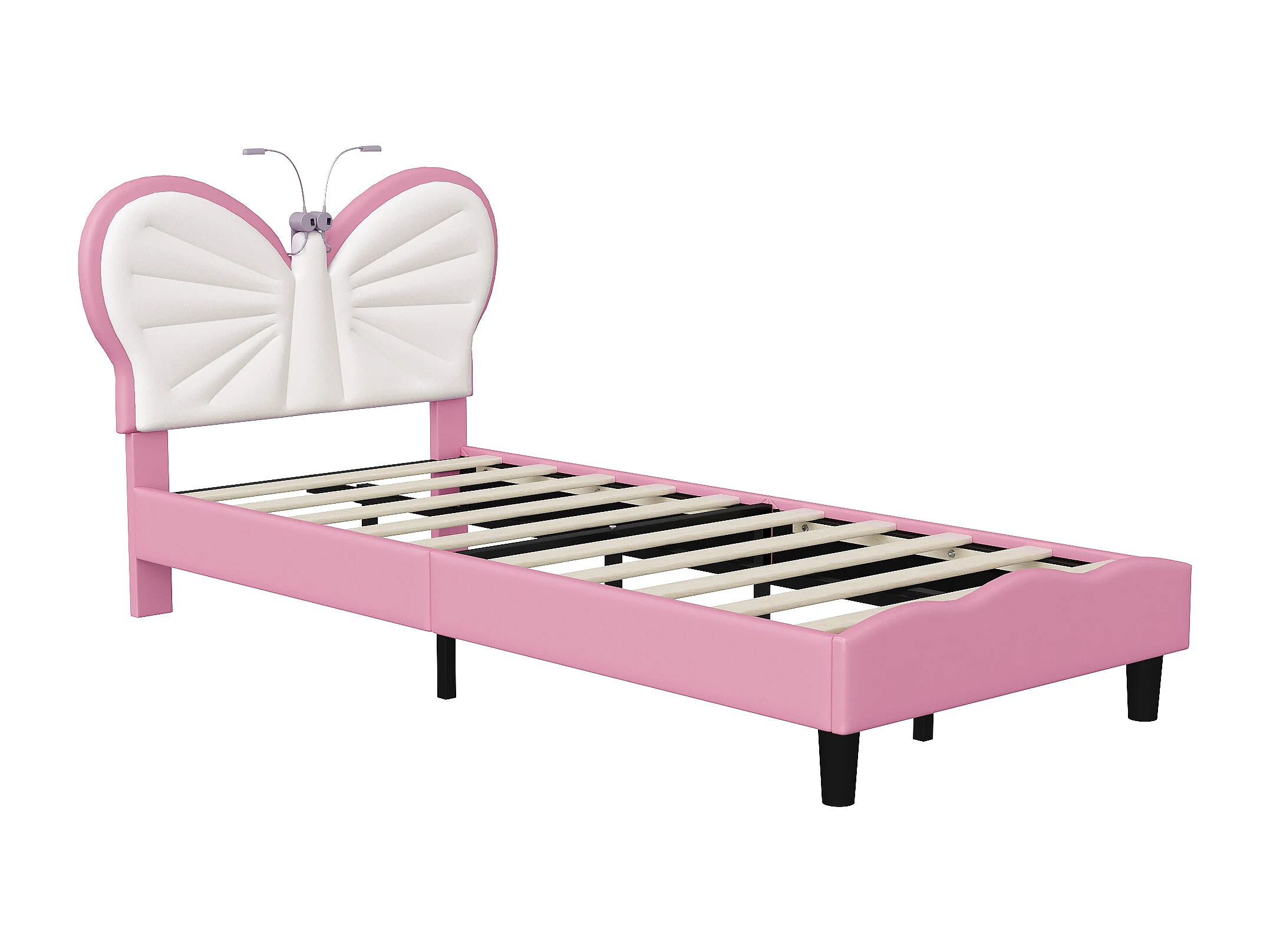 Lit simple enfant 90x190cm avec lampe de lecture - tête de lit papillon réglable - velours - rose