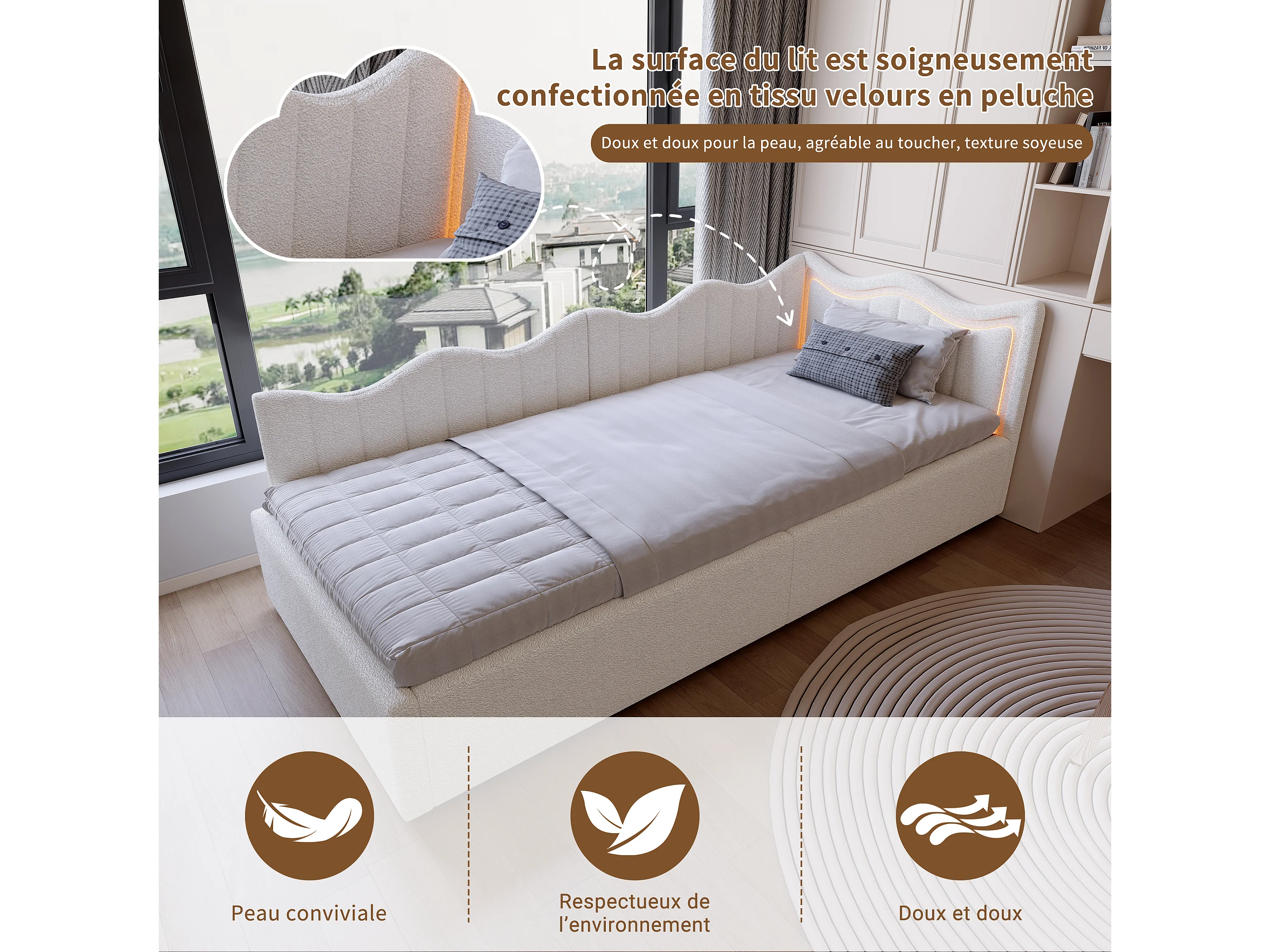 Lit simple enfant 90x200cm - avec éclairage LED et espace de rangement hydraulique - velours - blanc