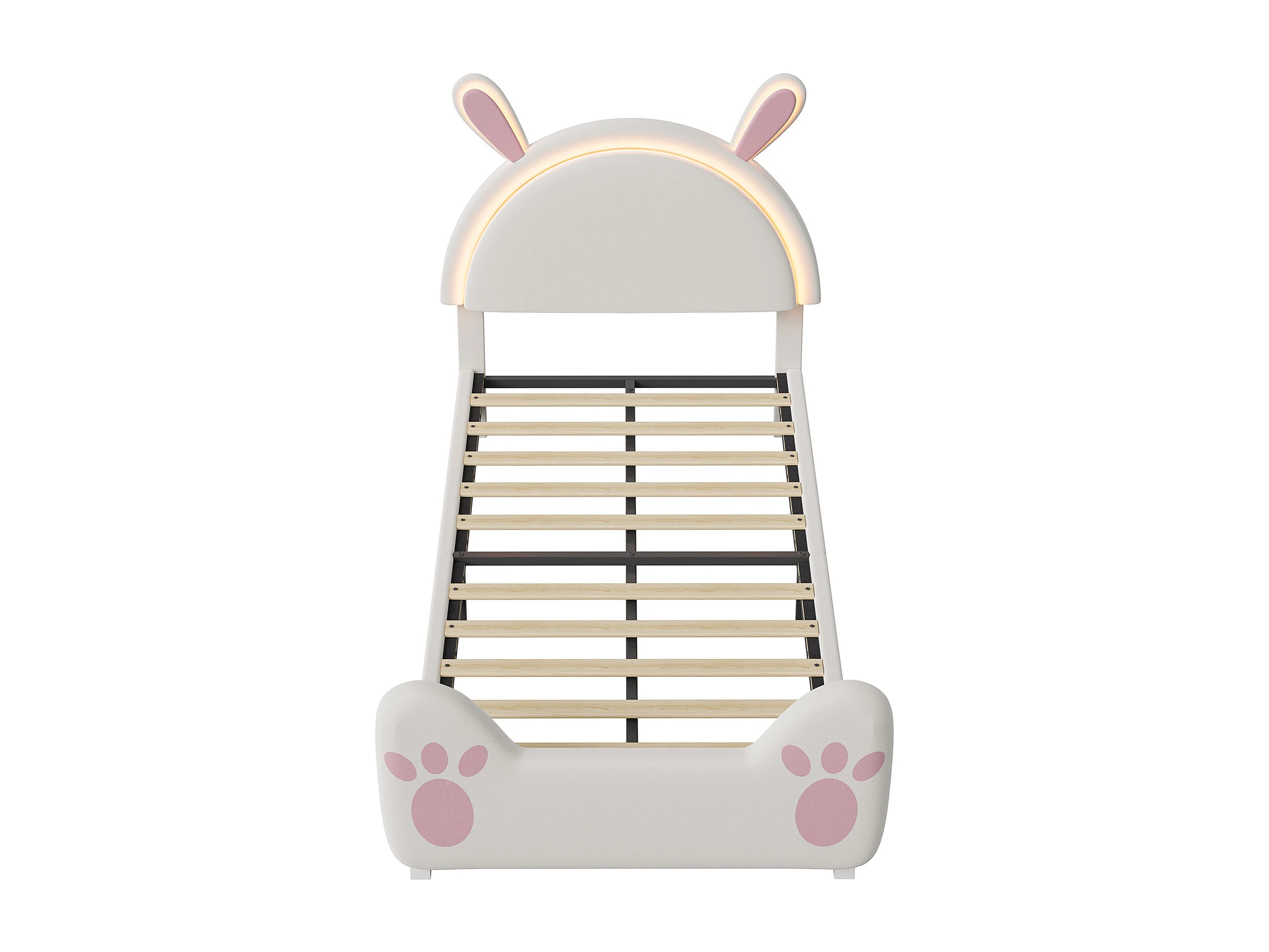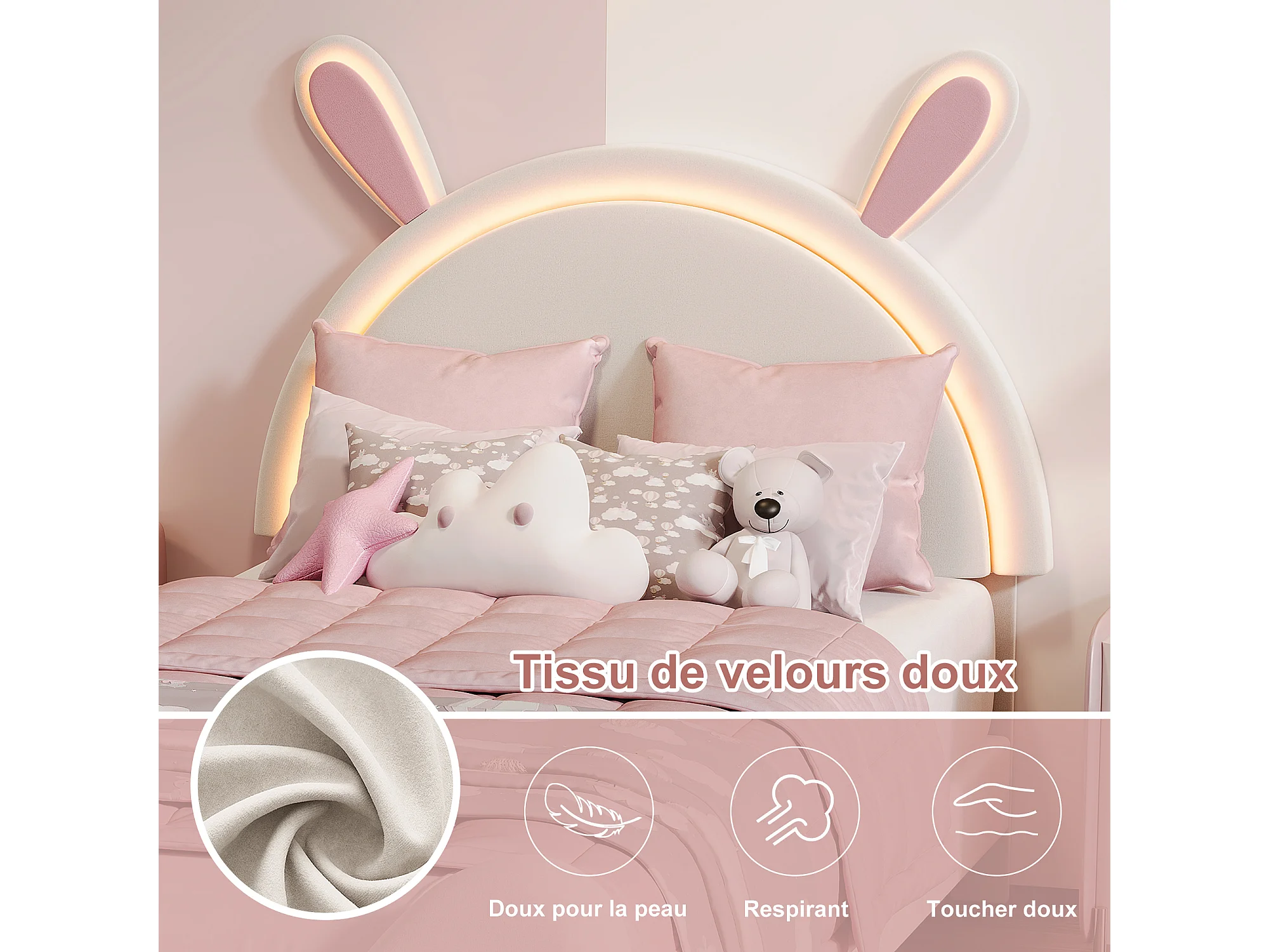 Lit simple enfant 90x200cm avec lumières LED - tête de lit oreilles de lapin - velours - blanc