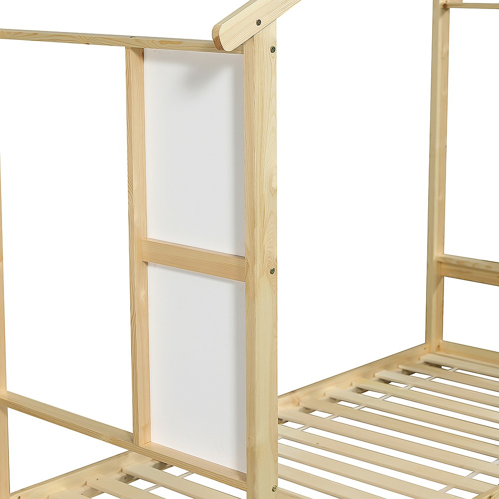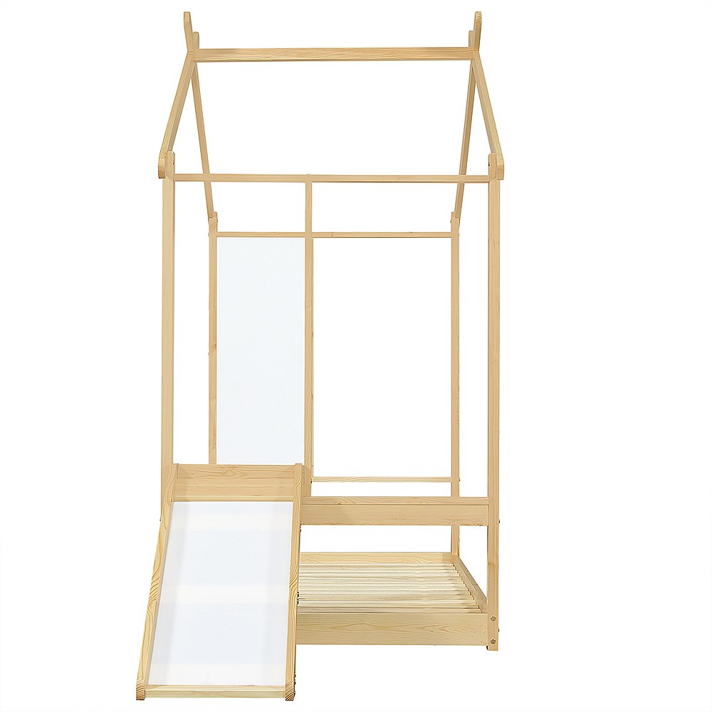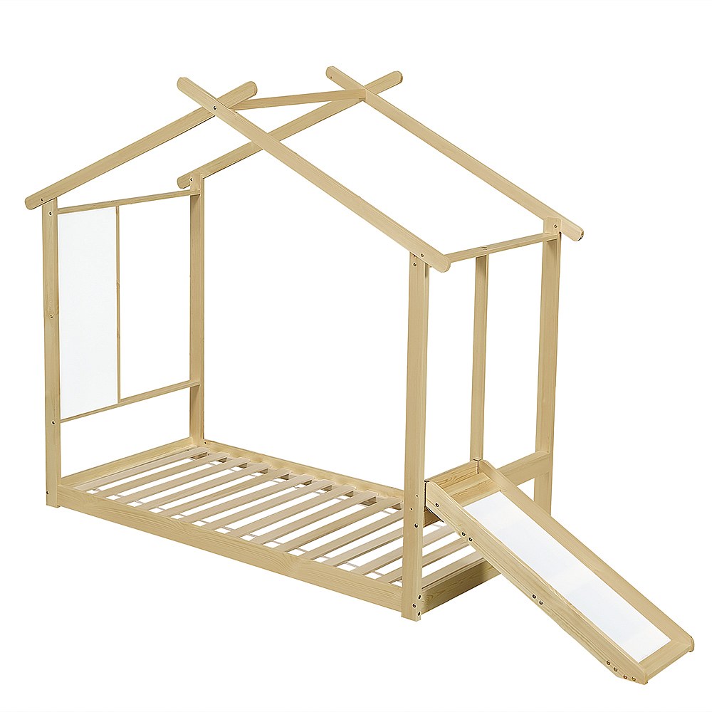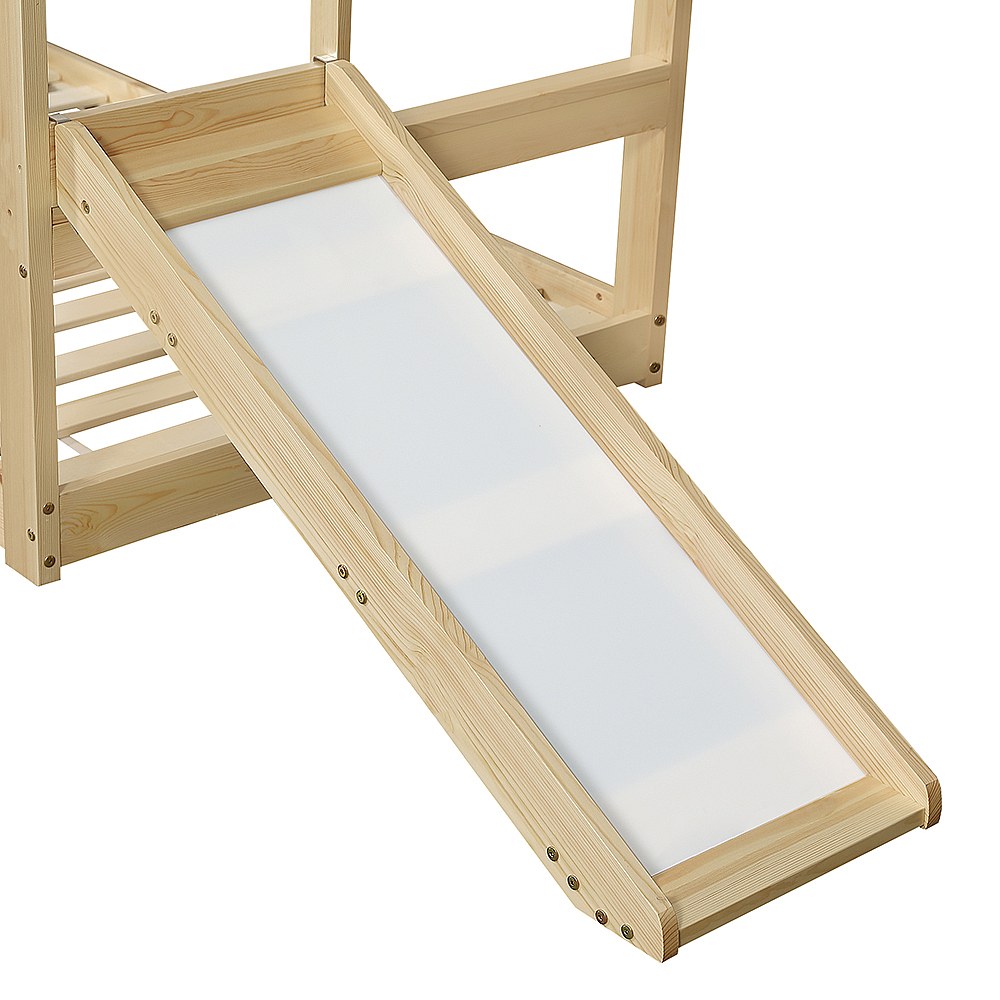 Lit simple enfant 90x200cm, avec toboggan, planches blanches, beau design de toit, pin + MDF + contreplaqué, couleur naturelle