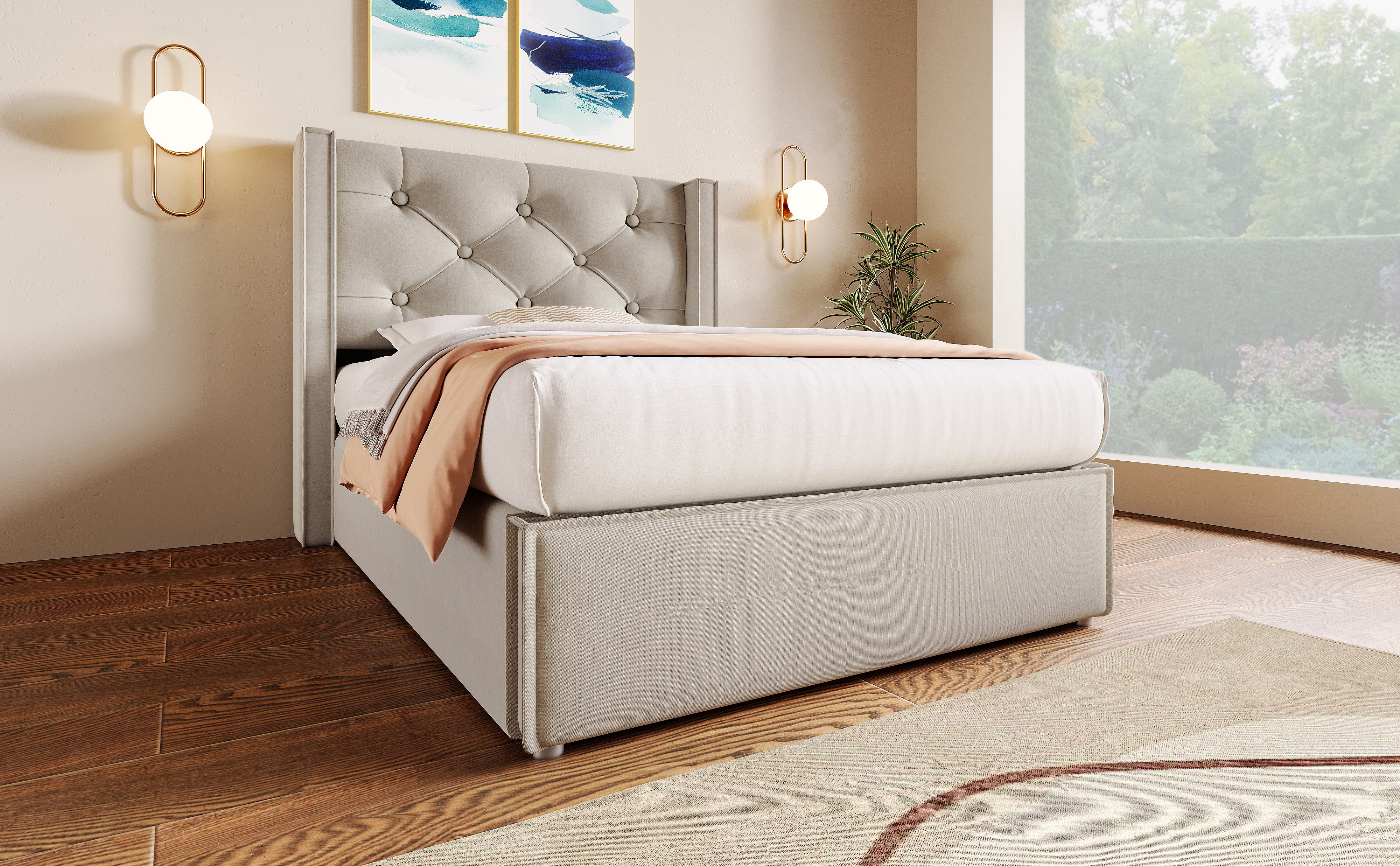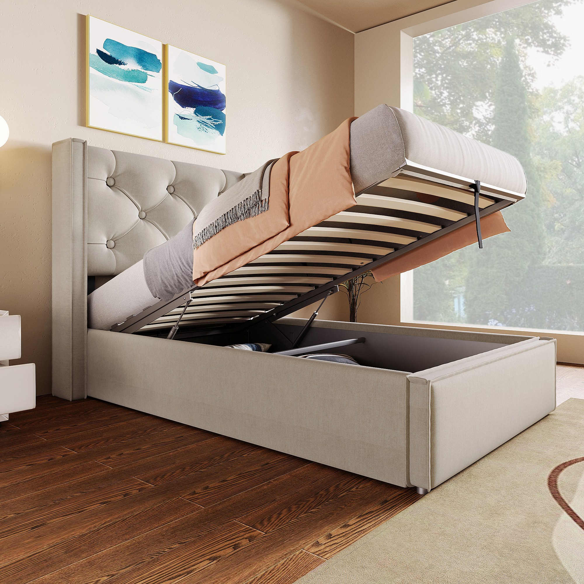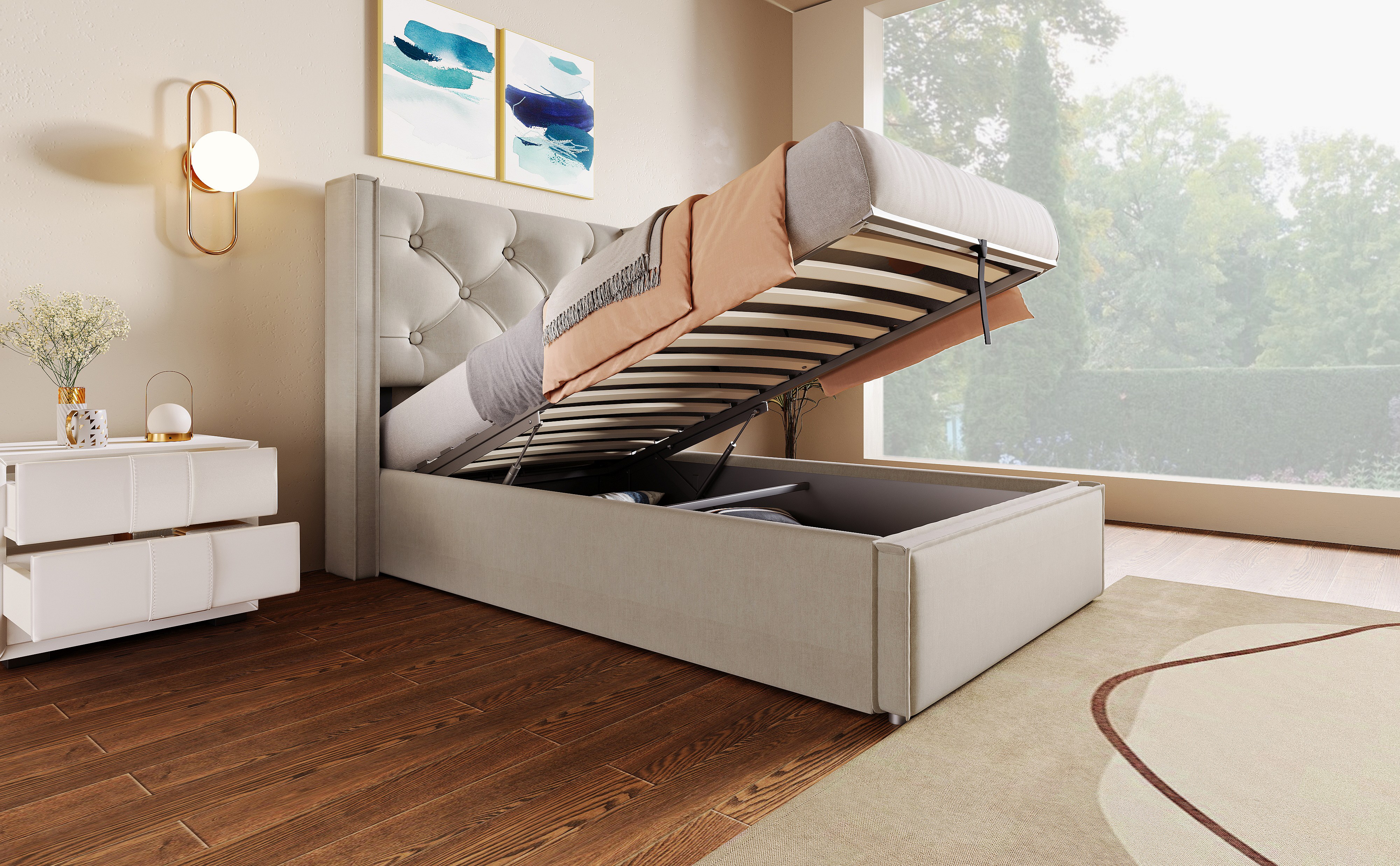 Lit simple hydraulique 90x200 cm, en coton gris clair, avec sommier à lattes et espace de rangement