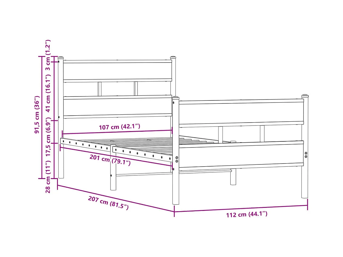 Lit simple | Lit adulte, enfant | Cadre de lit en métal chêne marron 107x203 cm